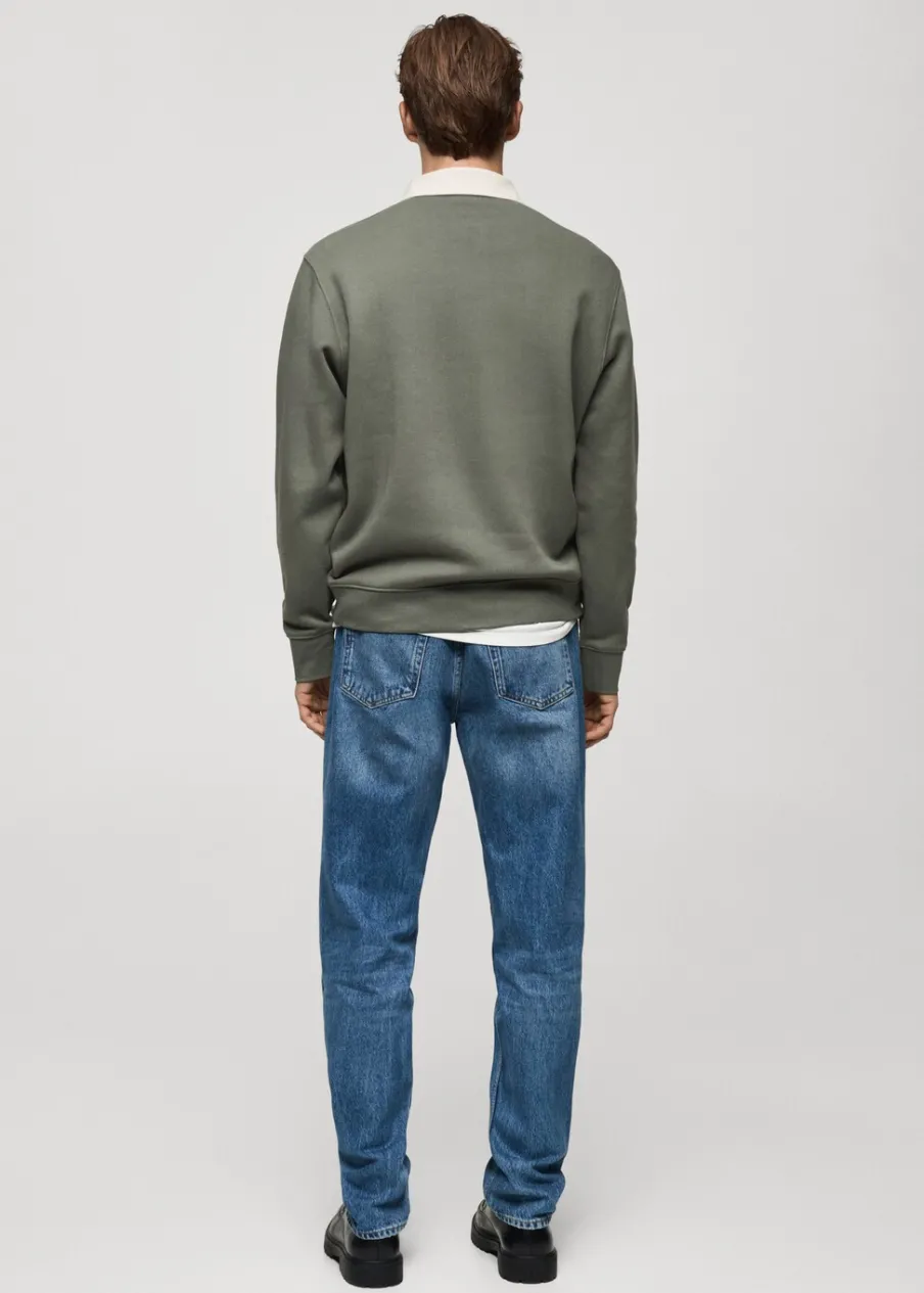 Regular fit, 100% Pamut, sportpulóver anyag, póló gallér, elöl nyomtatott minta, passzés mandzsetta és alj, a modell testmagassága 185 cm és M-es méretet visel.