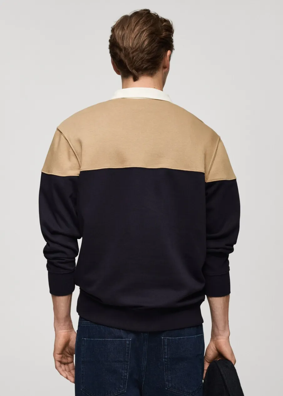 Krój regular. Tkanina bawełniana. Kołnierzyk polo z zapięciem na guziki. Dwukolorowy deseń. Mankiety i dół wykończone ściągaczem. Model ma 185 cm wzrostu i nosi rozmiar M.