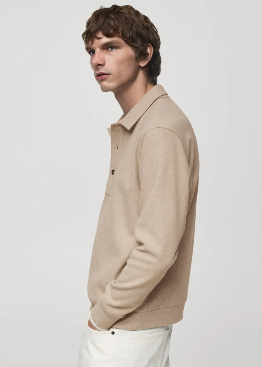 Krój regular. Dzianina dresowa. Materiały z recyklingu. Kołnierzyk polo z zapięciem na guziki. Długi rękaw. Mankiety i dół wykończone ściągaczem. Prosty dół. Model ma 190 cm wzrostu i nosi rozmiar M.