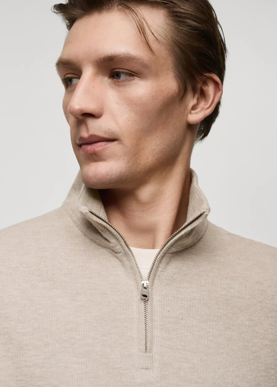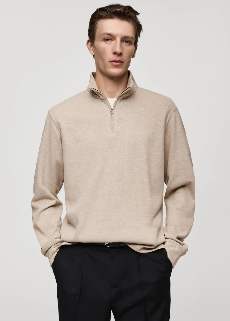 Tkanina z mieszanki bawełny i poliestru pochodzącej z recyklingu. Krój regular. Kominowy kołnierz zapinany na suwak. Długi rękaw. Prosty dół. Model ma 190 cm wzrostu i nosi rozmiar M.