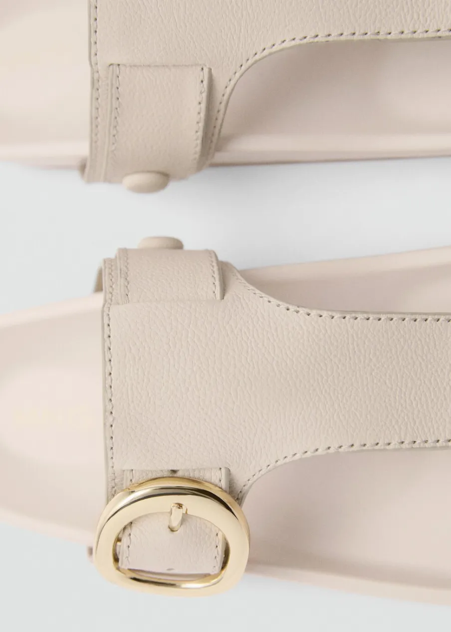 100% skóra bydlęca. Płaska podeszwa. Rozporek z przodu. Bez zapięcia. Ozdobna klamra. Model z paskiem między palcami.