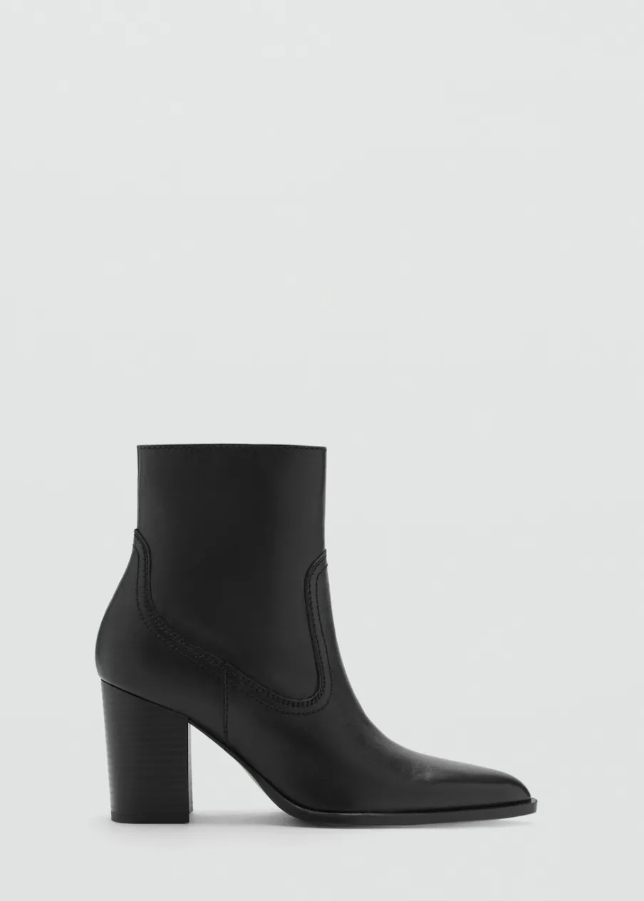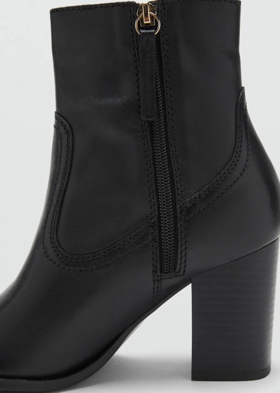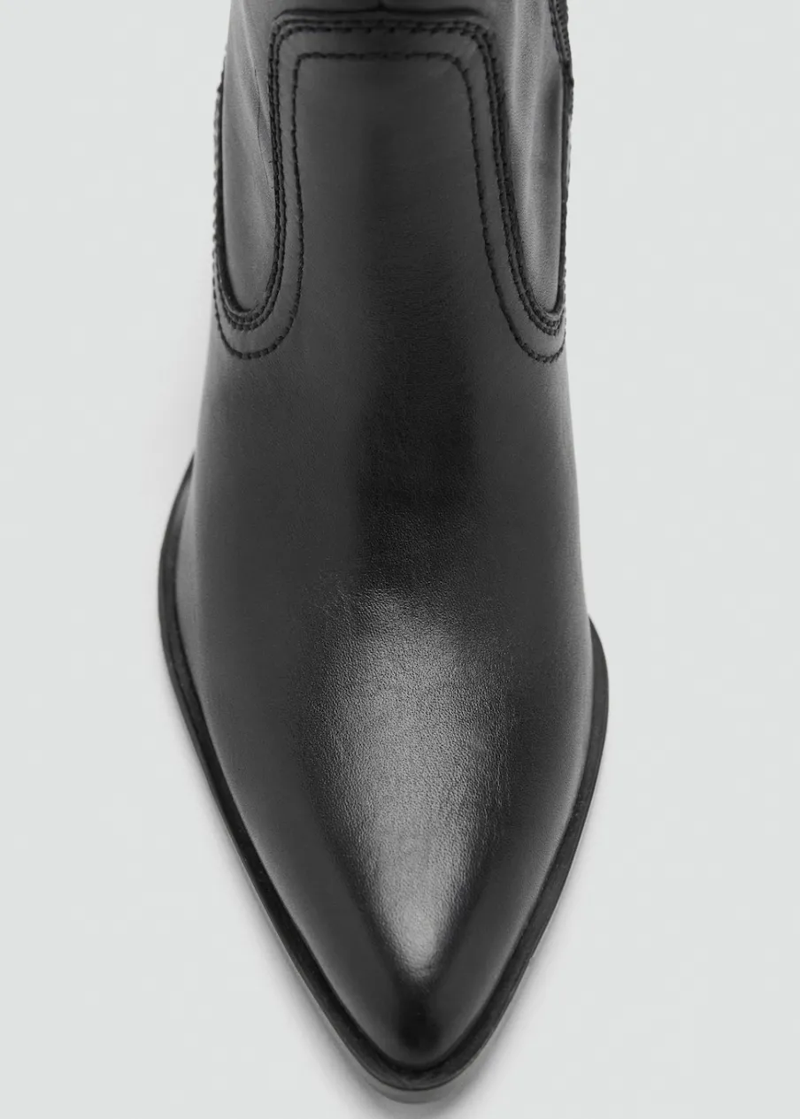 100% skóra bydlęca. Obcas klockowy. Spiczaste zakończenie. Obcas mierzy 8 cm. Boczne zapięcie na suwak. W kowbojskim stylu.