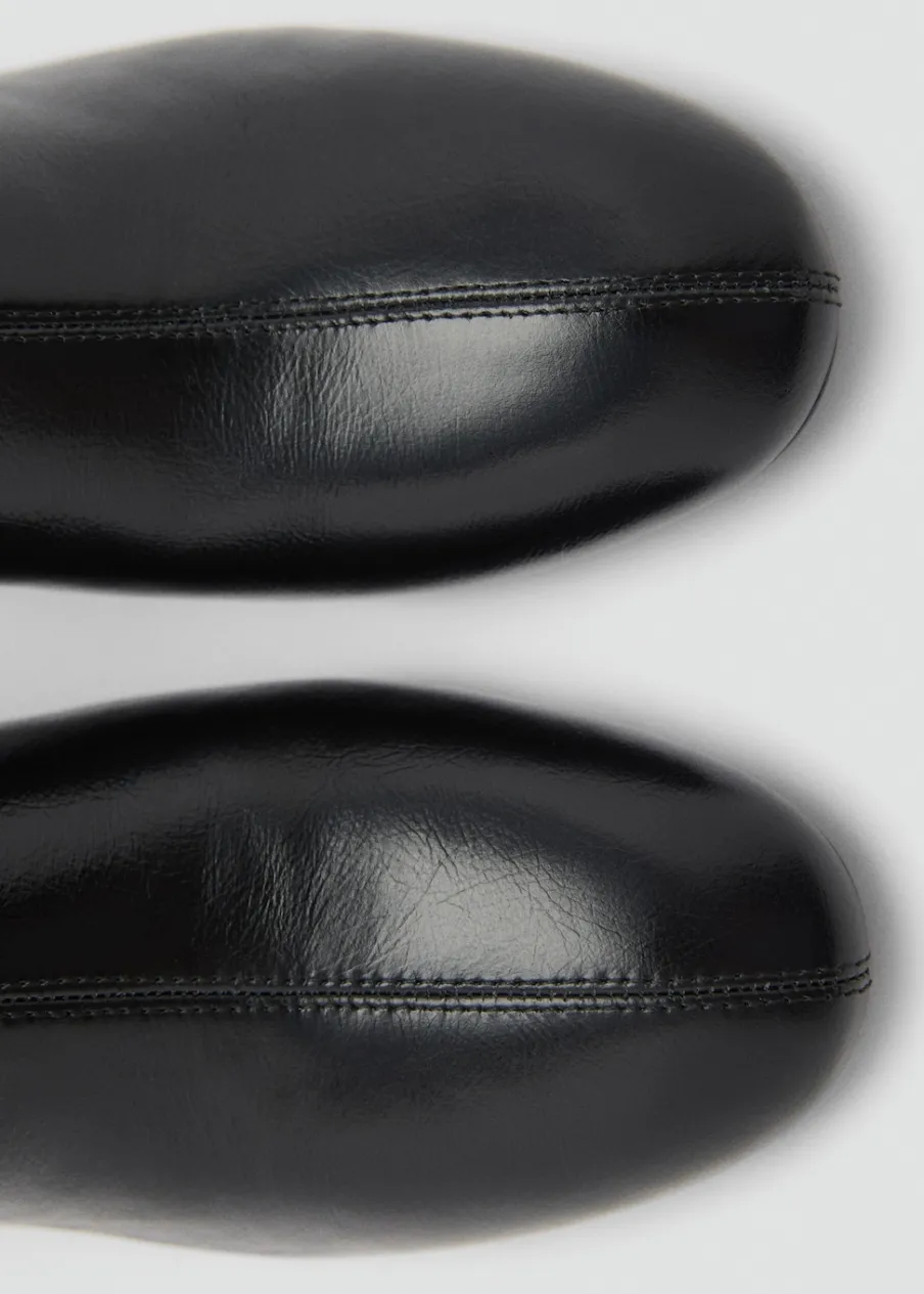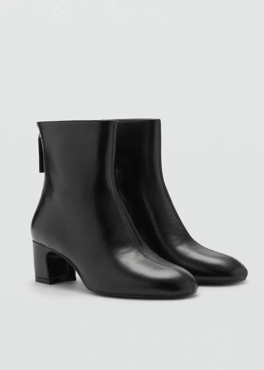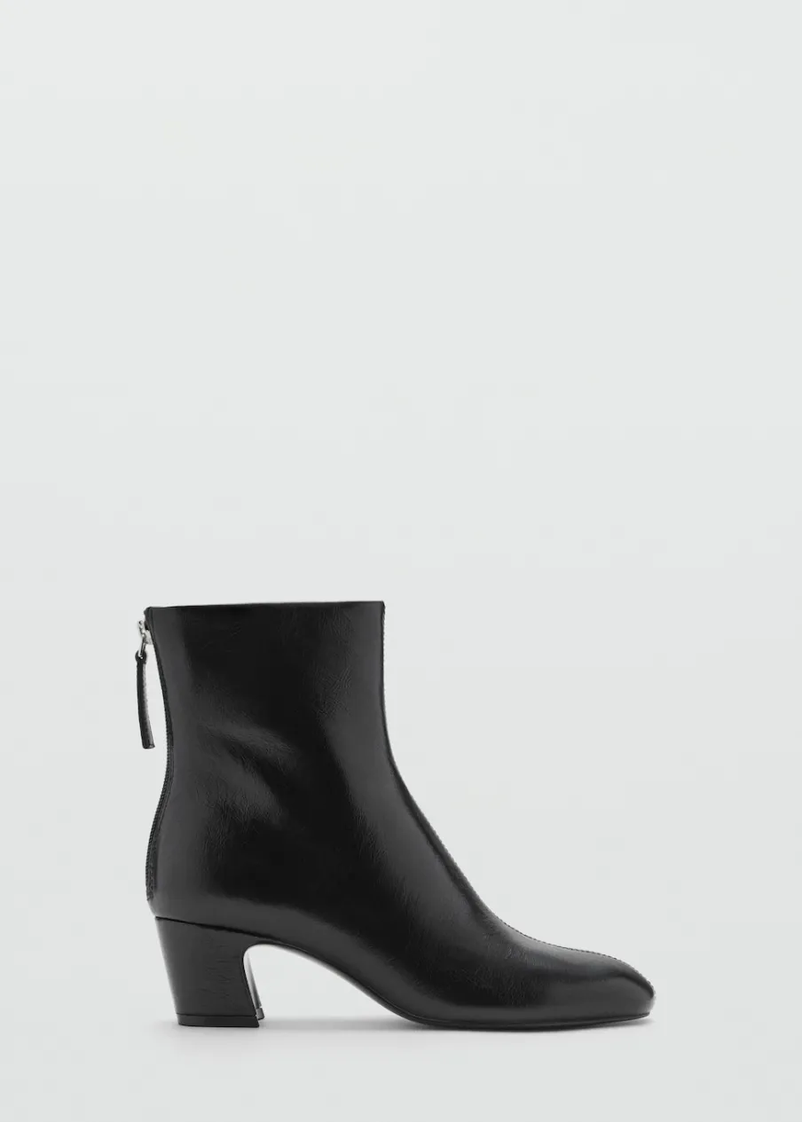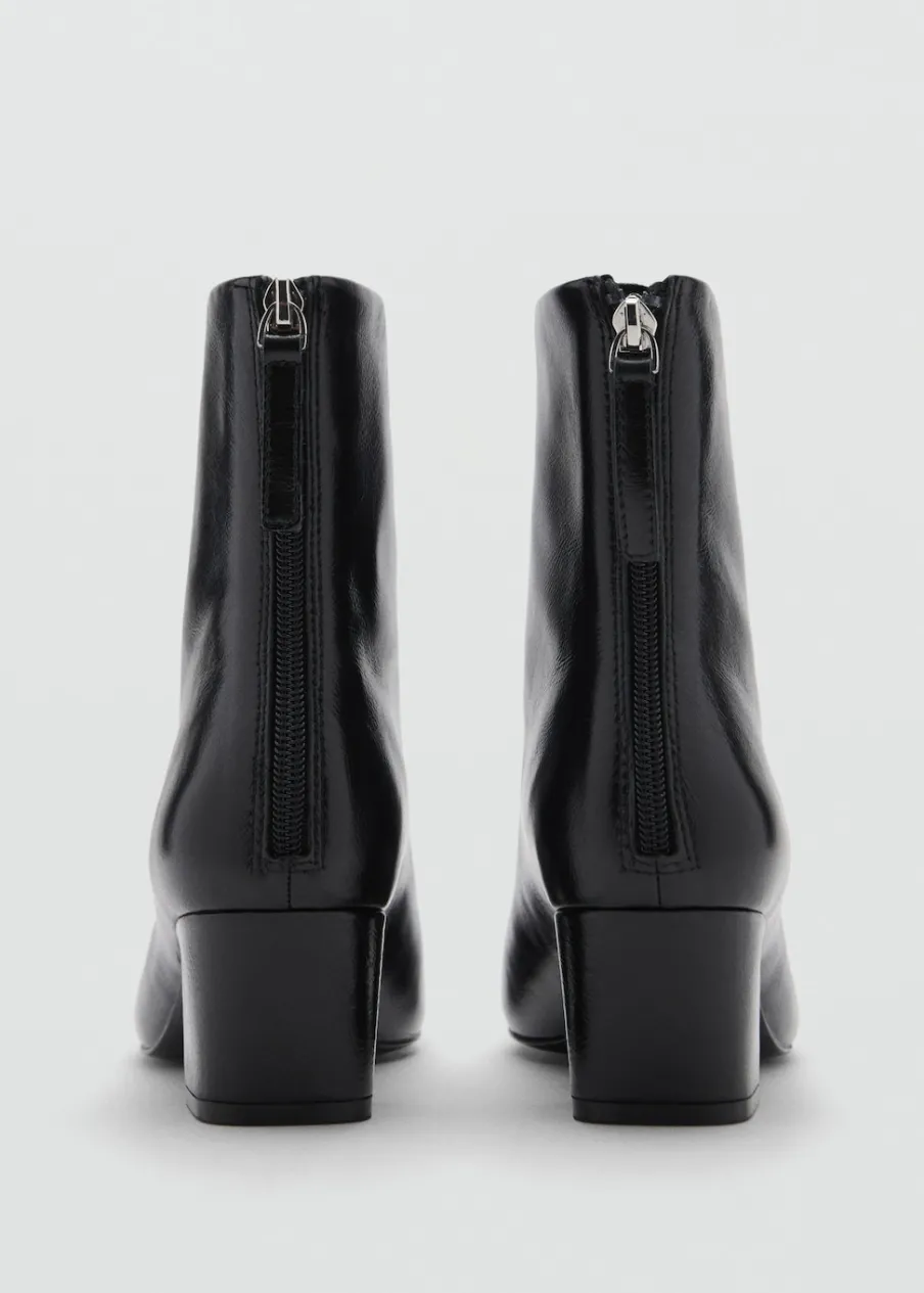 Skóra bydlęca. Okrągły nosek. Obcas klockowy. Zapięcie z tyłu na suwak. Wewnętrzna podszewka. Obcas mierzy 5 cm.