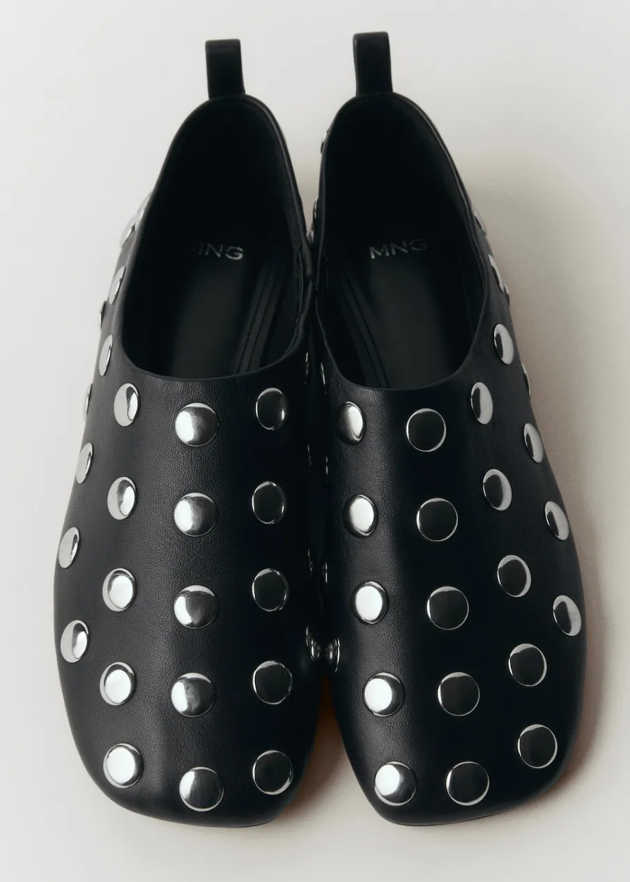 Płaska podeszwa. Okrągły nosek. Ozdobne ćwieki. 100% skóra kozia.