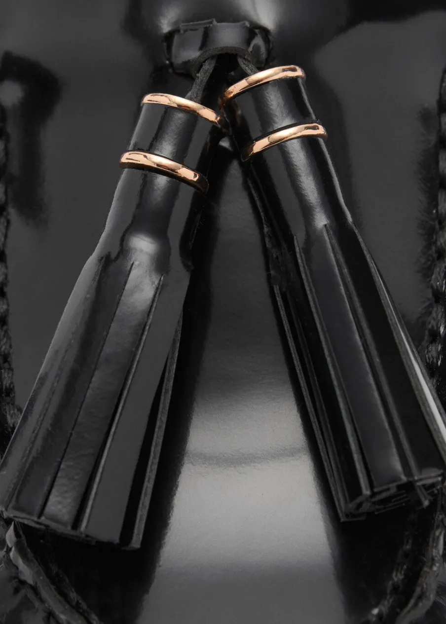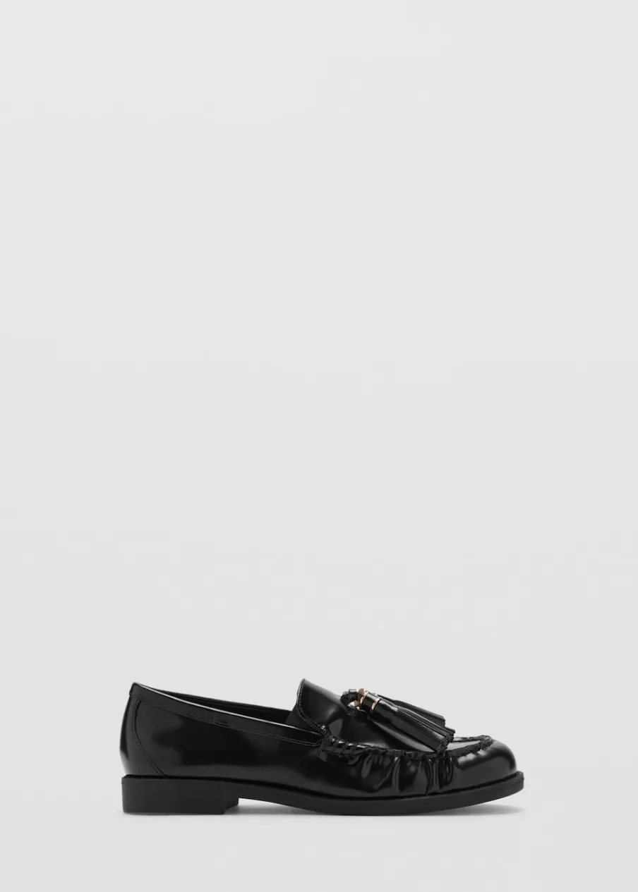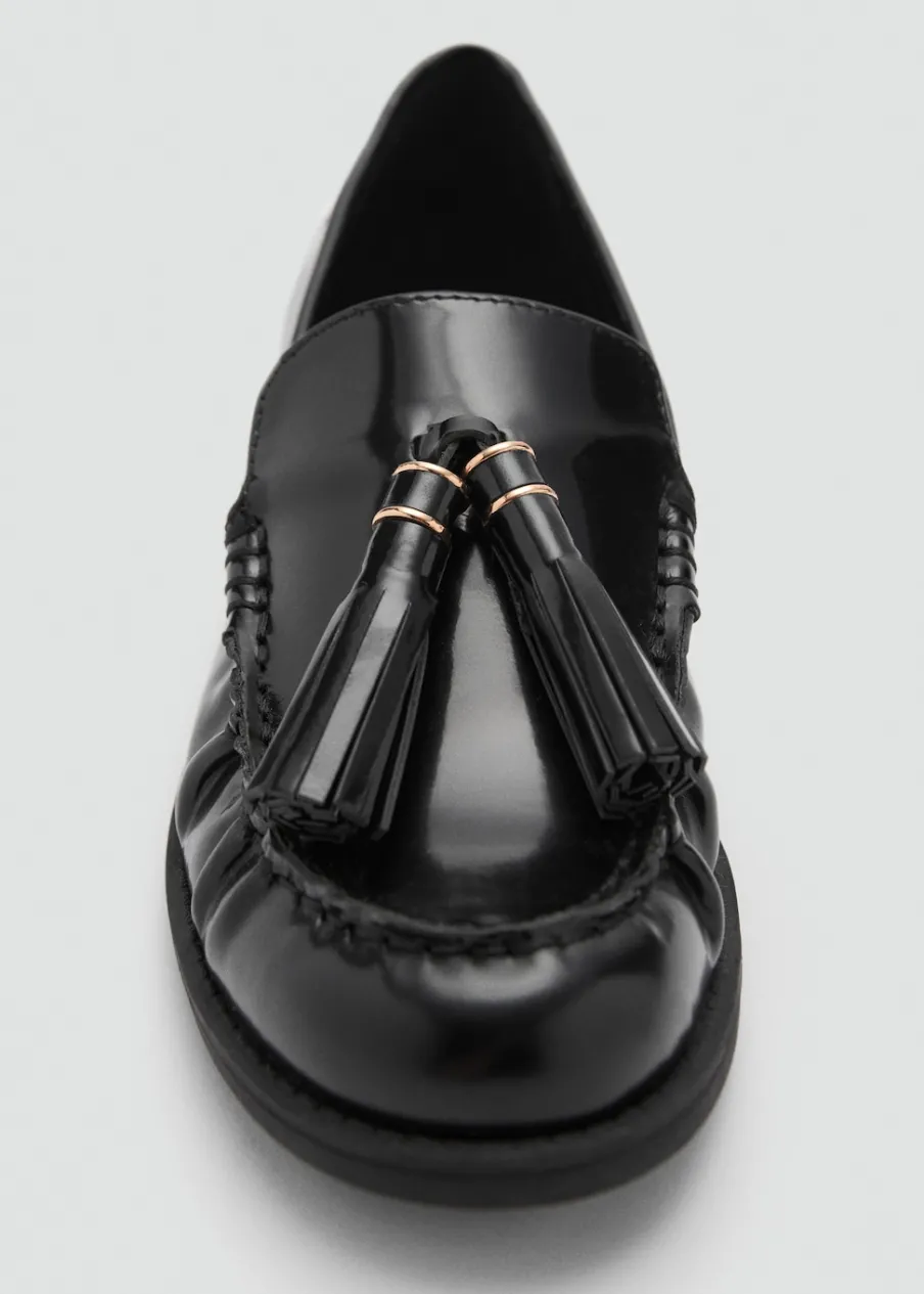 100% skóra bydlęca. Okrągły nosek. Płaska podeszwa. Bez zapięcia. Ozdoba z frędzli. Wewnętrzna podszewka.