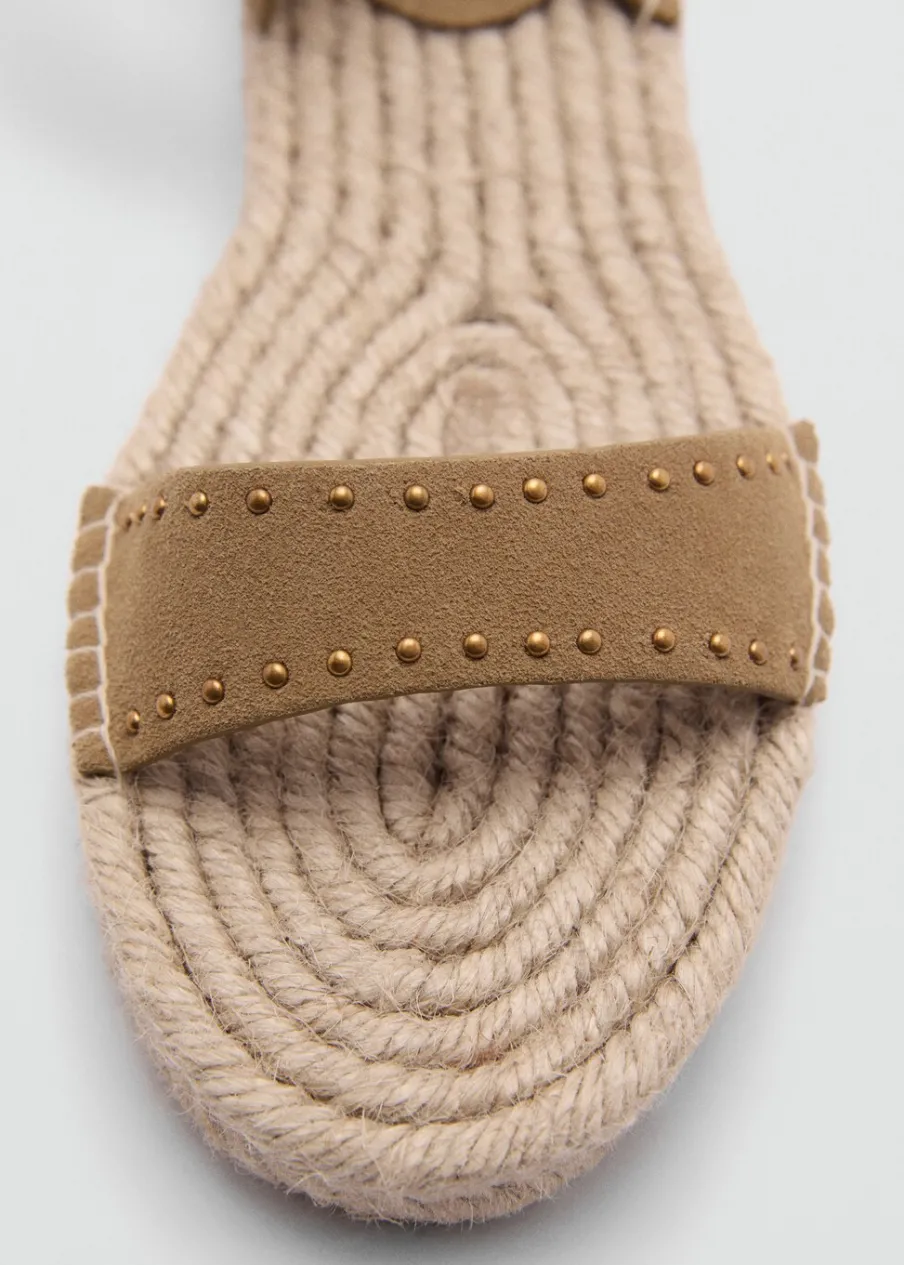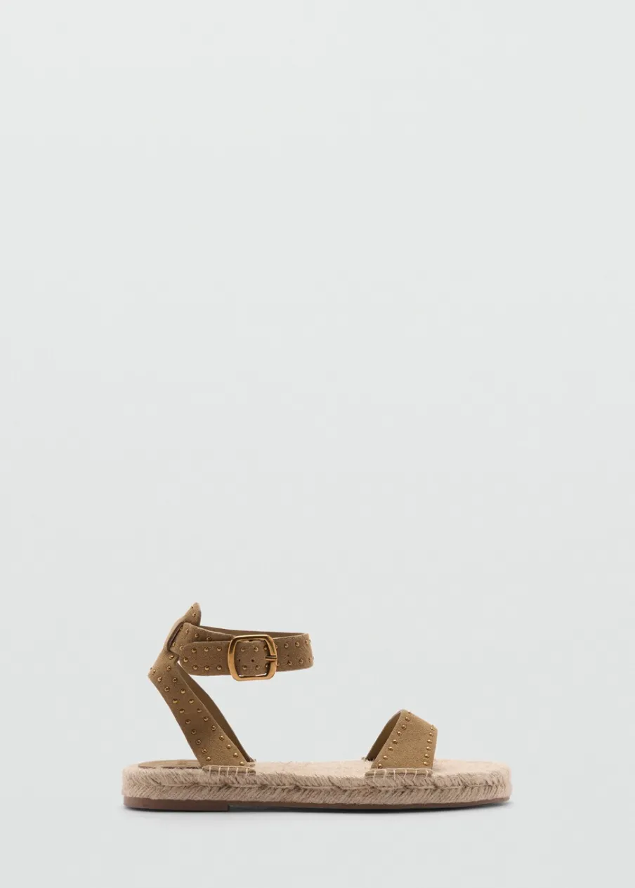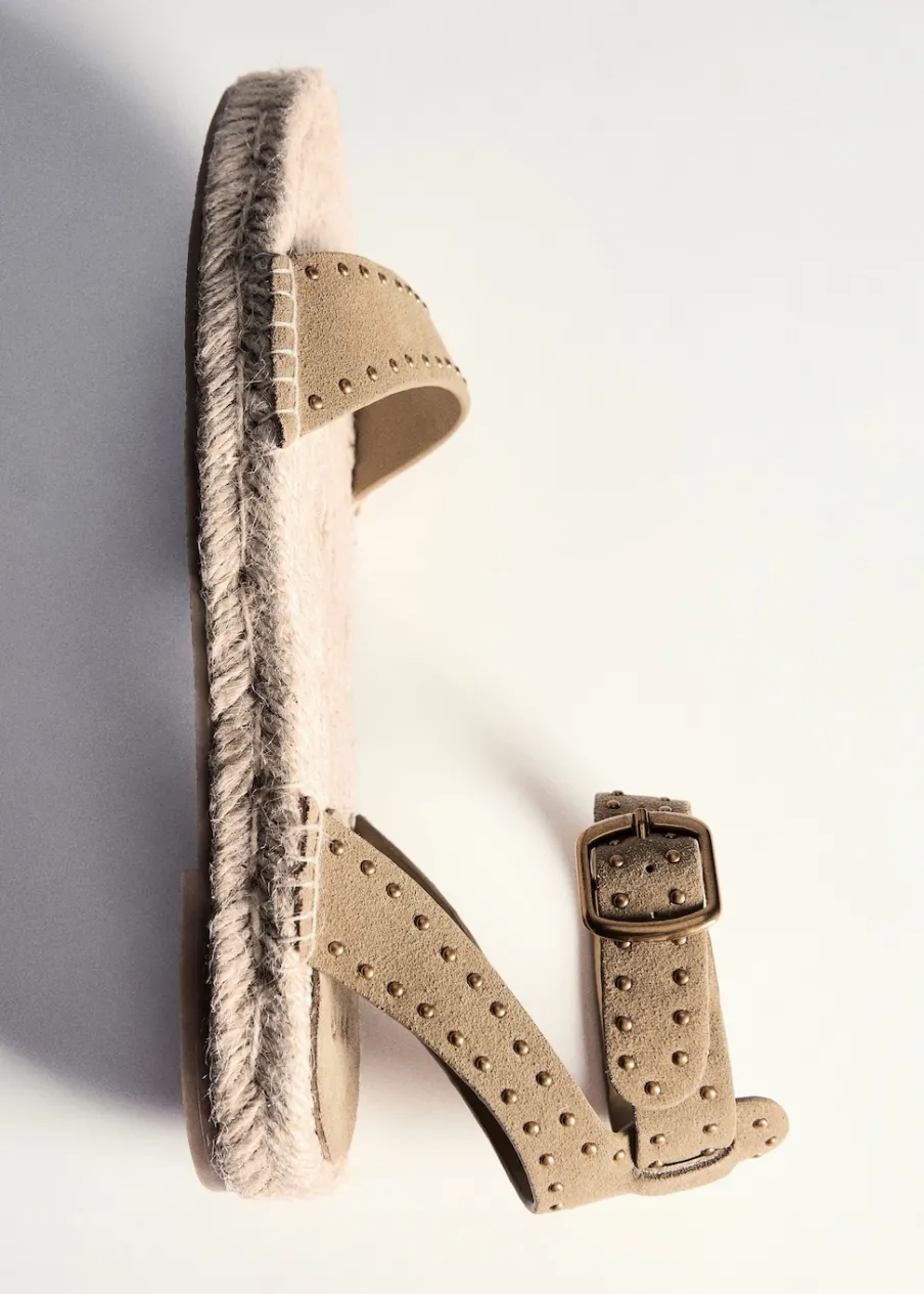 100% skóra bydlęca. Wkładka z juty. Płaska podeszwa. Ozdobne ćwieki. Pasek wokół kostki. Zapięcie na klamrę.