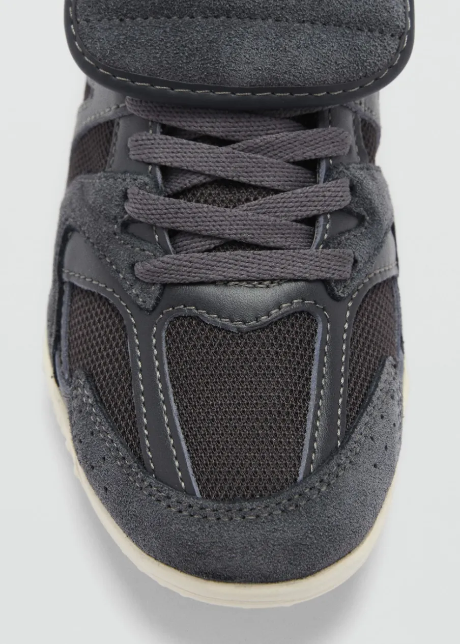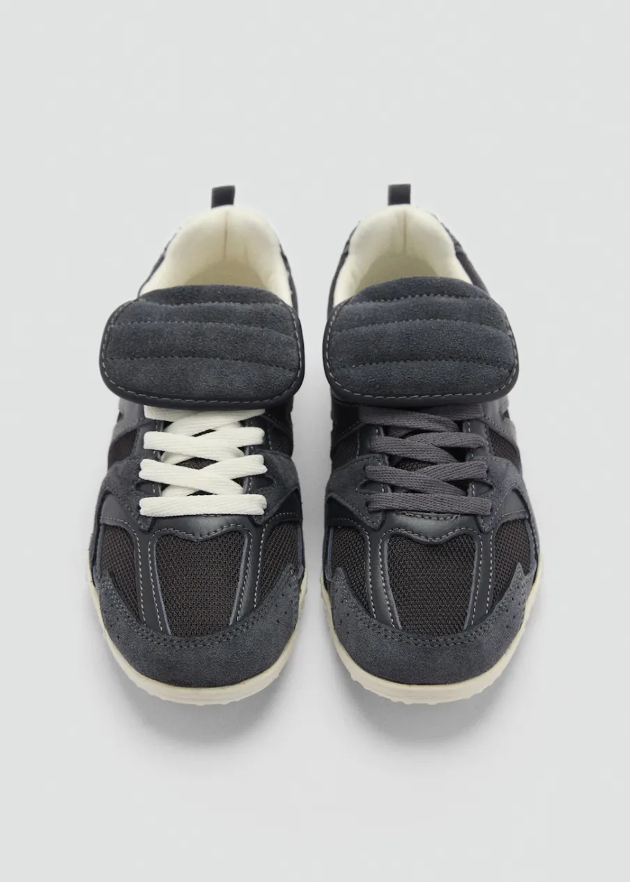 Skórzane wstawki. Okrągły nosek. Płaska podeszwa. Wiązanie na sznurówki. Gumowa podeszwa.