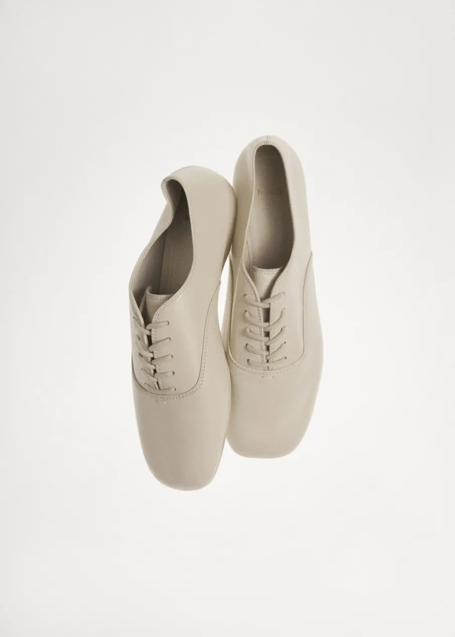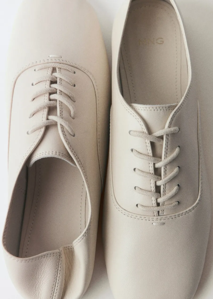 Skóra kozia. Płaska podeszwa. Okrągły nosek. Wiązanie na sznurówki.