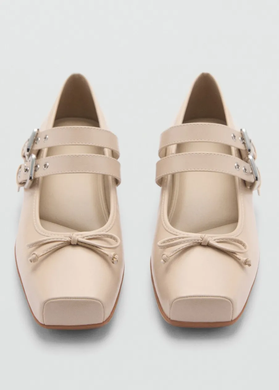 Model z paskami. Kwadratowy nosek. Płaska podeszwa. Zapięcie na podwójną sprzączkę. Ozdobna kokardka.