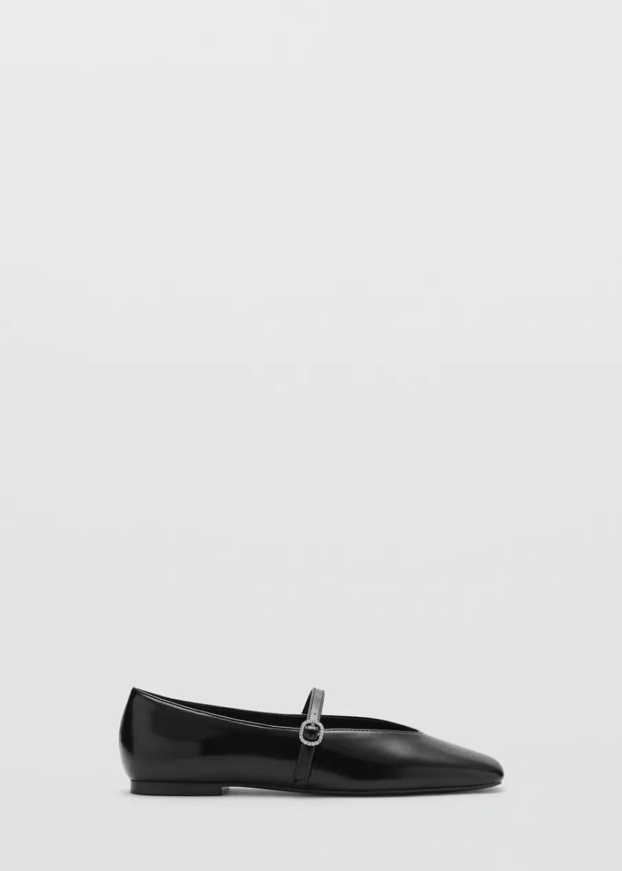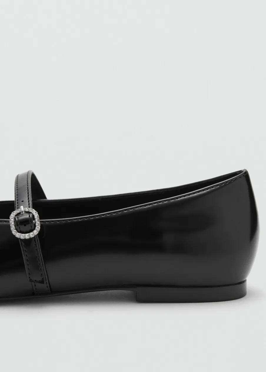 OpisPłaska podeszwa. Imitacja lakierowanej skóry. Zapięcie na klamrę. Sprzączka ze zdobieniami. Okrągły nosek.