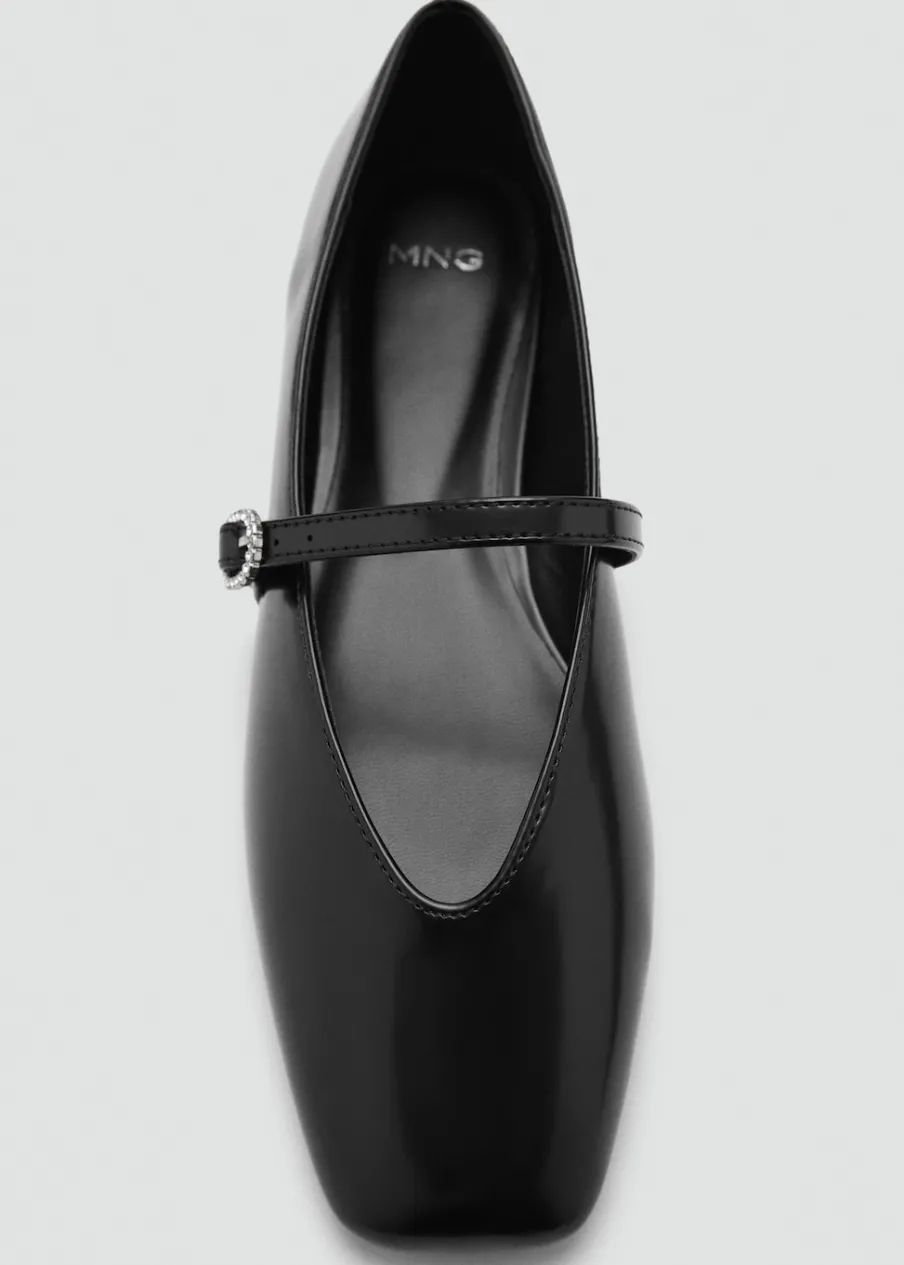 Płaska podeszwa. Imitacja lakierowanej skóry. Zapięcie na klamrę. Sprzączka ze zdobieniami. Okrągły nosek.