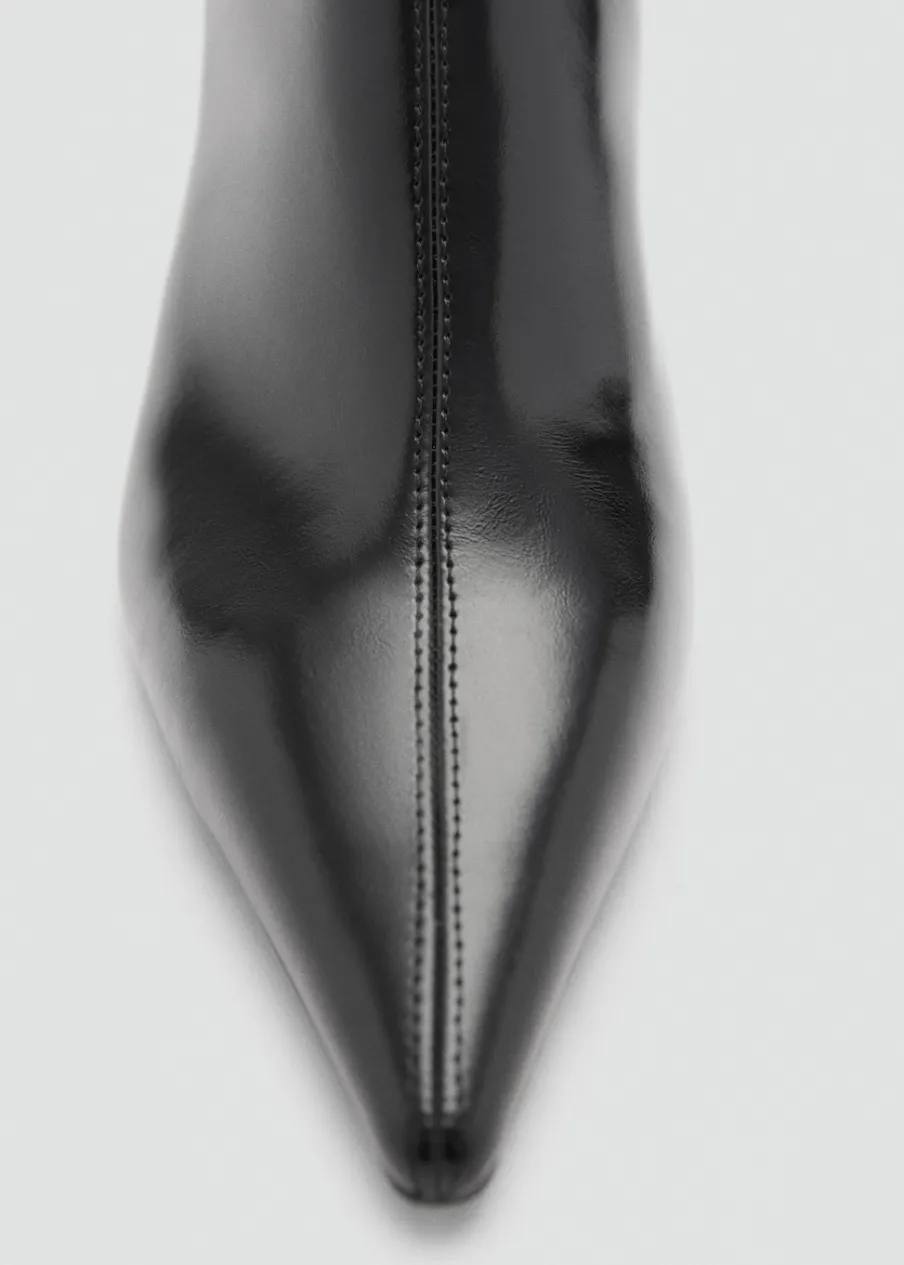 Efekt skóry. Spiczaste zakończenie. Obcas typu kitten. Obcas mierzy 5 cm. Bez zapięcia.