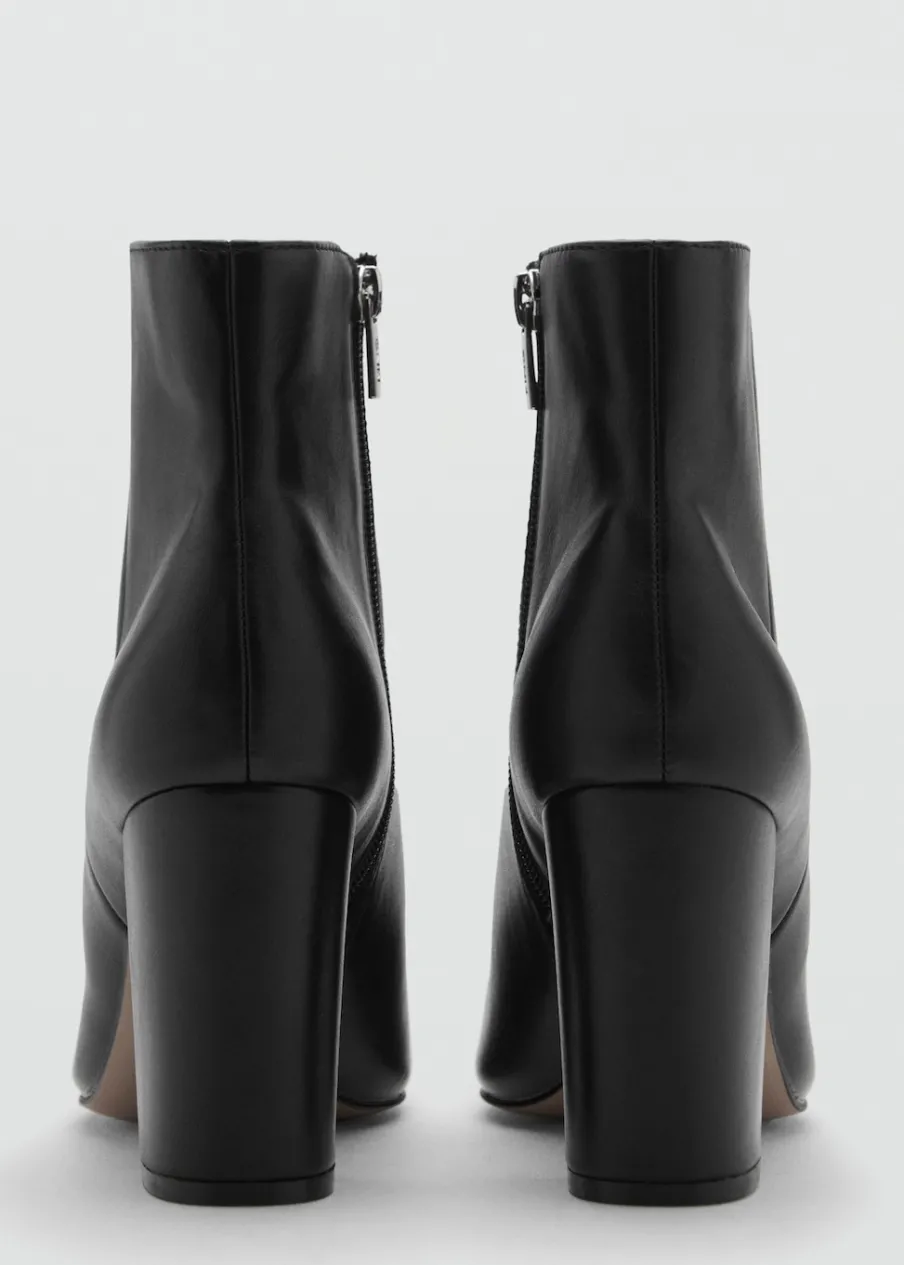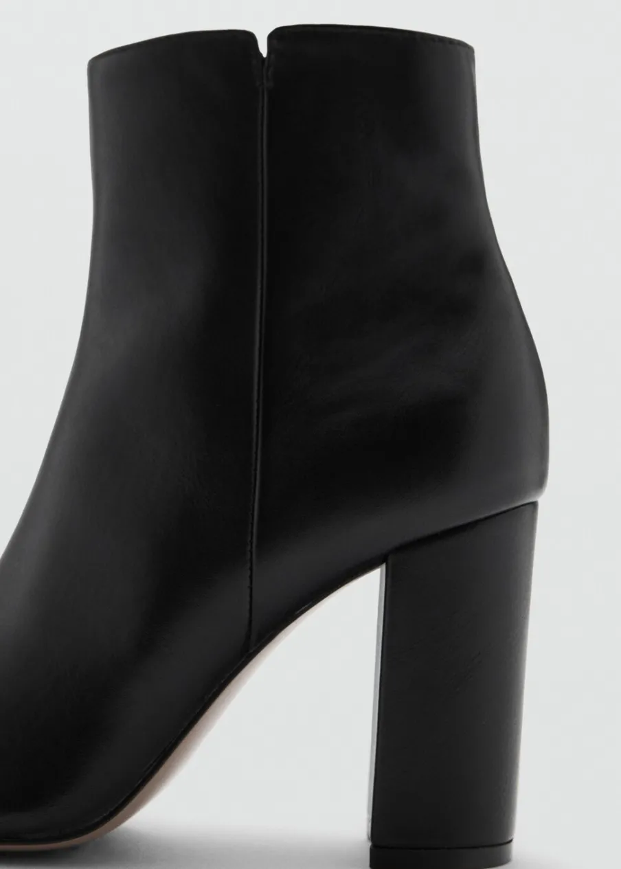 OpisEfekt skóry. Spiczaste zakończenie. Obcas klockowy. Boczne zapięcie na suwak. Obcas mierzy 8,5 cm.