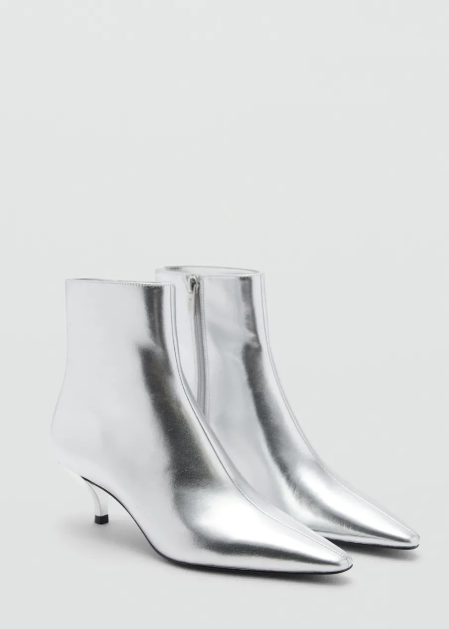 Metaliczny efekt. Spiczaste zakończenie. Obcas typu kitten. Zapięcie na zamek z boku. Wewnętrzna podszewka. Obcas mierzy 5,5 cm.