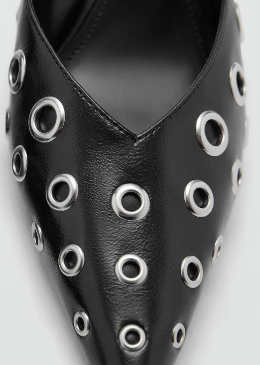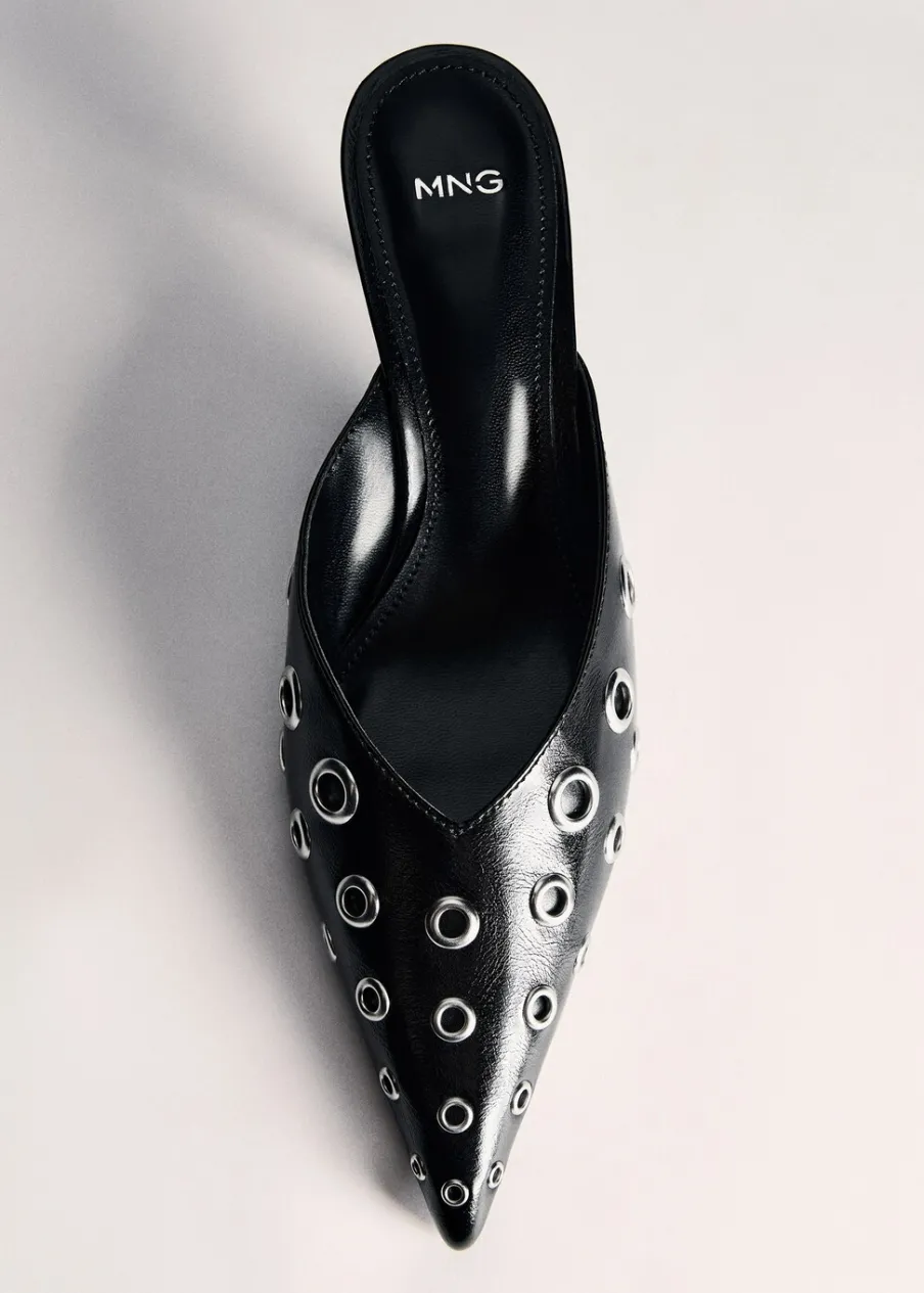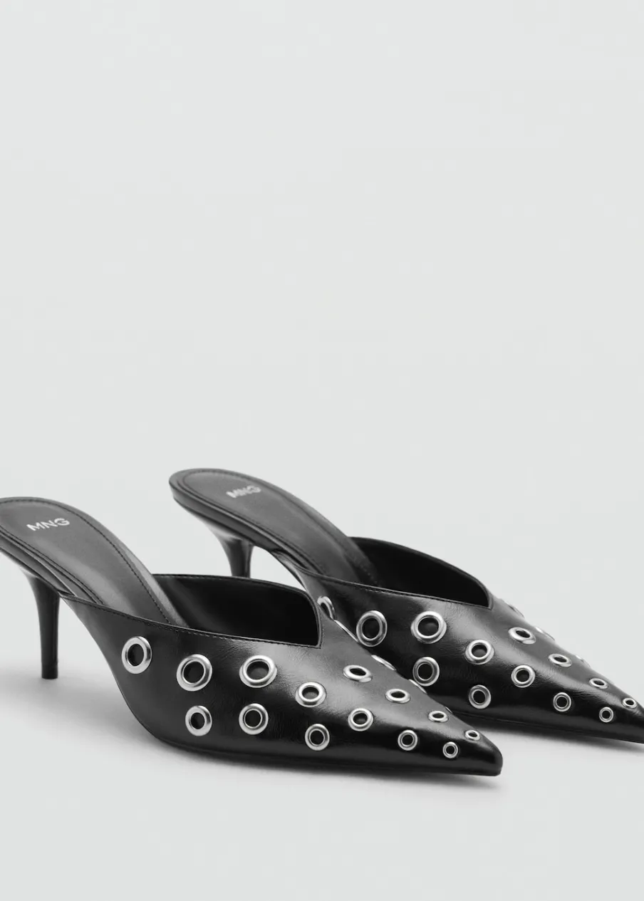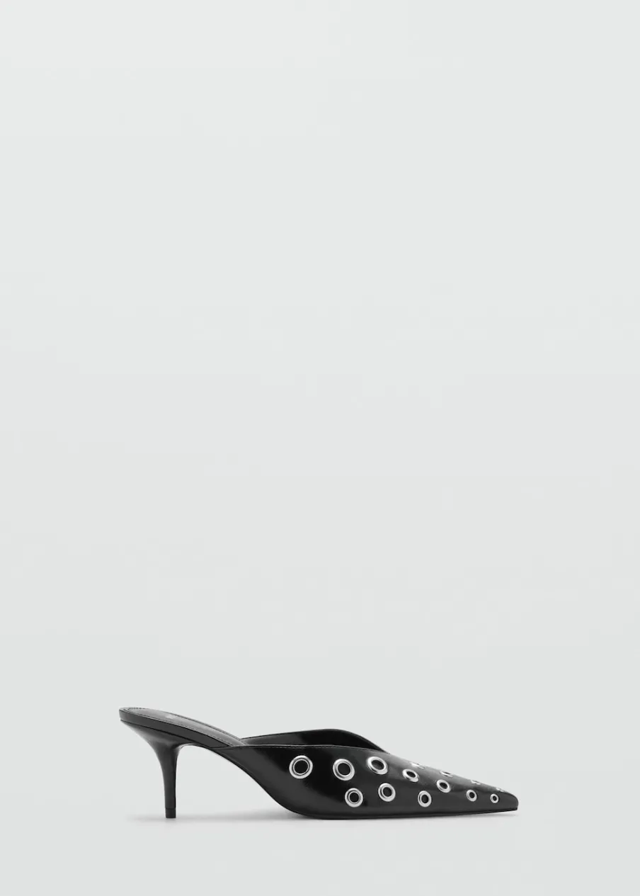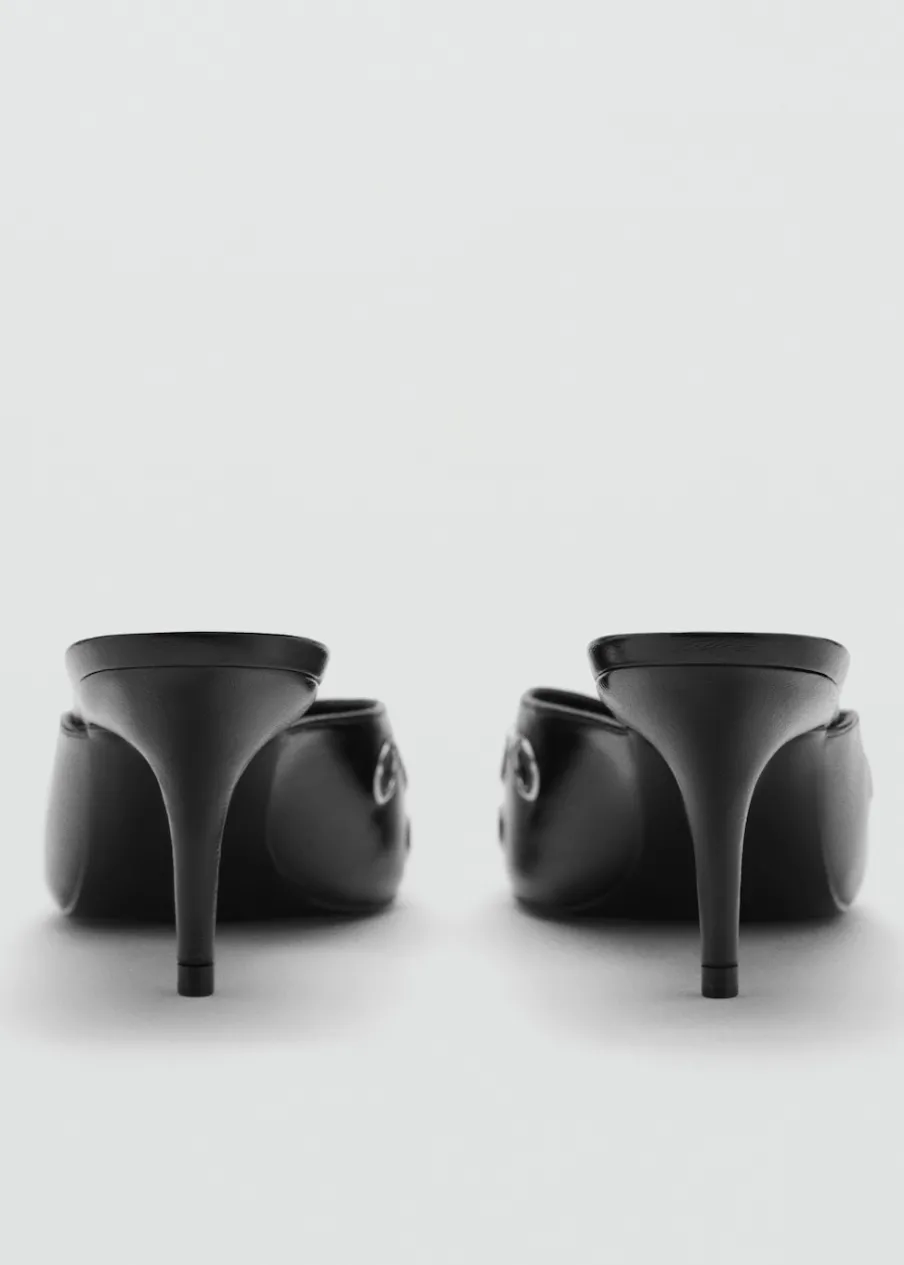 Fason z odkrytą piętą. Metalowy element. Obcas lejkowy. Spiczaste zakończenie. Obcas mierzy 6 cm. Bez zapięcia. Wyłącznie online. Typu mule.