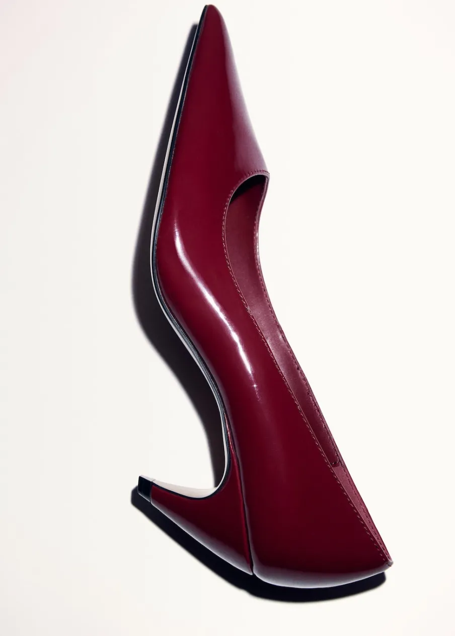 Obcas lejkowy. Spiczaste zakończenie. Obcas mierzy 5,5 cm. Bez zapięcia. Imitacja lakierowanej skóry. Wewnętrzna podszewka.