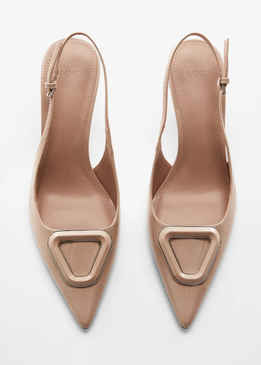 OpisImitacja lakierowanej skóry. Obcas szpilka. Spiczaste zakończenie. Bez pięt. Zapięcie na klamrę. Metalowy eleme…