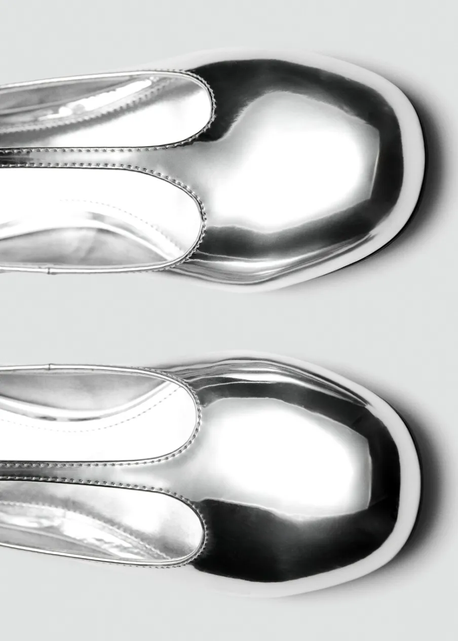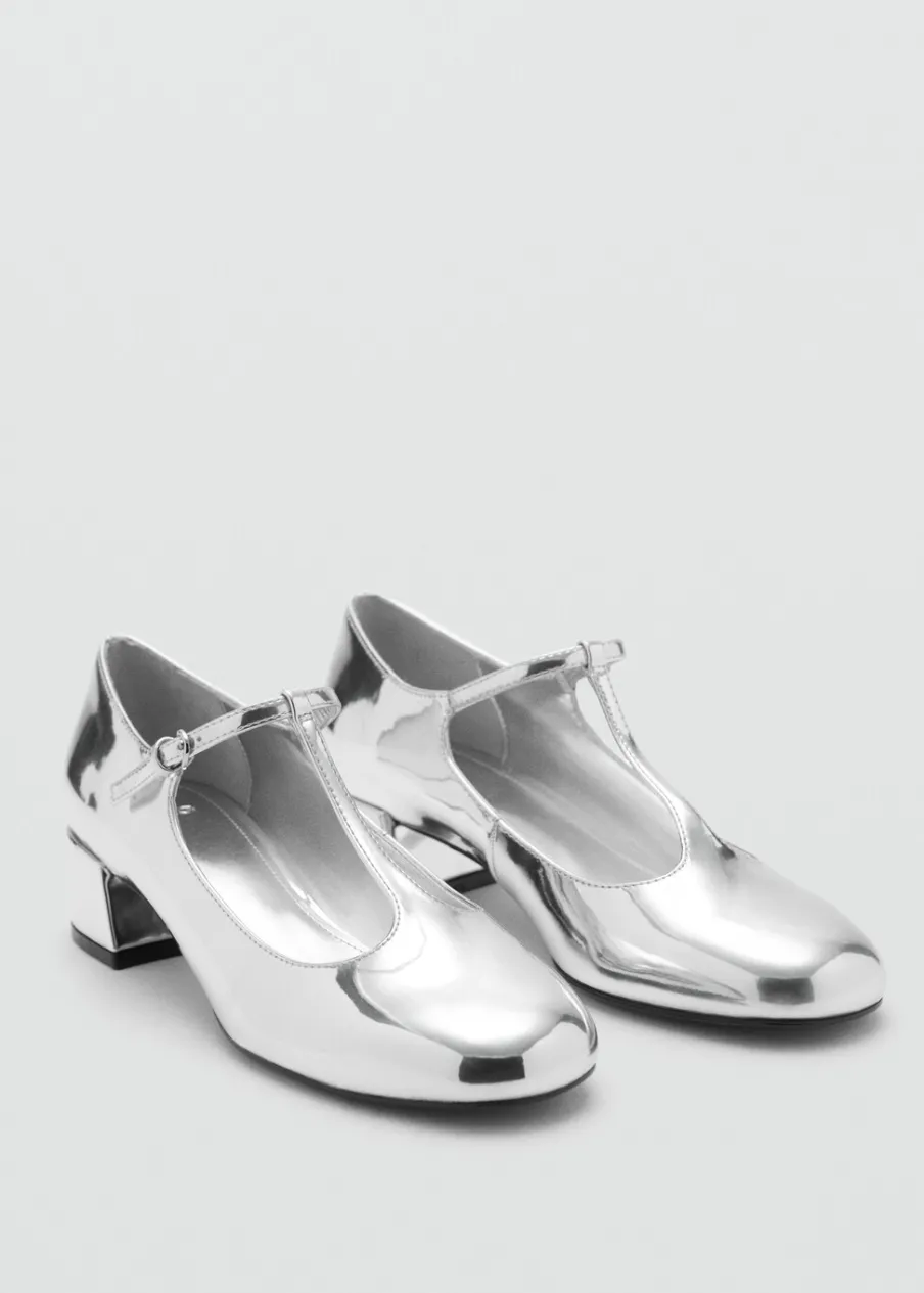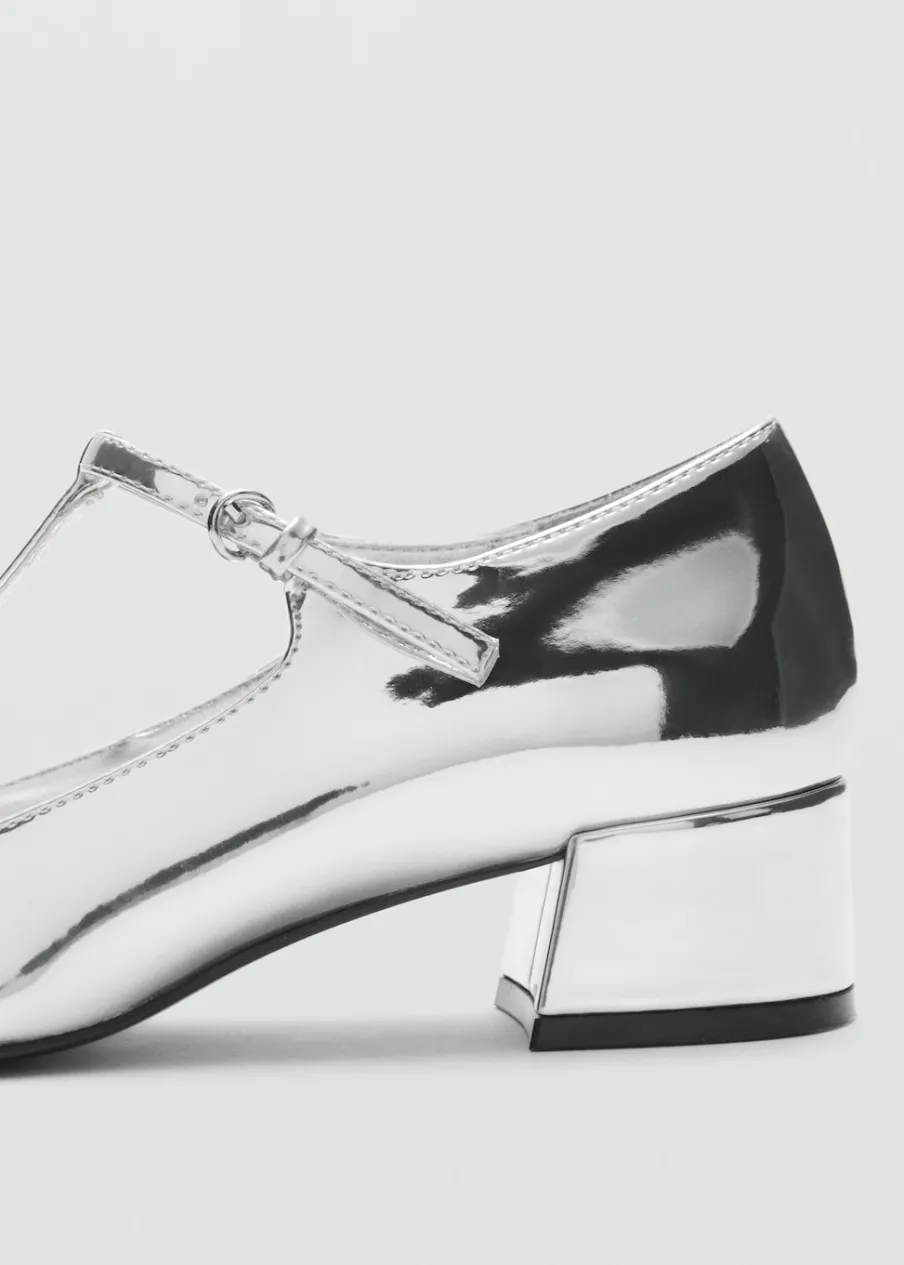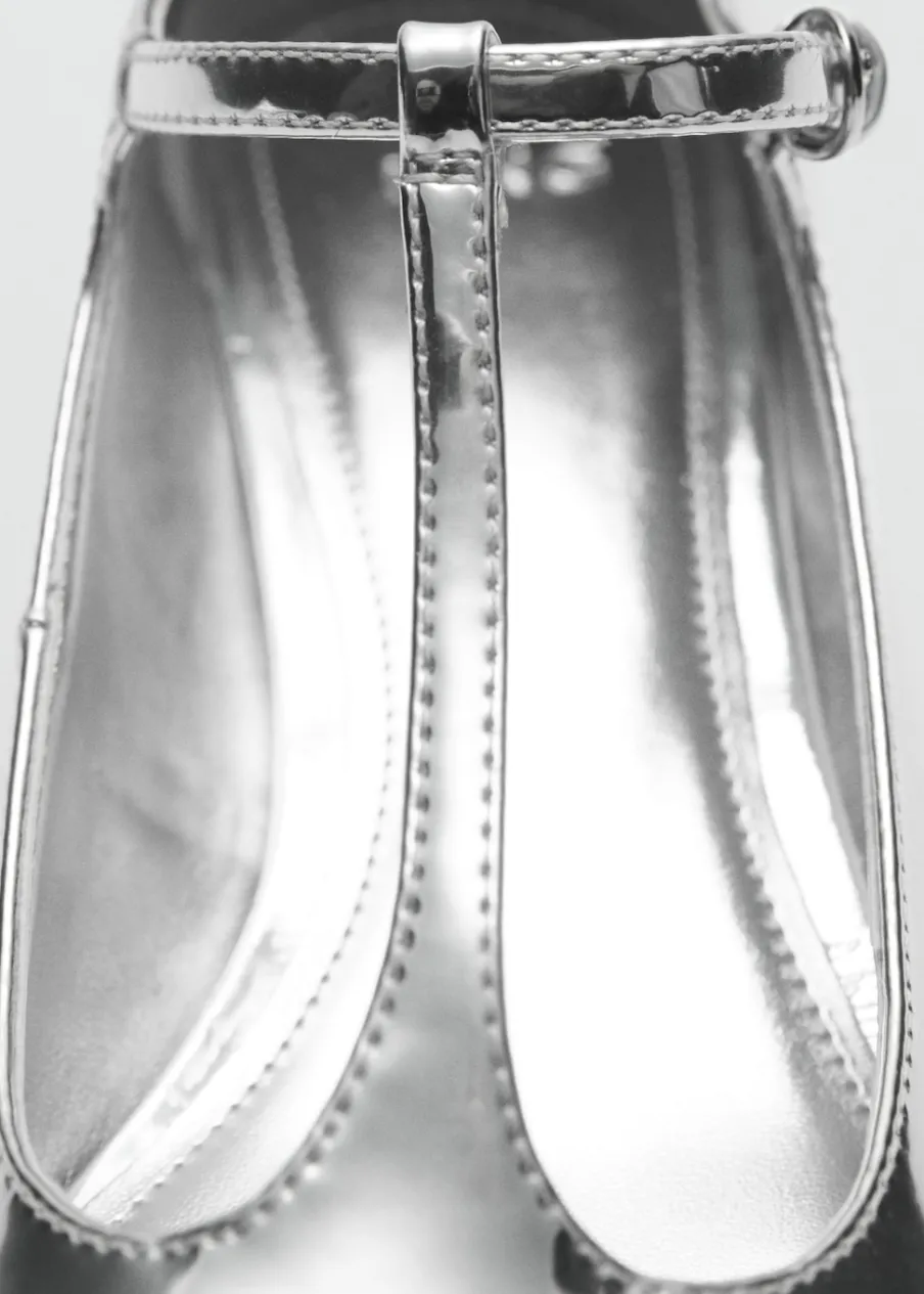 OpisMetaliczny obcas. Obcas klockowy. Okrągły nosek. Obcas mierzy 4 cm. Zapięcie na klamrę.