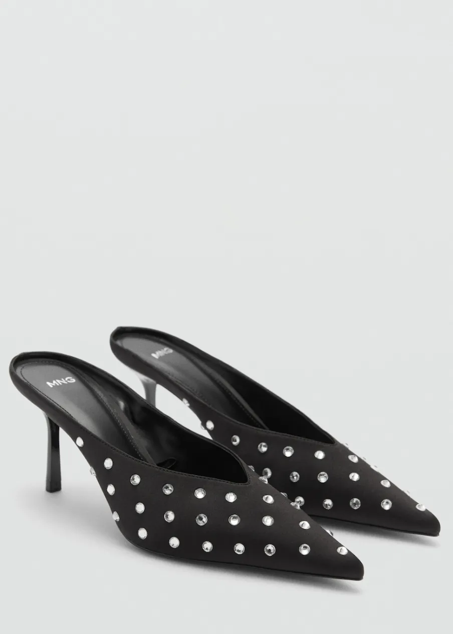 Spiczaste zakończenie. Obcas mierzy 8 cm. Bez zapięcia. Ozdobne kryształki. Wewnętrzna podszewka. Model z odkrytą piętą.