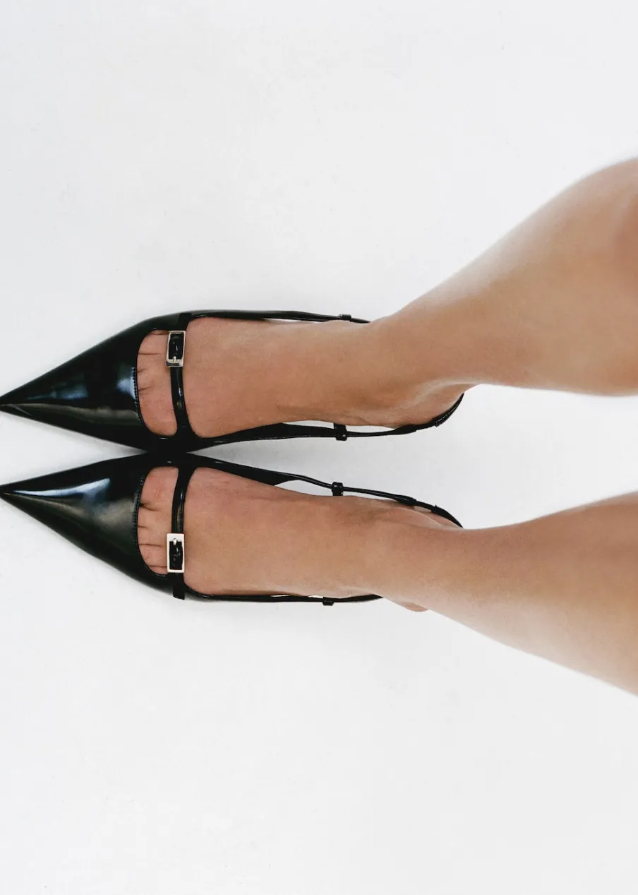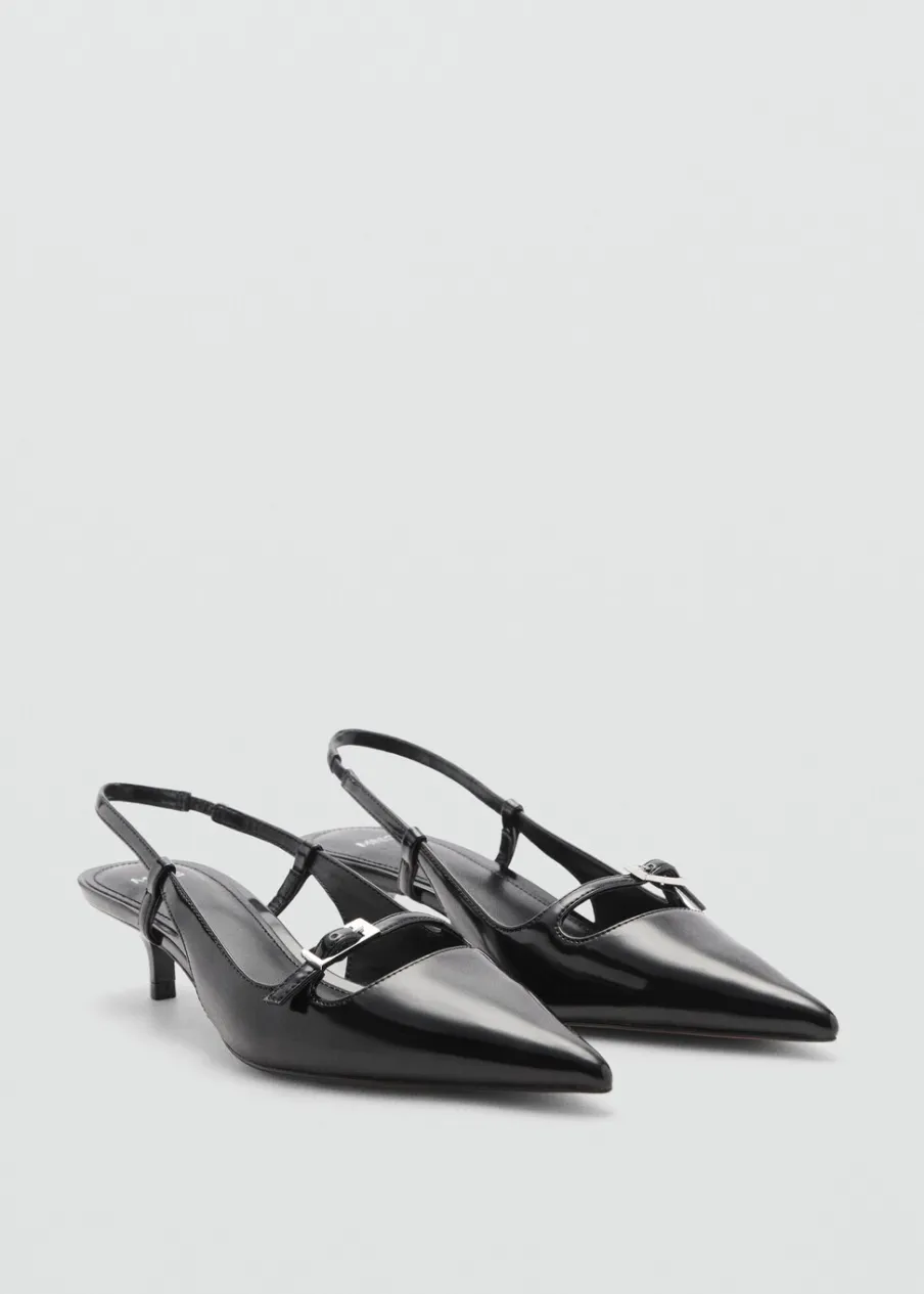 Fason z odkrytą piętą. Efekt skóry. Spiczaste zakończenie. Obcas typu kitten. Obcas mierzy 5 cm. Bez zapięcia. Ozdobna klamra.