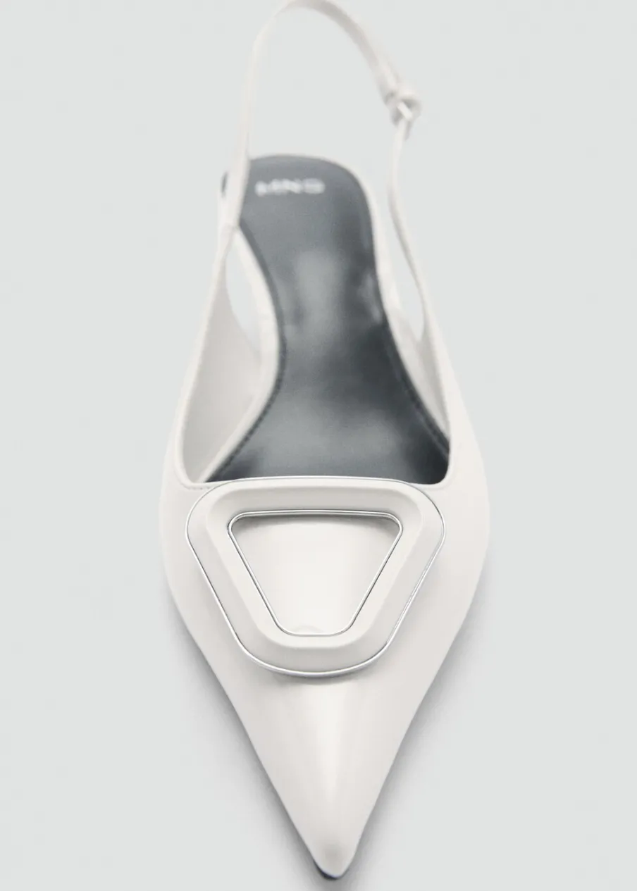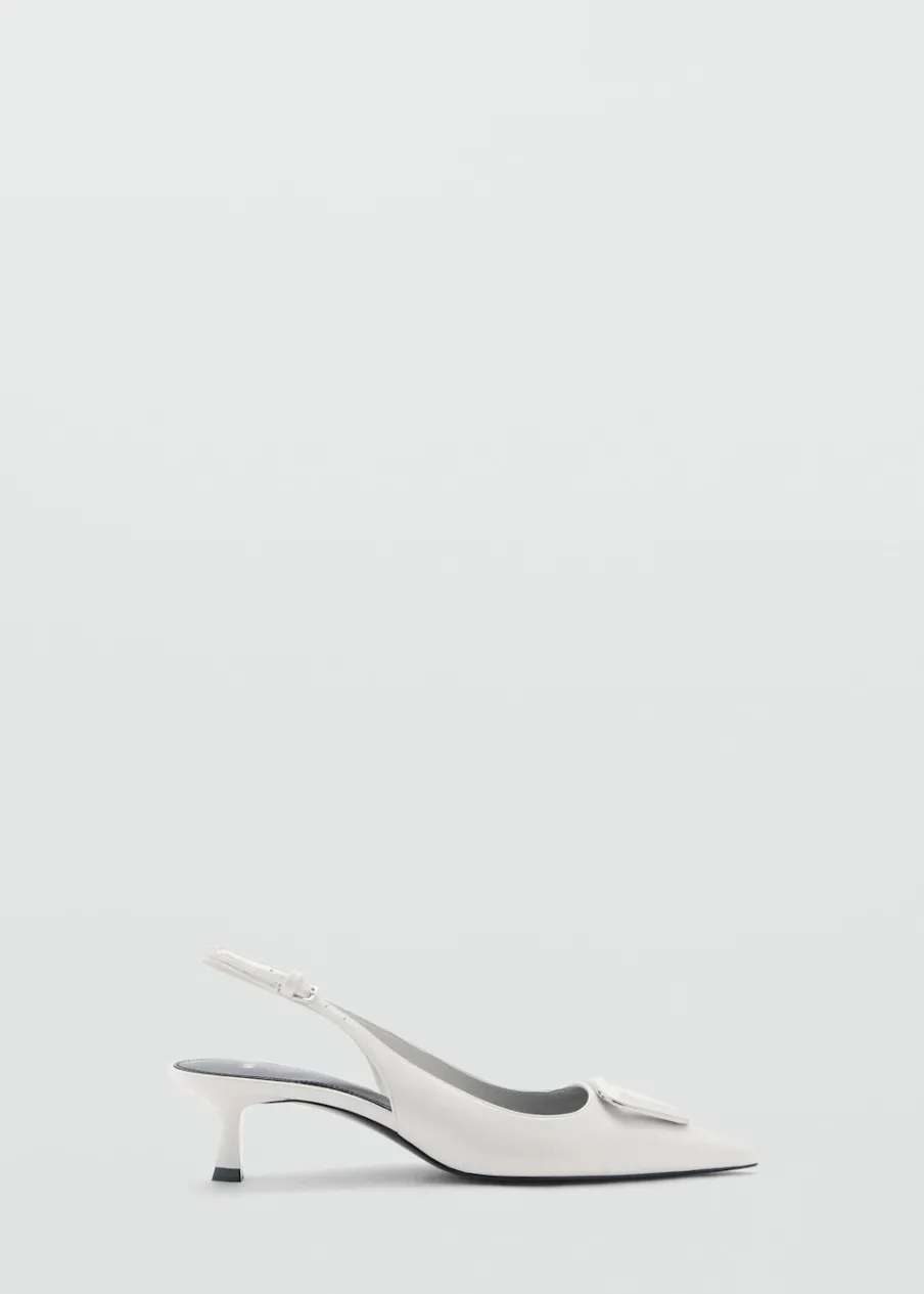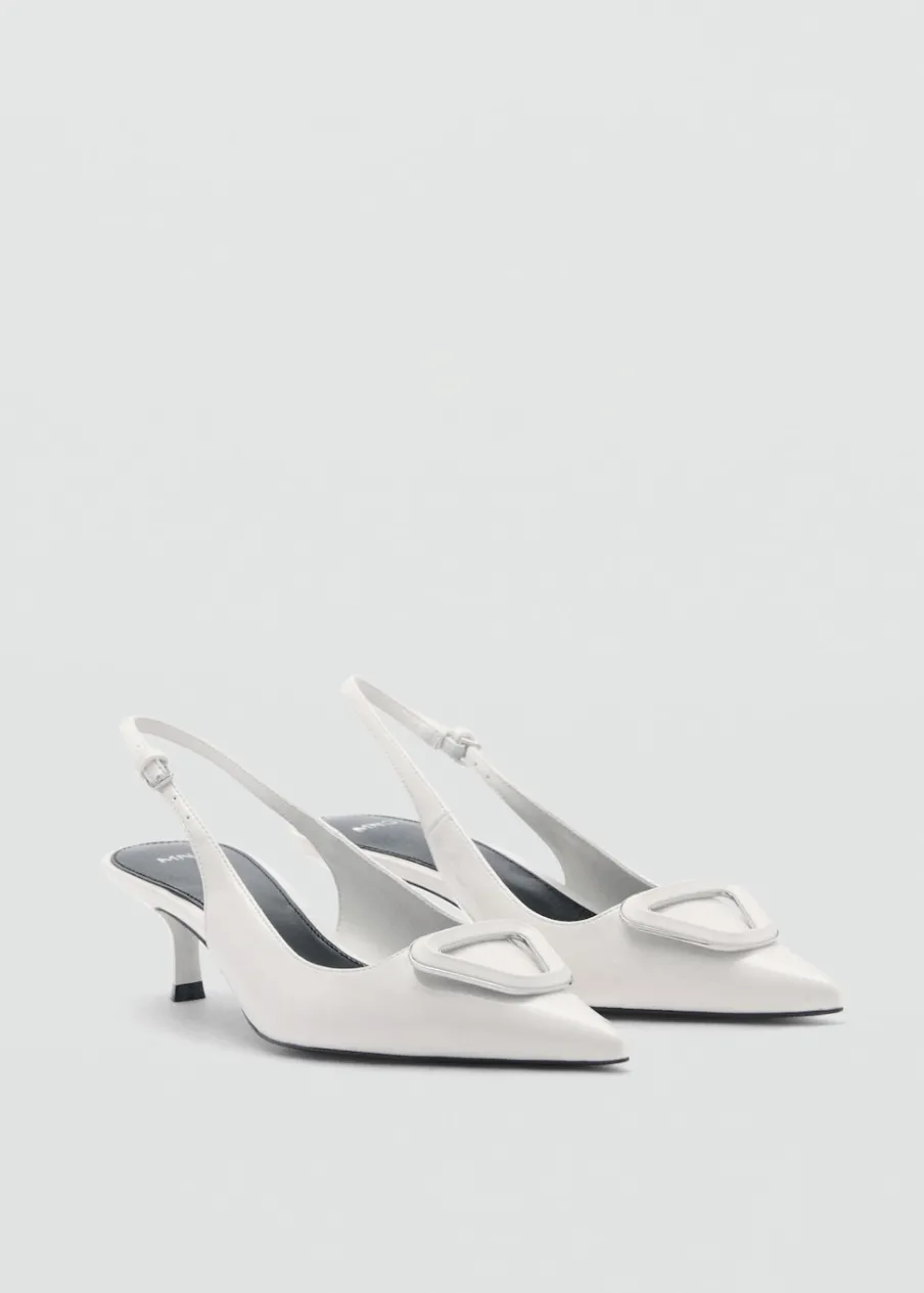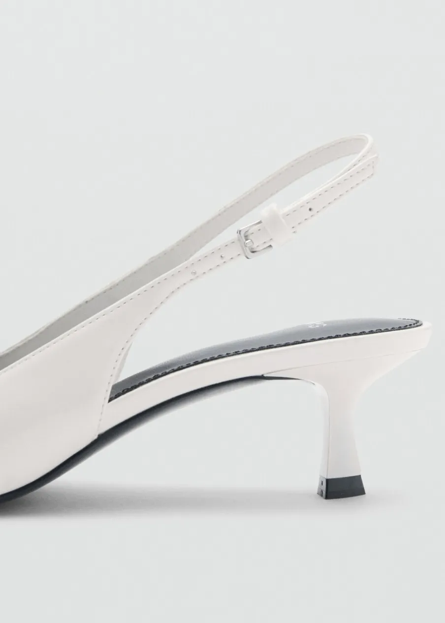Efekt skóry. Fason z odkrytą piętą. Spiczaste zakończenie. Obcas typu kitten. Obcas mierzy 5,5 cm. Zapięcie na klamrę. Wypukła tekstura.