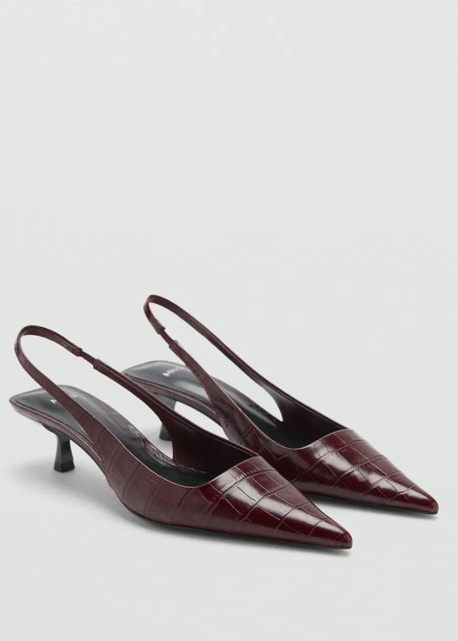 Obcas typu kitten. Spiczaste zakończenie. Obcas mierzy 5 cm. Efekt krokodylej skóry.