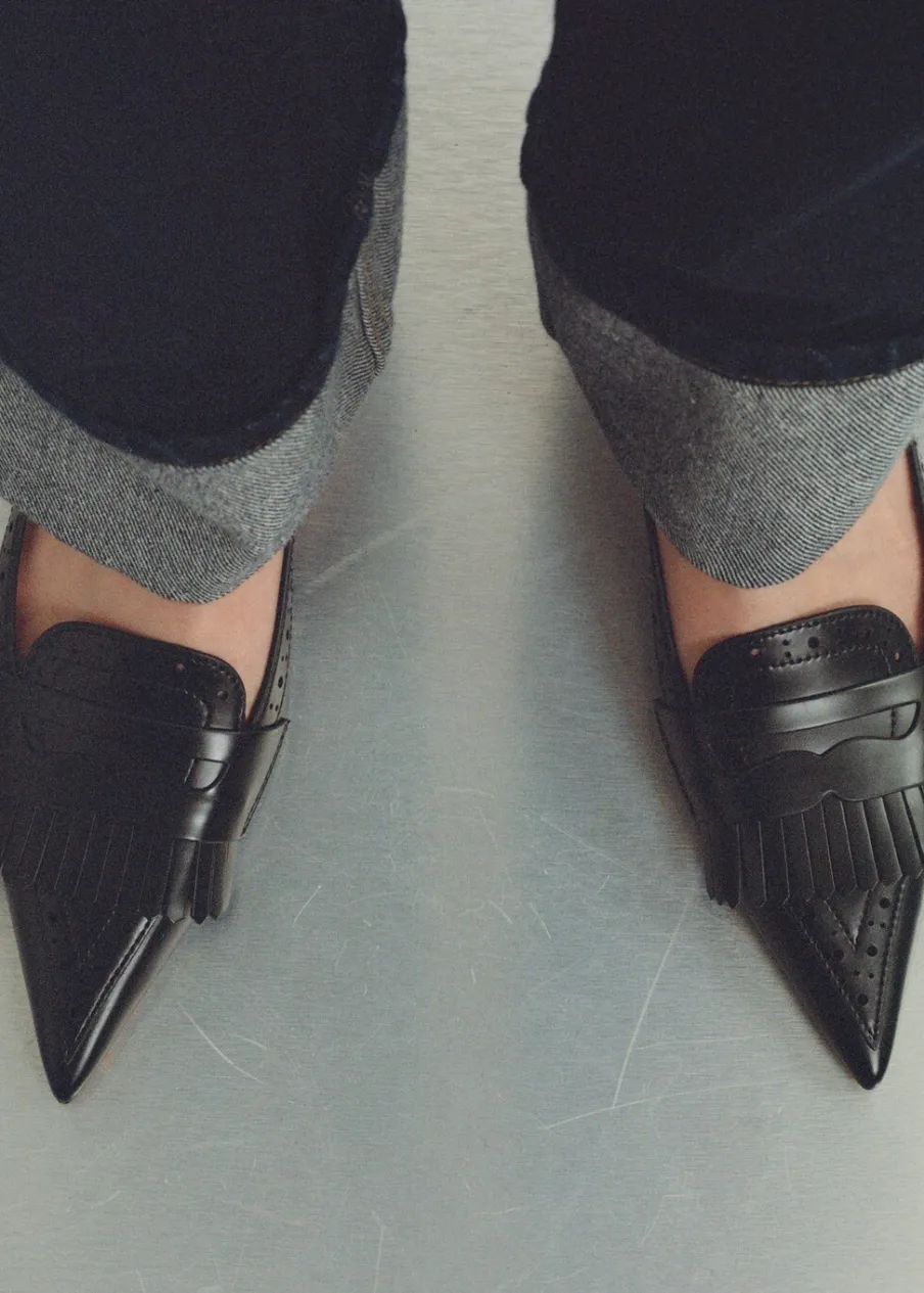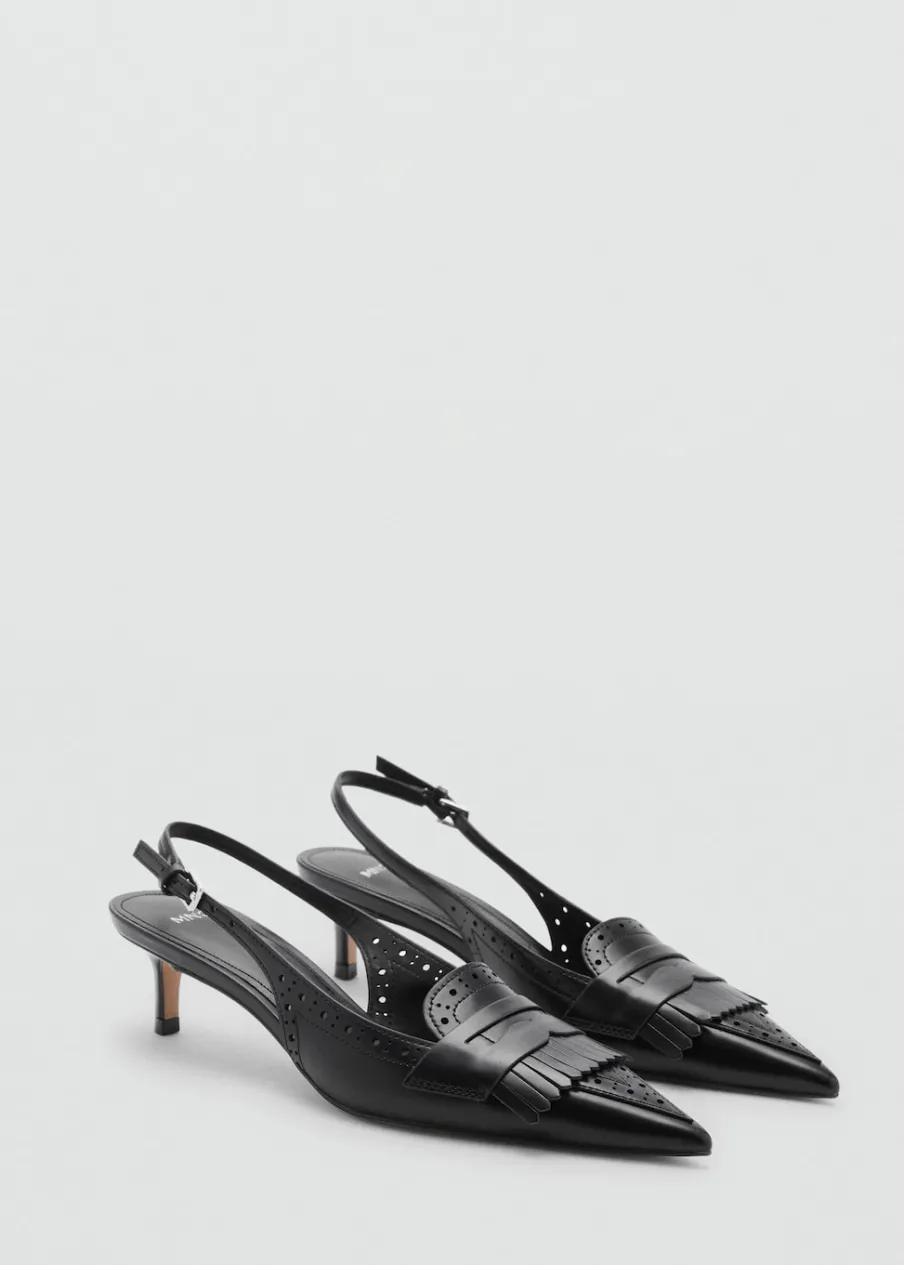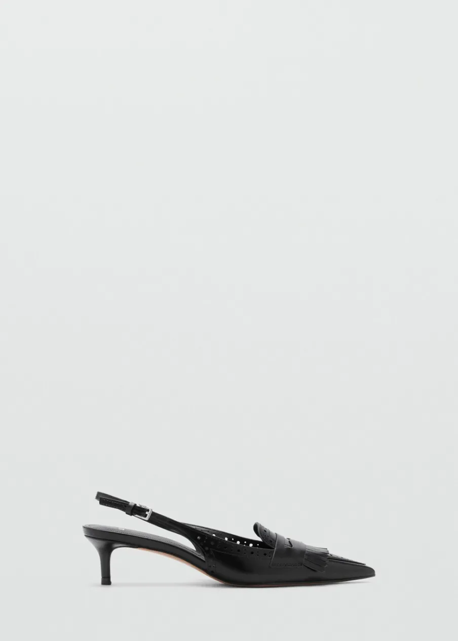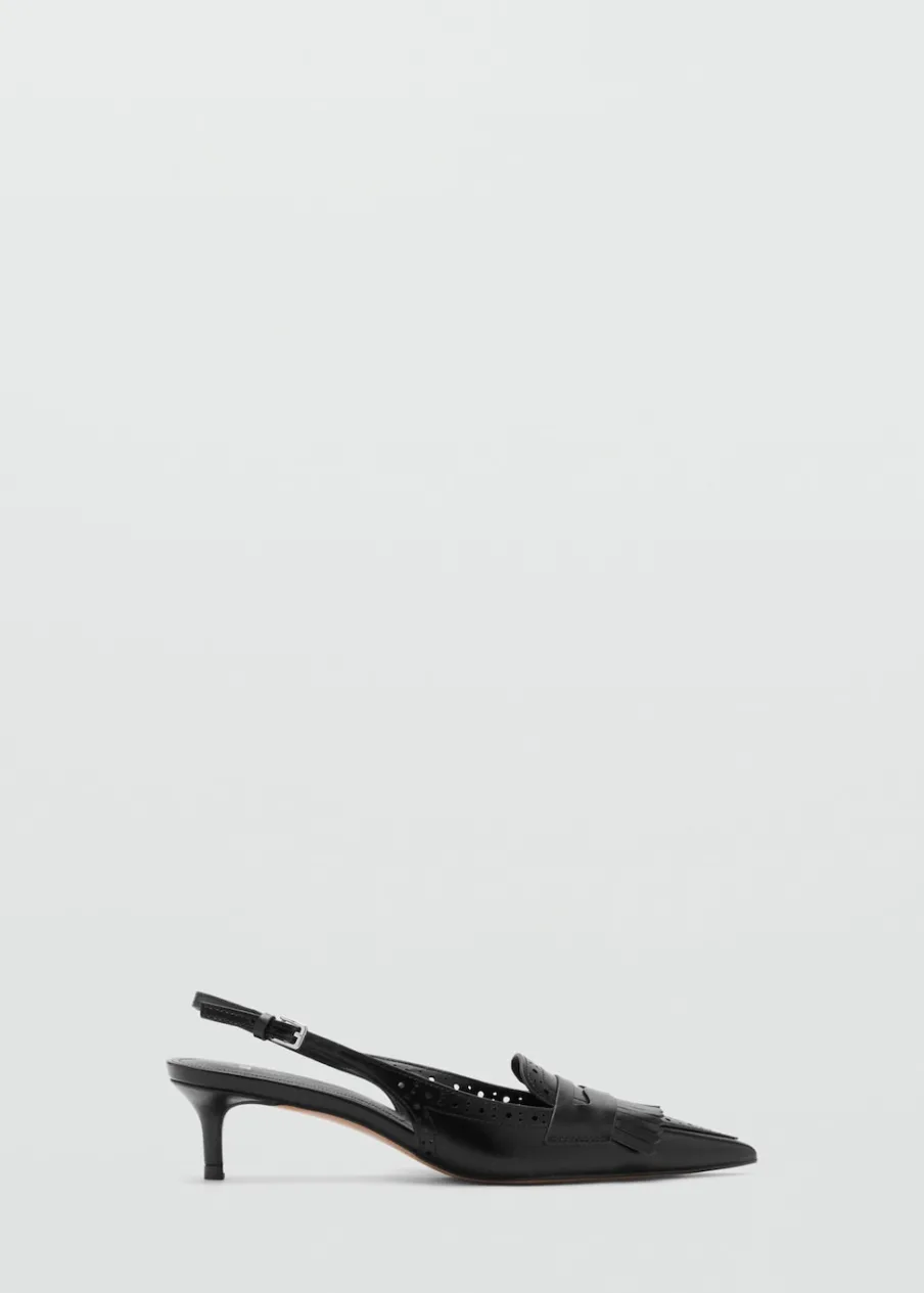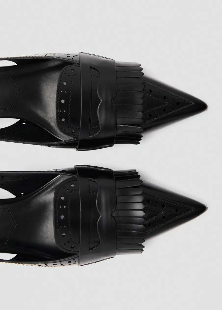 Fason z odkrytą piętą. Spiczaste zakończenie. Detal z frędzli. Ażurowe detale. Obcas mierzy 5 cm. Zapięcie na klamrę. Wewnętrzna podszewka.
