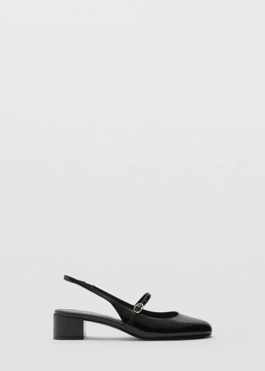 Imitacja lakierowanej skóry. Fason z odkrytą piętą. Okrągły nosek. Obcas klockowy. Obcas mierzy 5 cm. Zapięcie na pasek ze sprzączką.