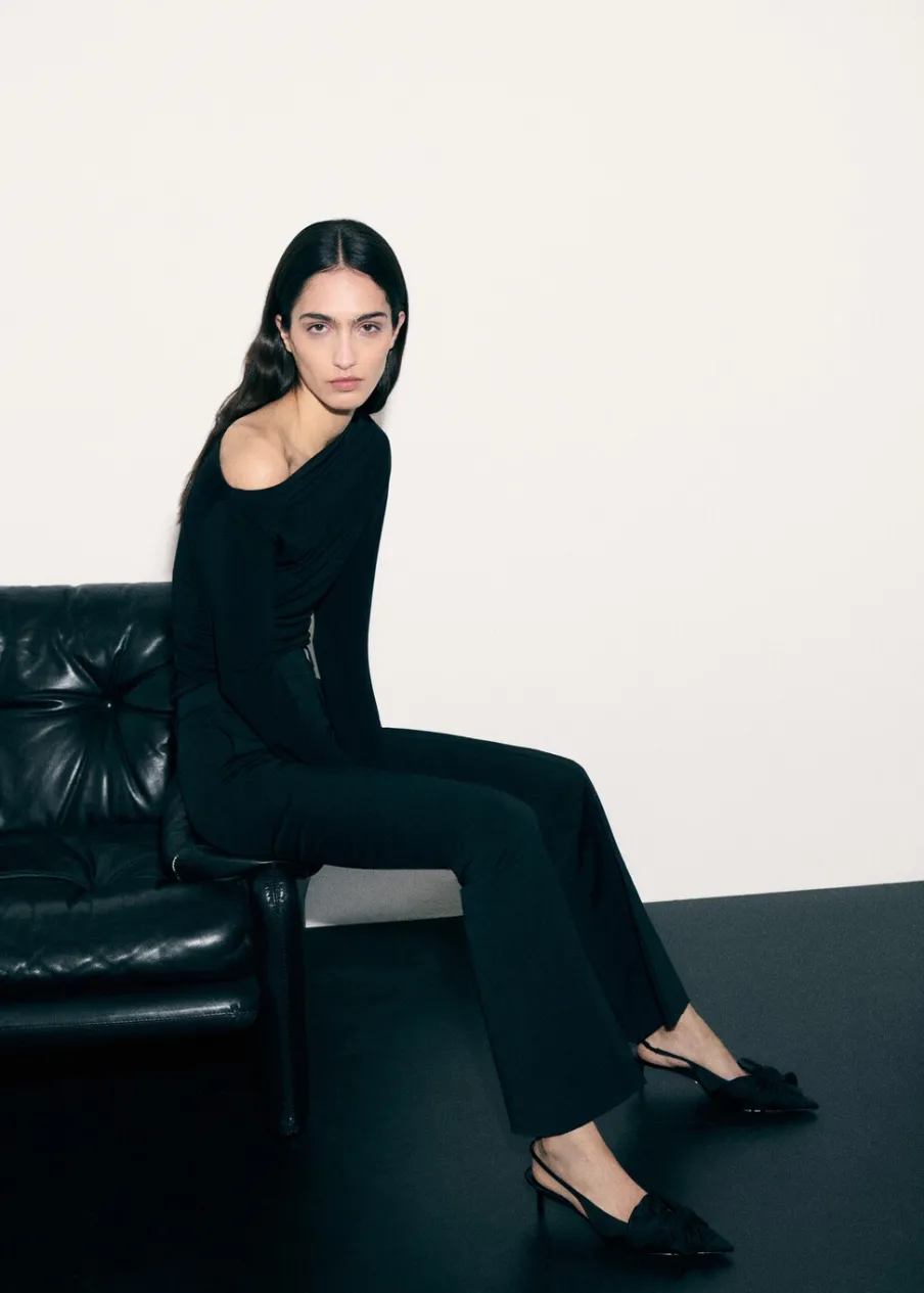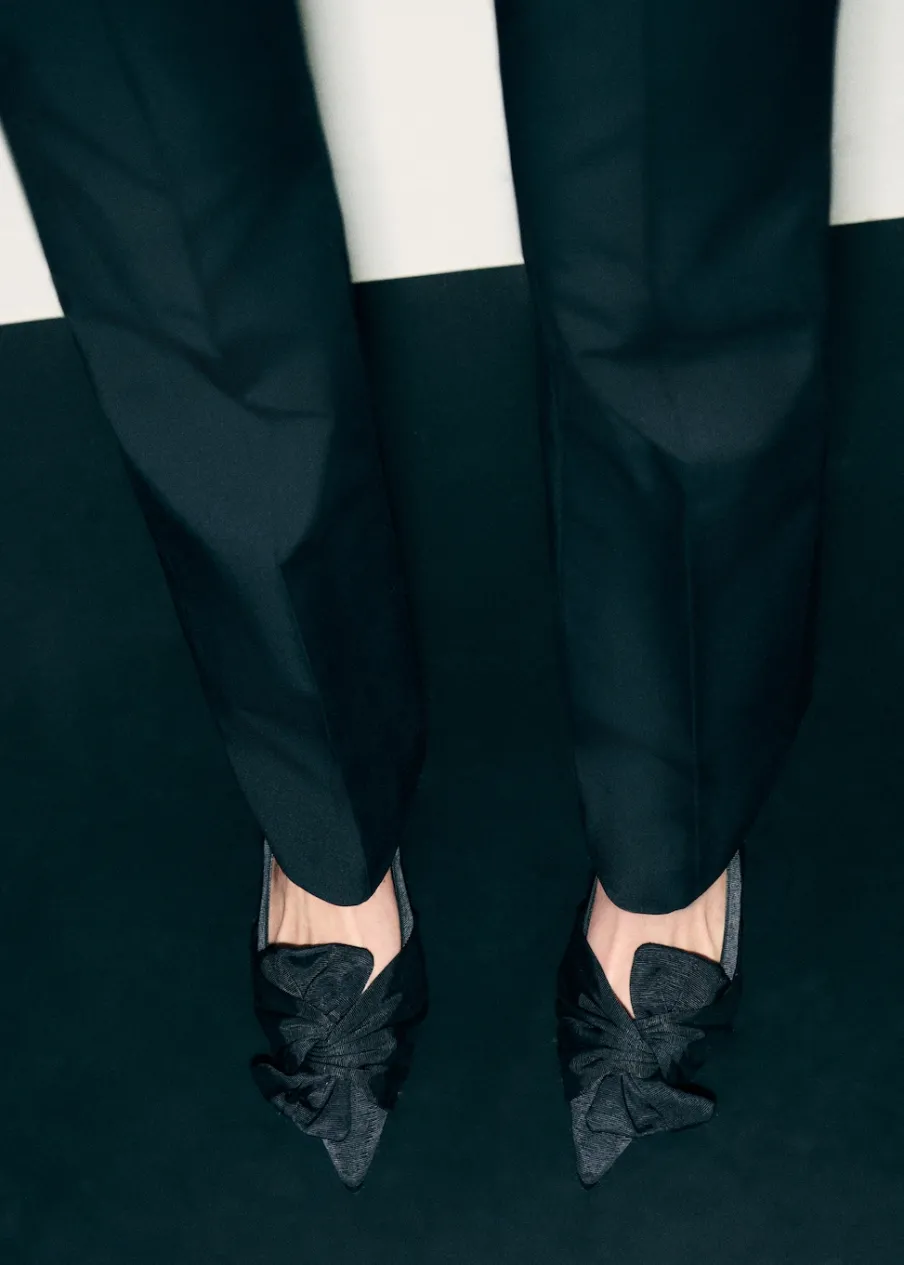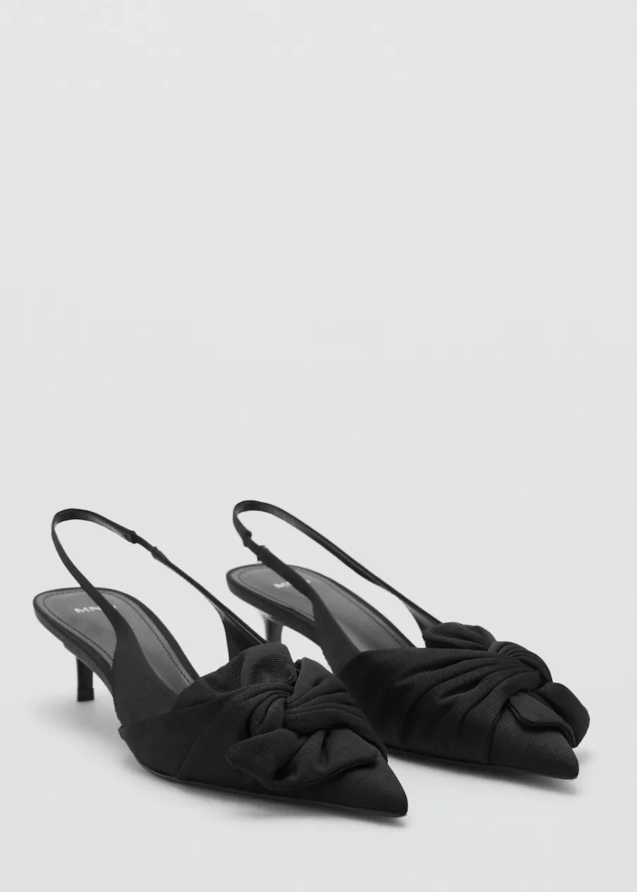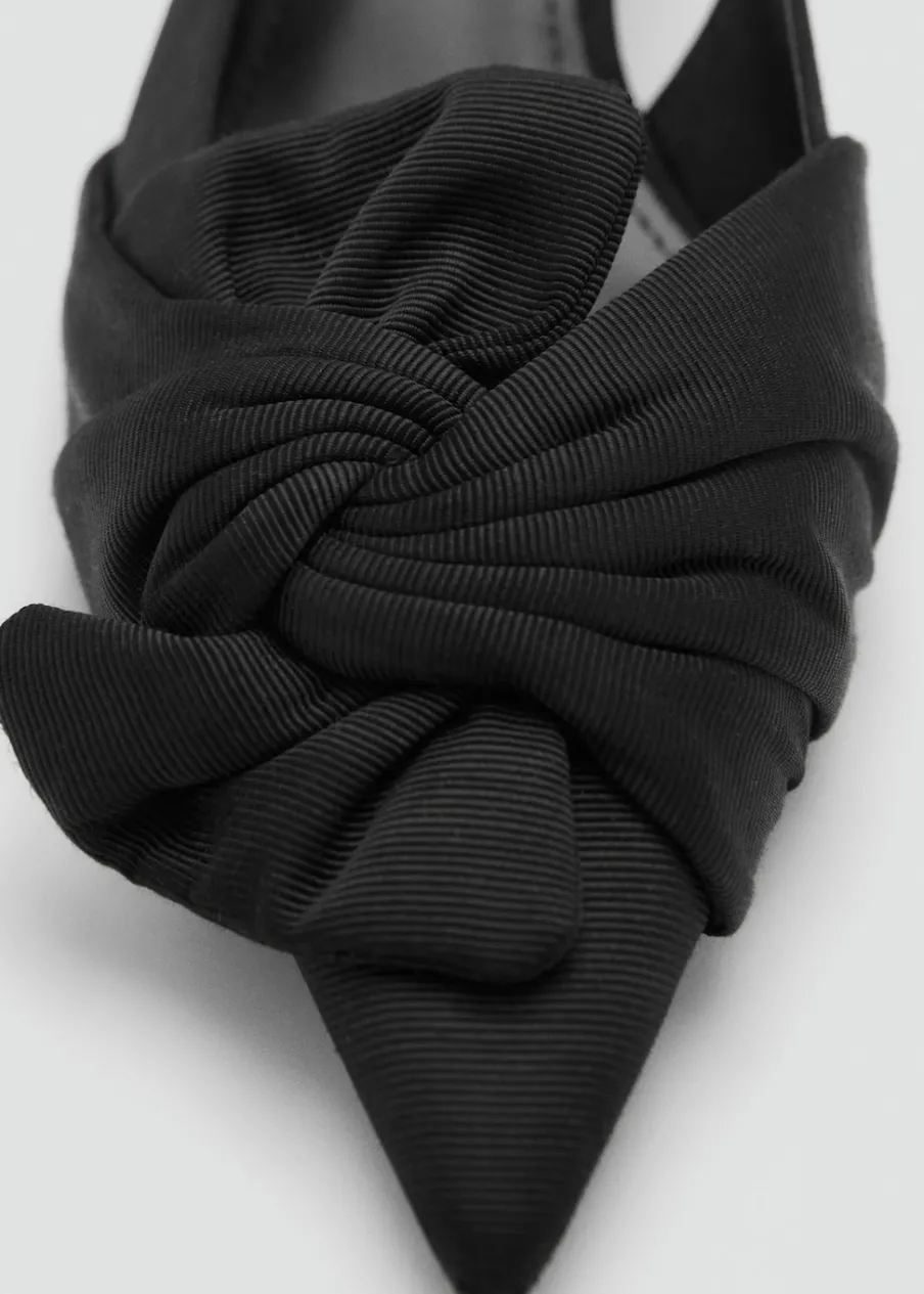Bawełniana tkanina. Fason z odkrytą piętą. Obcas typu kitten. Spiczaste zakończenie. Obcas mierzy 5 cm. Bez zapięcia. Ozdobny węzeł. Tylko podszewka.