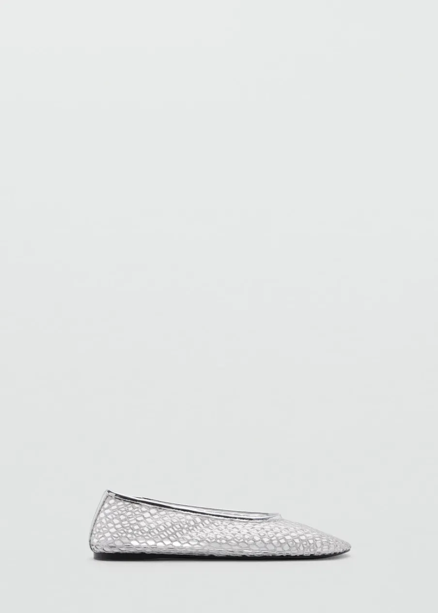 Siateczkowa tkanina. Metaliczny efekt. Okrągły nosek. Płaska podeszwa. Bez zapięcia.