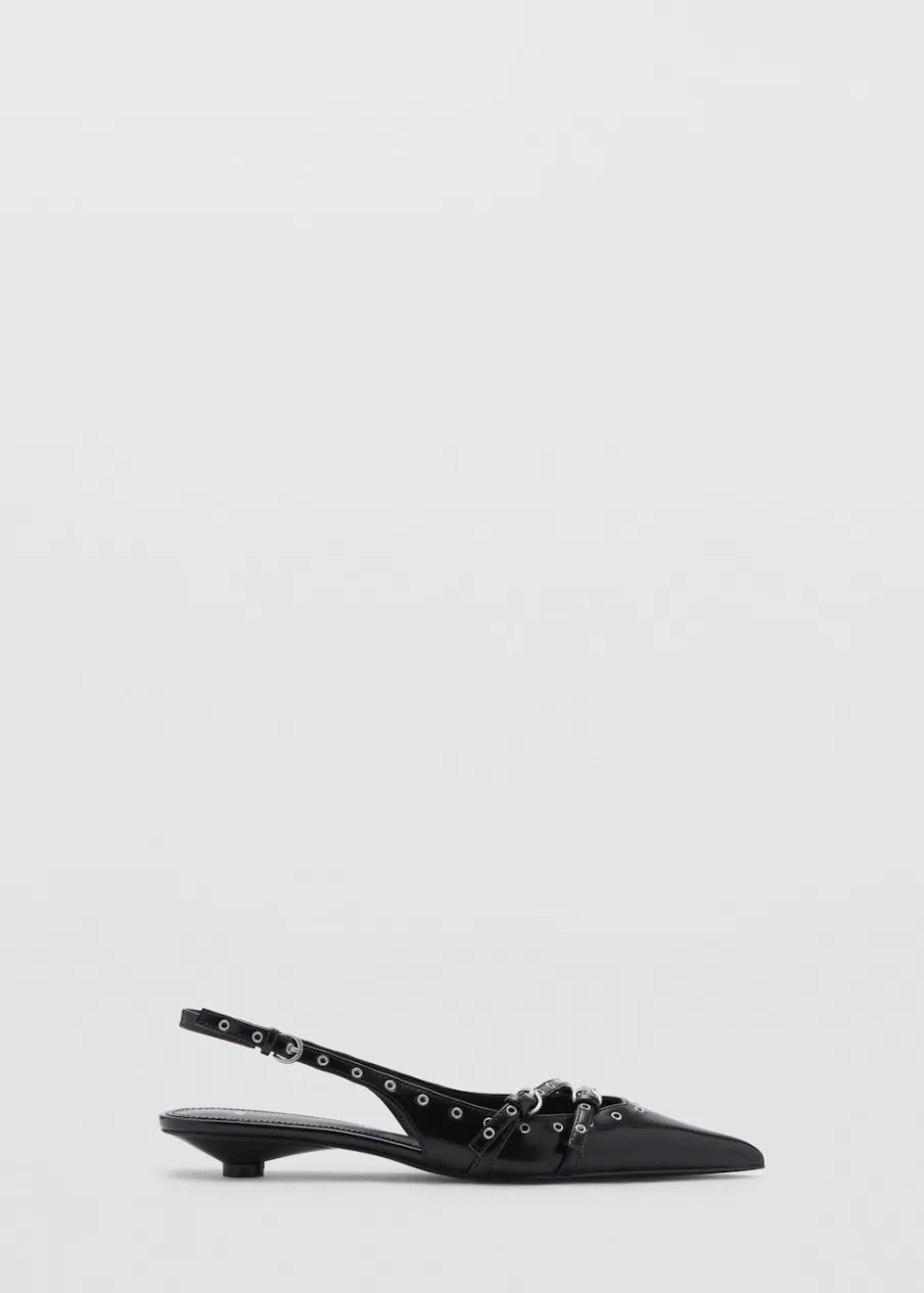Obcas typu kitten. Dziurkowane detale. Spiczaste zakończenie. Zapięcie na klamrę. Wewnętrzna podszewka.