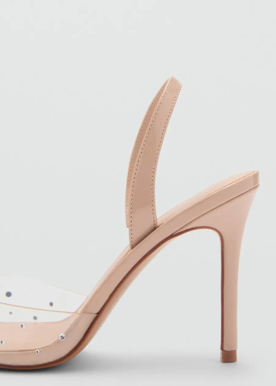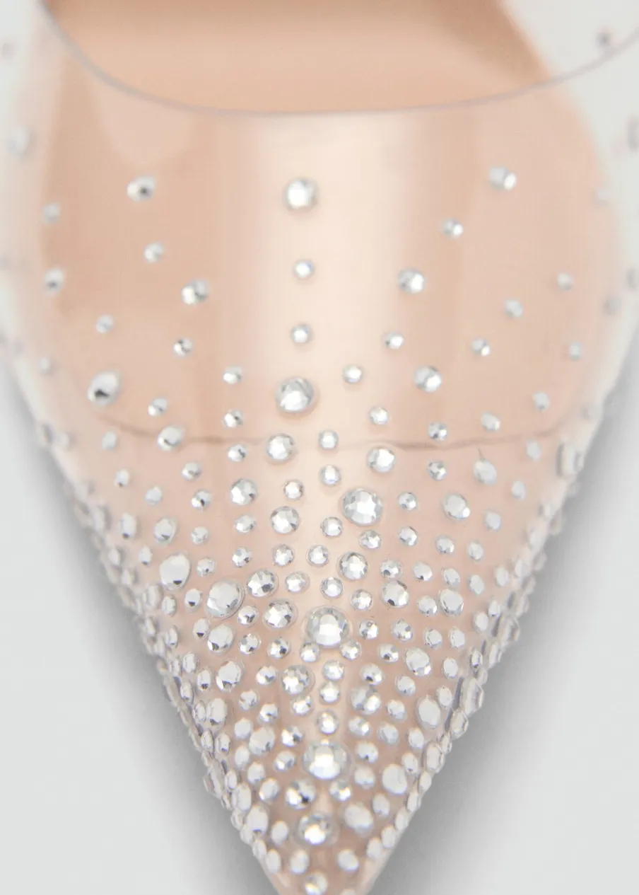 Obcas mierzy 9,5 cm. Wysoki obcas. Obcas szpilka. Spiczaste zakończenie. Bez zapięcia. Detal strass. 7,5 cm.