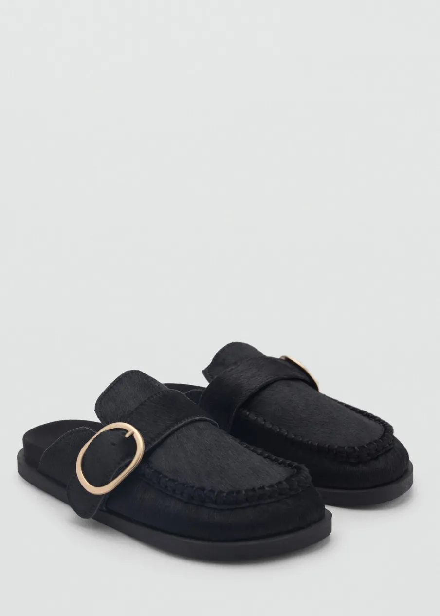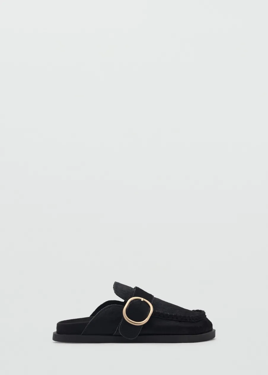 Opis100% skóra bydlęca. Płaska podeszwa. Futro. Okrągły nosek. Regulowana klamerka.