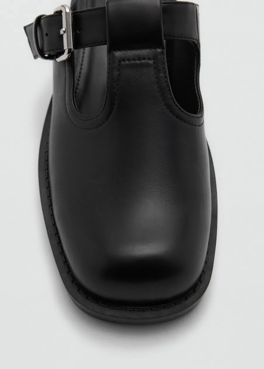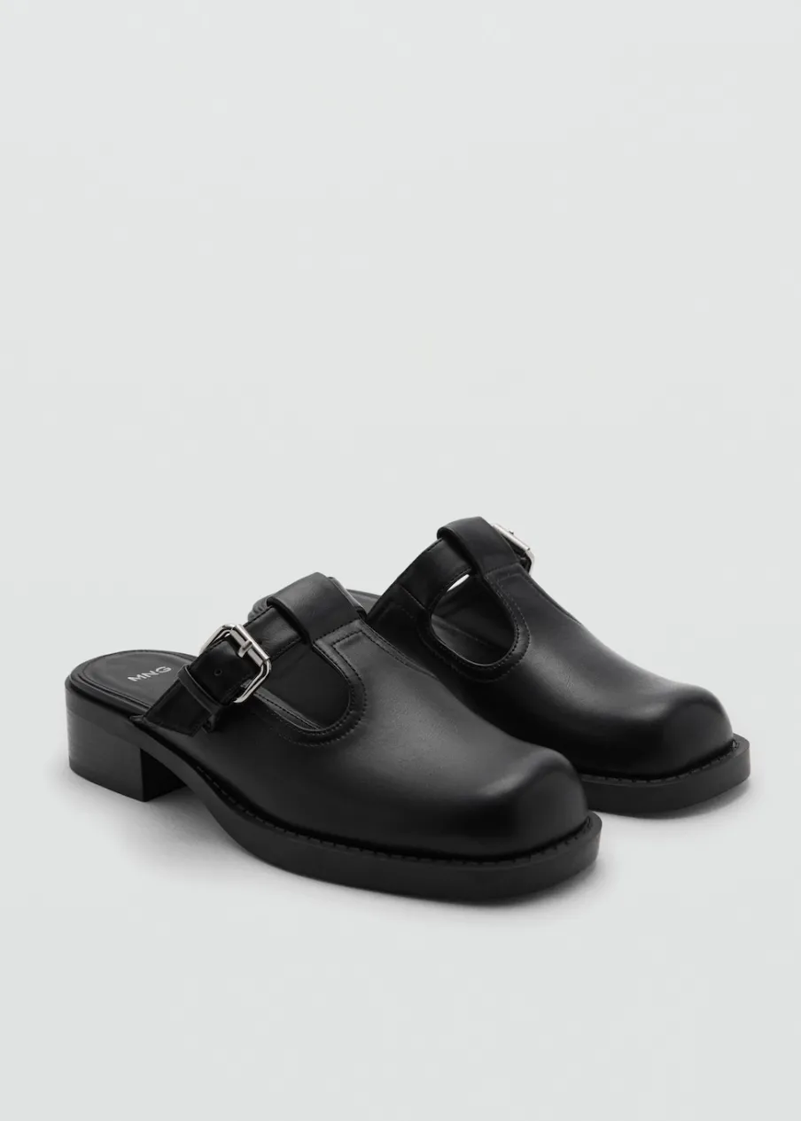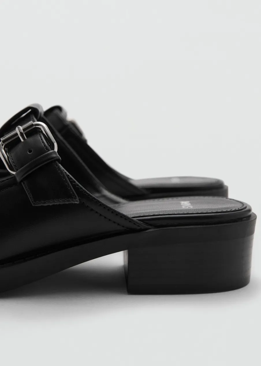 Fason z odkrytą piętą. Kwadratowy nosek. Płaska podeszwa. Bez zapięcia. Ozdobna klamra. Wyłącznie online. Typu mule.