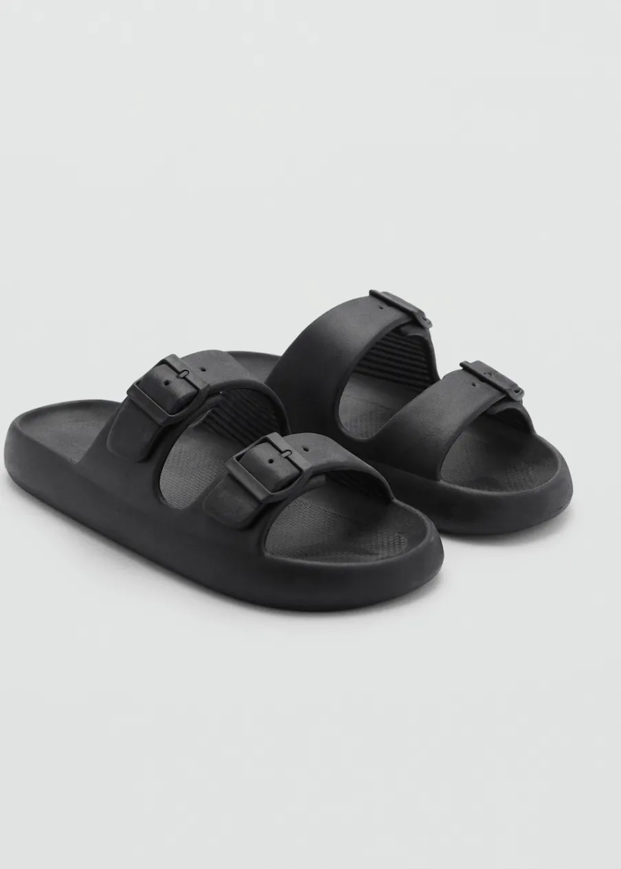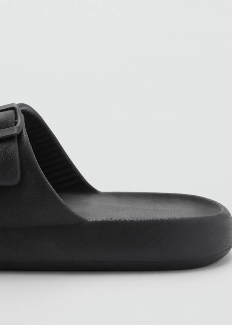 Klapki. Zapięcie na podwójną sprzączkę. Regulowane paski mocujące. Wierzch z gumy. Okrągły nosek. Gumowa podeszwa.