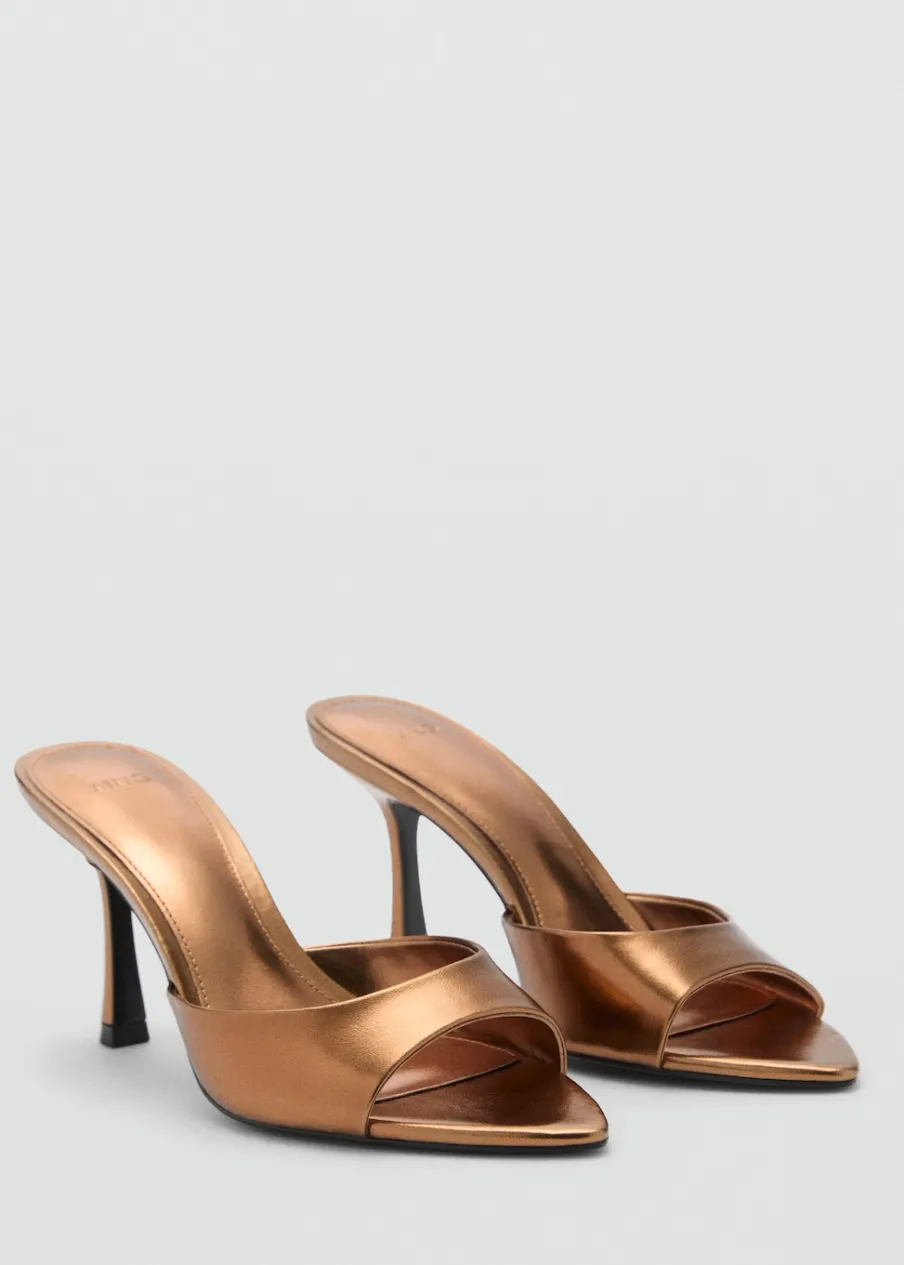 OpisMetaliczny efekt. Fason z odkrytą piętą. Rozporek z przodu. Obcas szpilka. Bez zapięcia. Obcas mierzy 8 cm. Wewn…