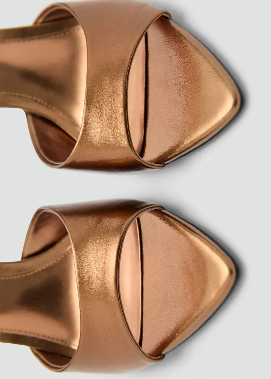 Metaliczny efekt. Fason z odkrytą piętą. Rozporek z przodu. Obcas szpilka. Bez zapięcia. Obcas mierzy 8 cm. Wewnętrzna podszewka.