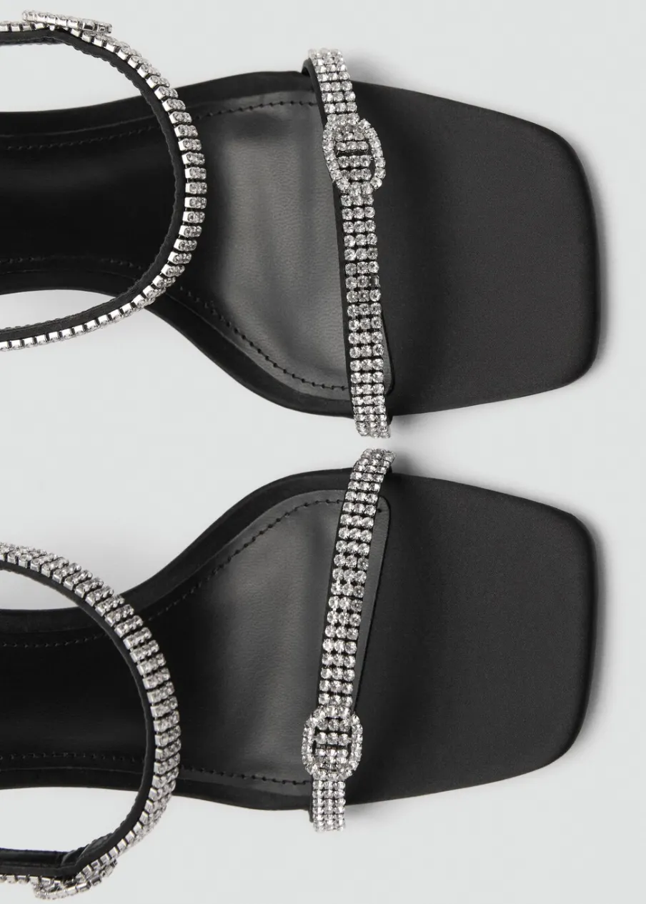 Model z paskami. Rozporek z przodu. Kwadratowy nosek. Obcas mierzy 10 cm. Detal strass. Bez zapięcia.