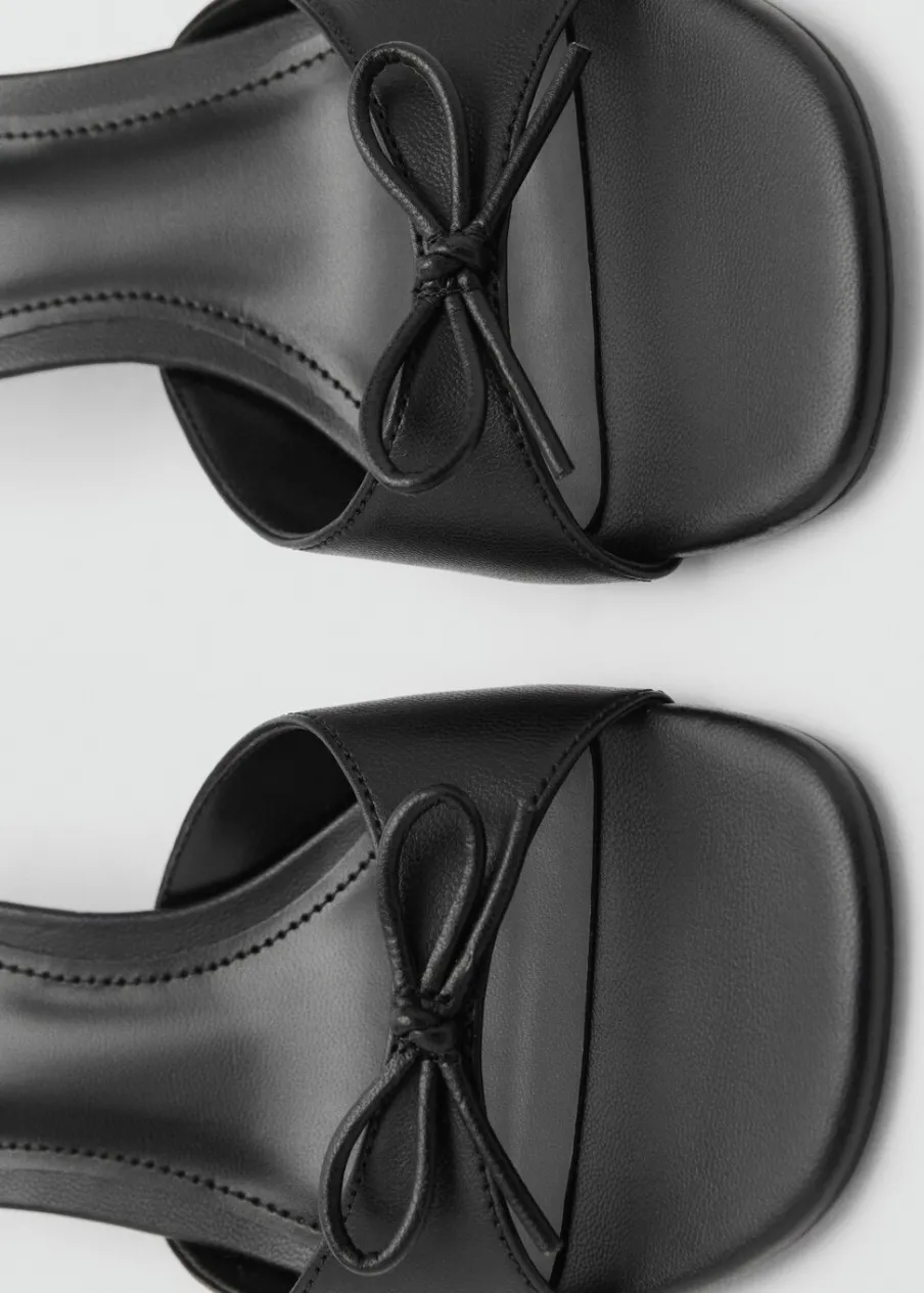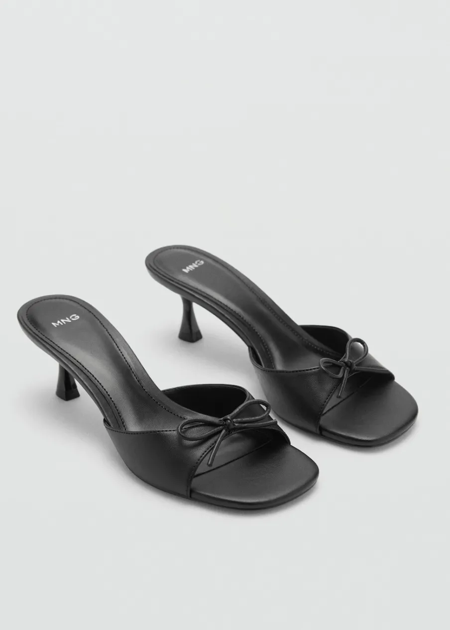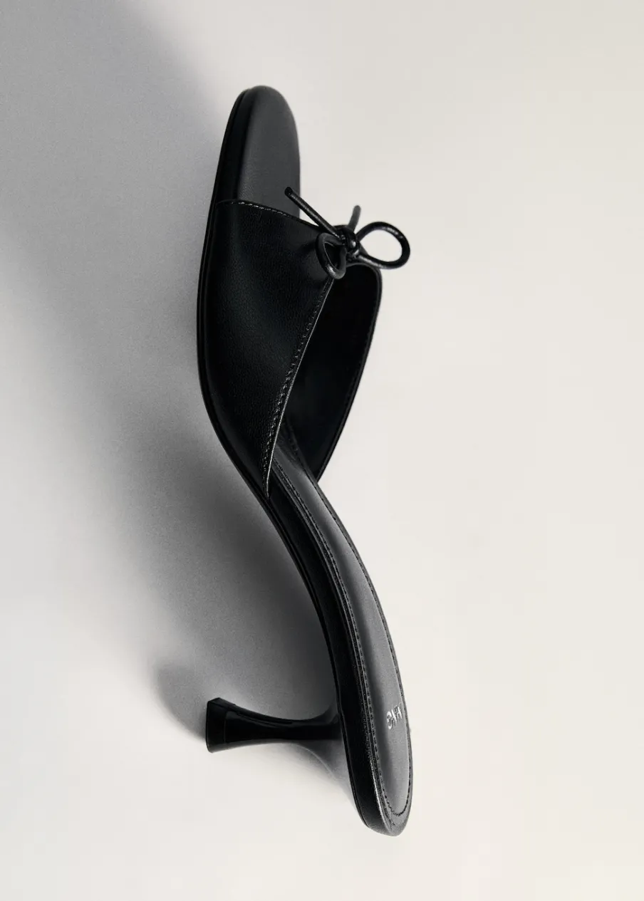 Fason z odkrytą piętą. Rozporek z przodu. Kwadratowy nosek. Obcas typu kitten. Obcas mierzy 6,5 cm. Bez zapięcia. Ozdobna kokardka.