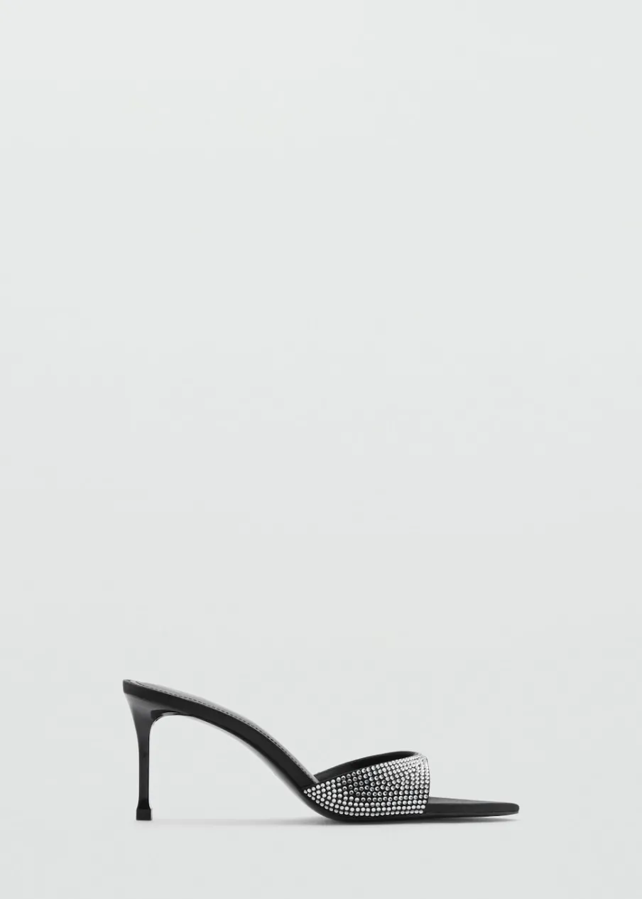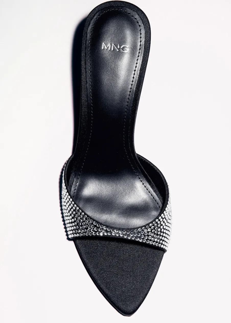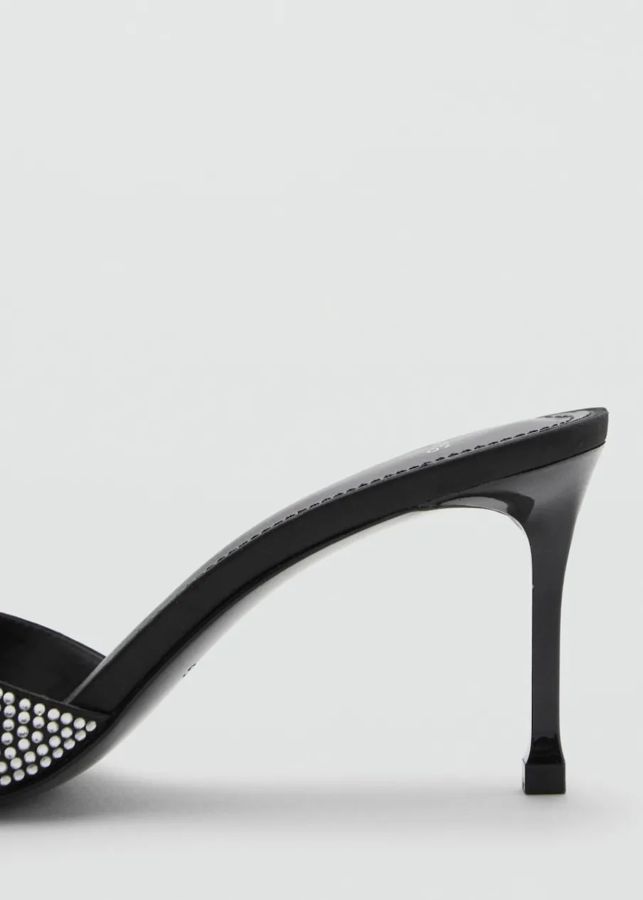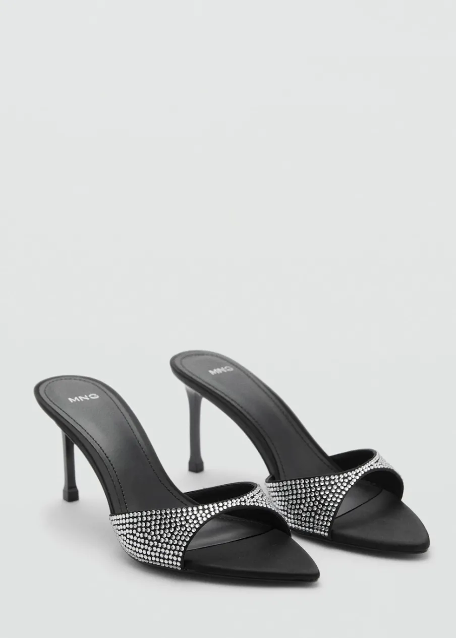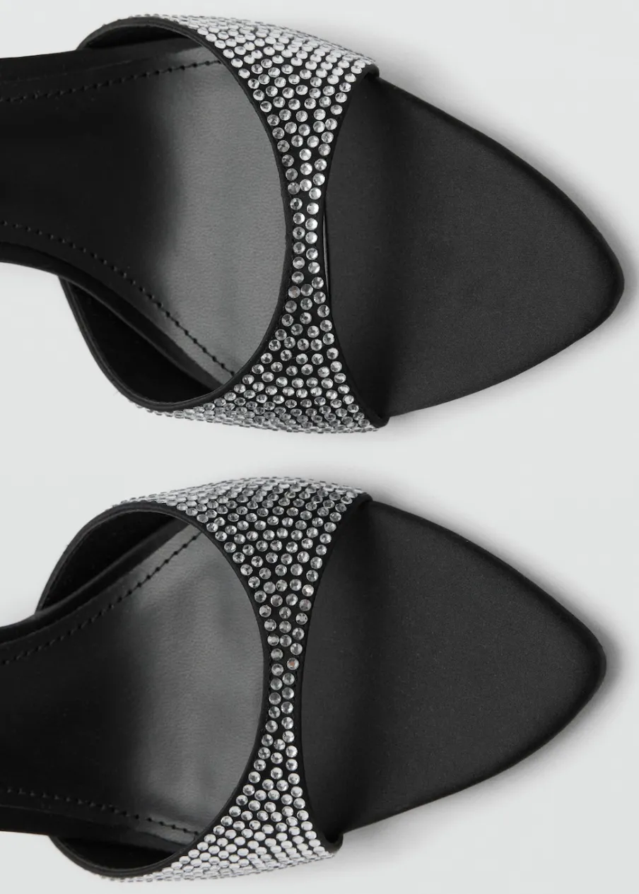 Rozporek z przodu. Obcas szpilka. Obcas mierzy 7,5 cm. Bez zapięcia. Ozdoba z kryształków strass. Model z odkrytą piętą.