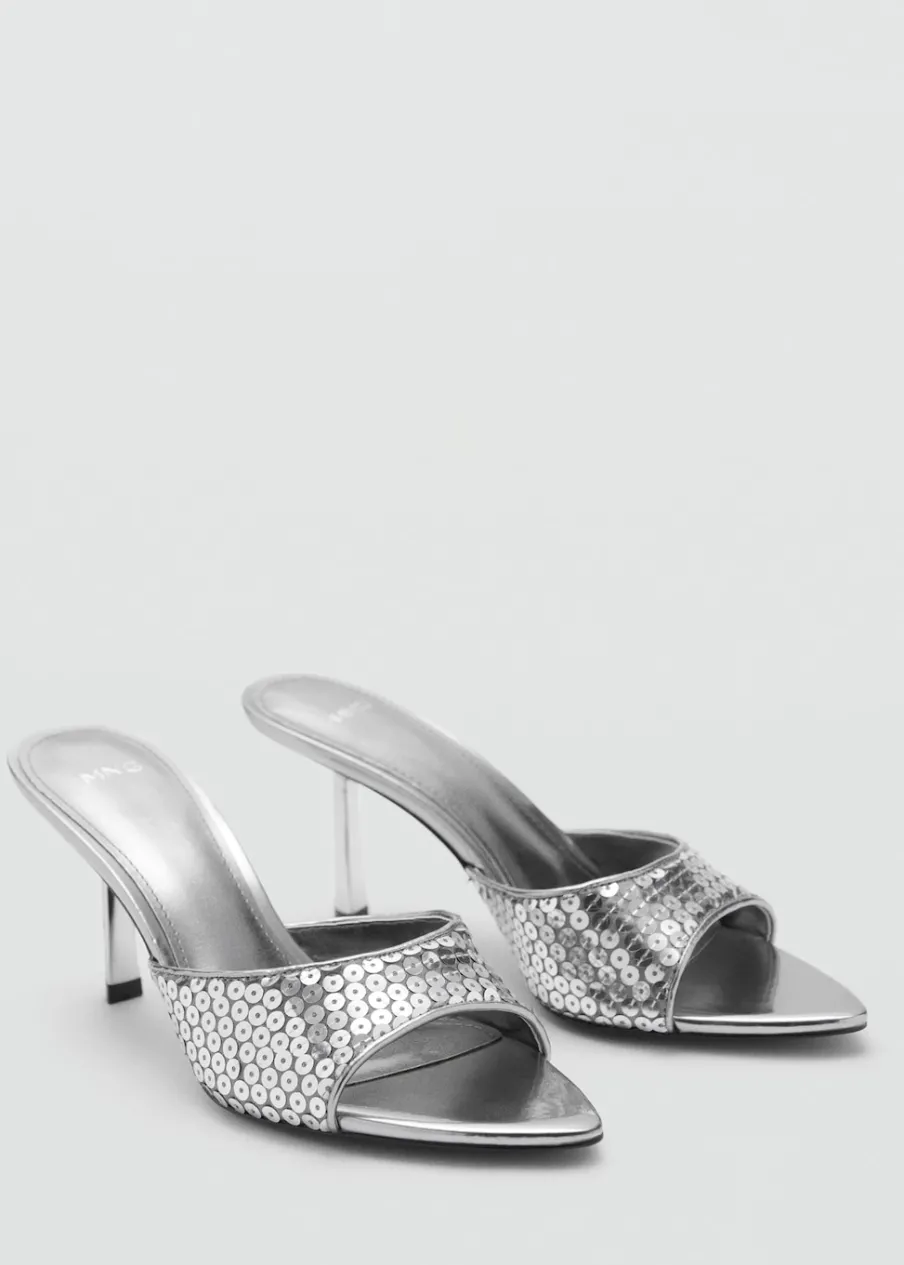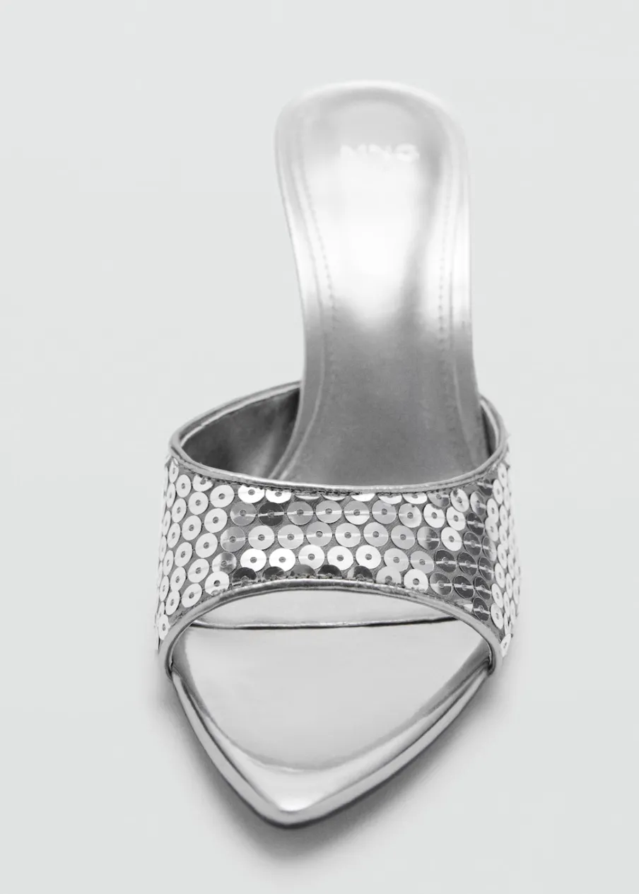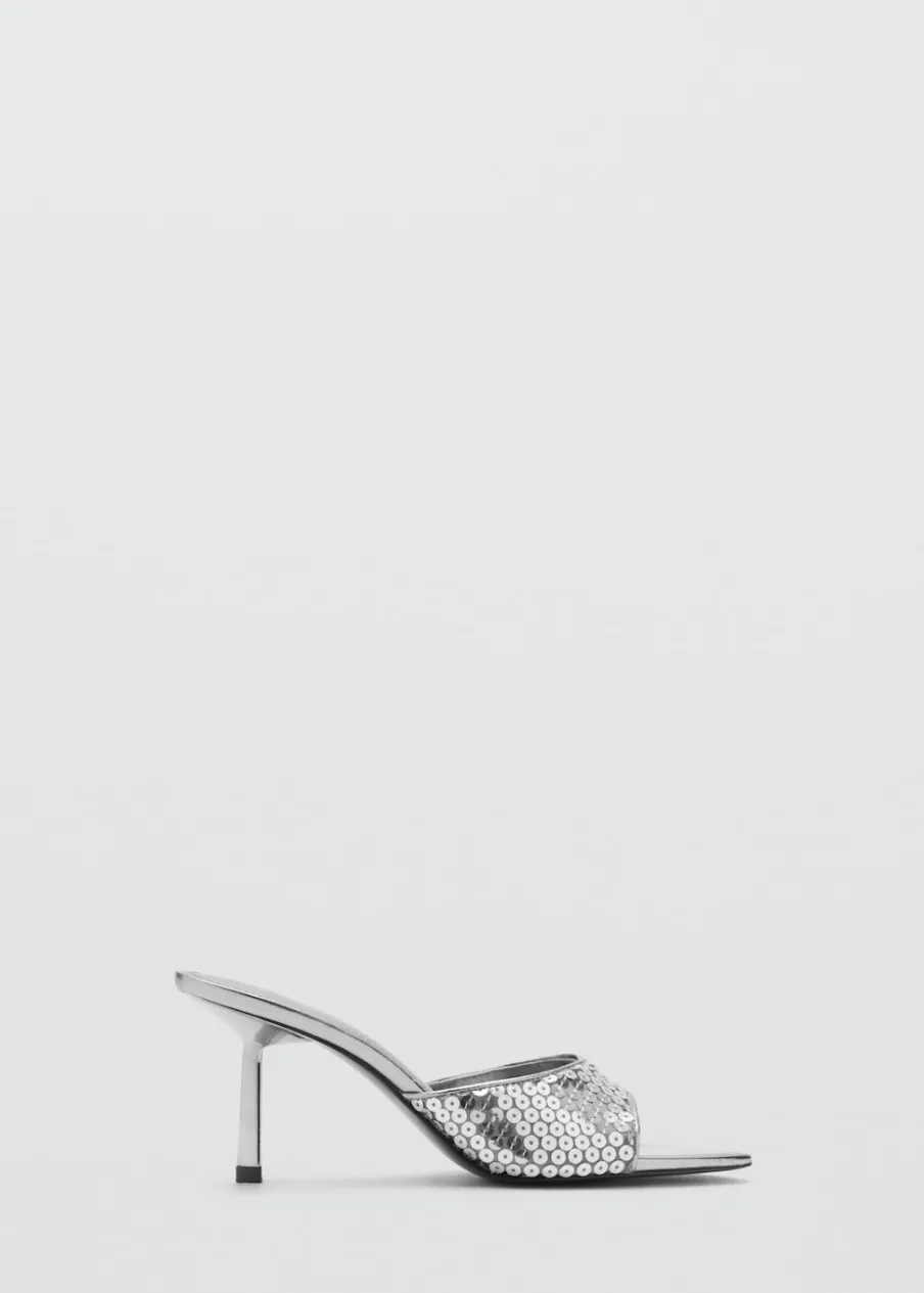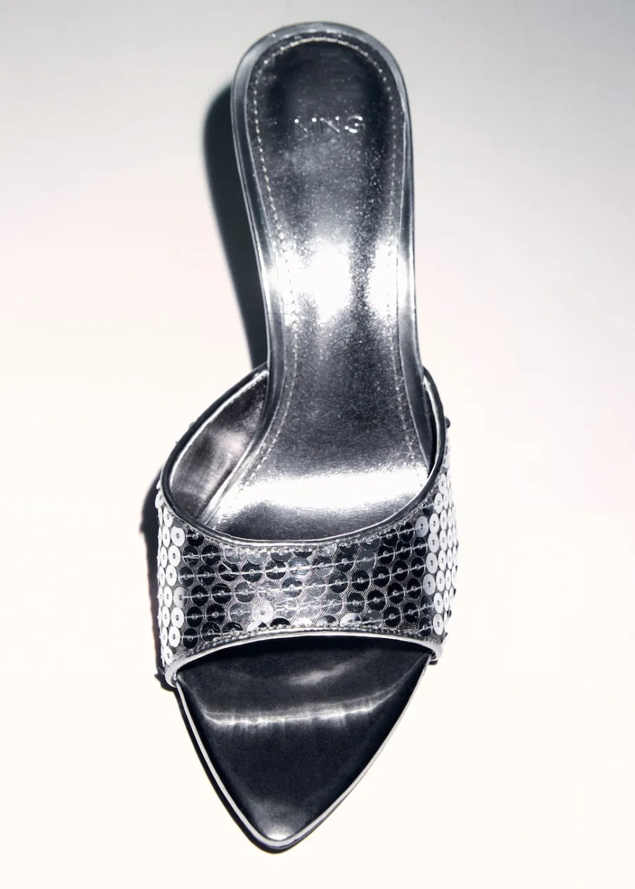 OpisFason z odkrytą piętą. Rozporek z przodu. Obcas mierzy 8 cm. Bez zapięcia. Detal z cekinów. Tylko podszewka.