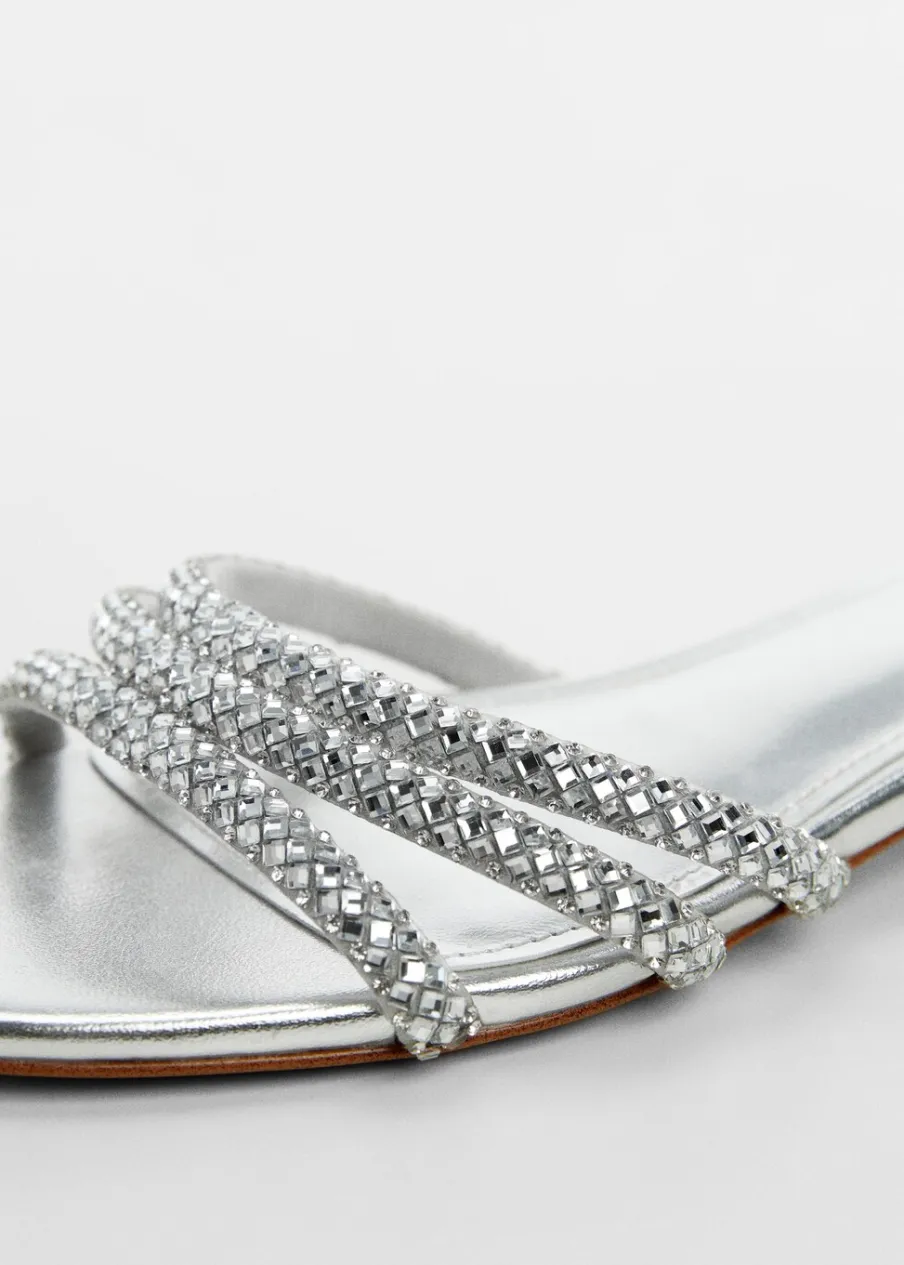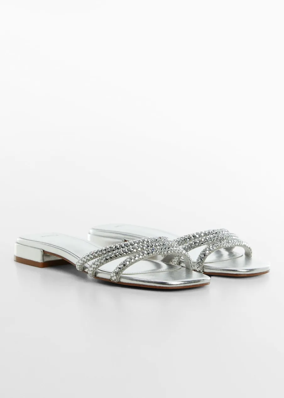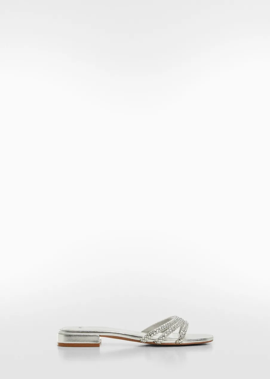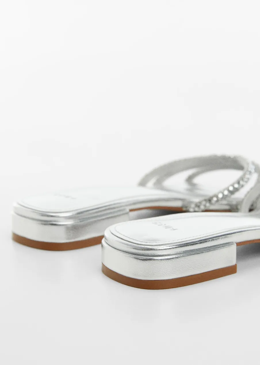 OpisMetaliczne wykończenie. Kwadratowy nosek. Model z paskami. Bez zapięcia. Aplikacja z kryształków.