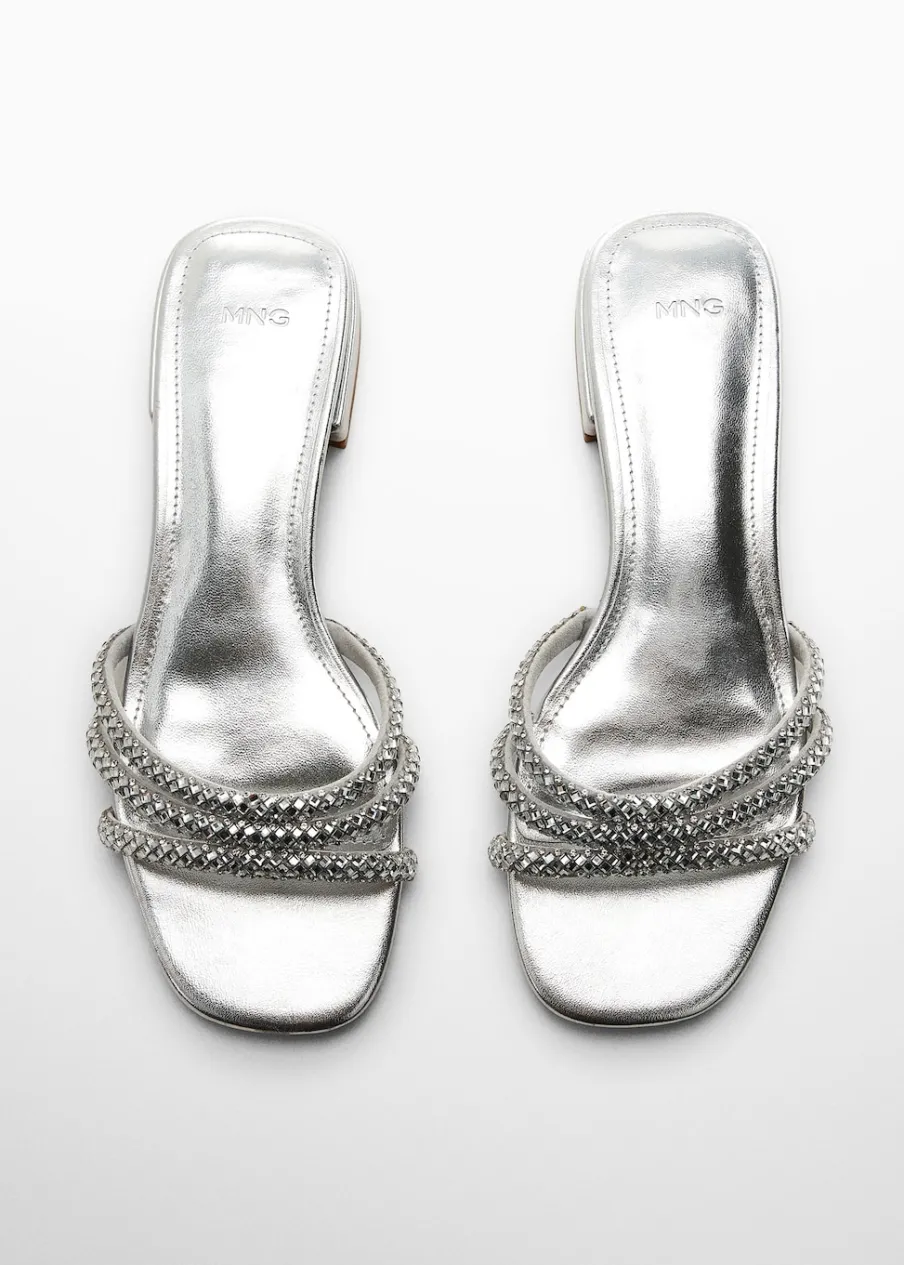 Metaliczne wykończenie. Kwadratowy nosek. Model z paskami. Bez zapięcia. Aplikacja z kryształków.