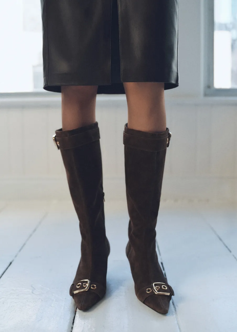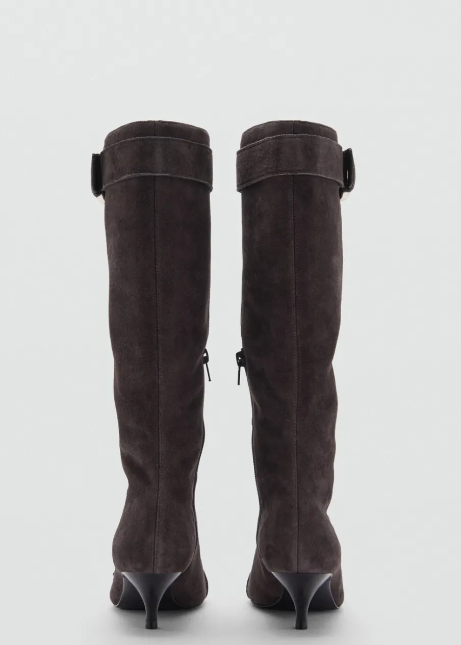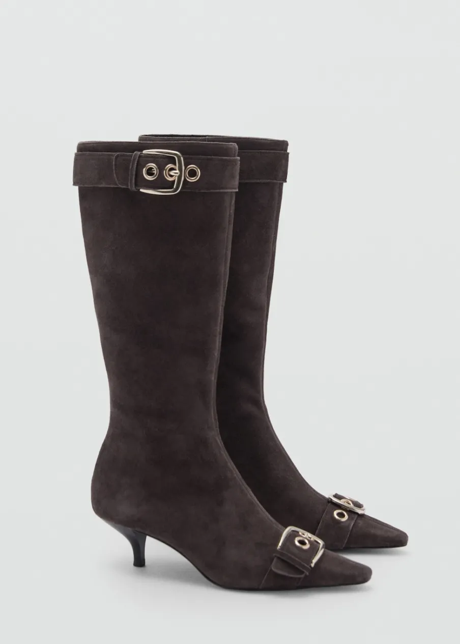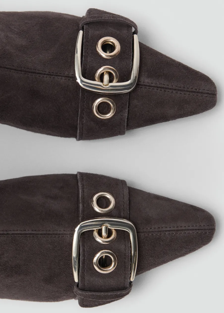 Skóra kozia. Dwoina skórzana. Obcas typu kitten. Spiczaste zakończenie. Obcas mierzy 4 cm. Zapięcie na zamek z boku. Ozdobne klamry. Wewnętrzna podszewka.