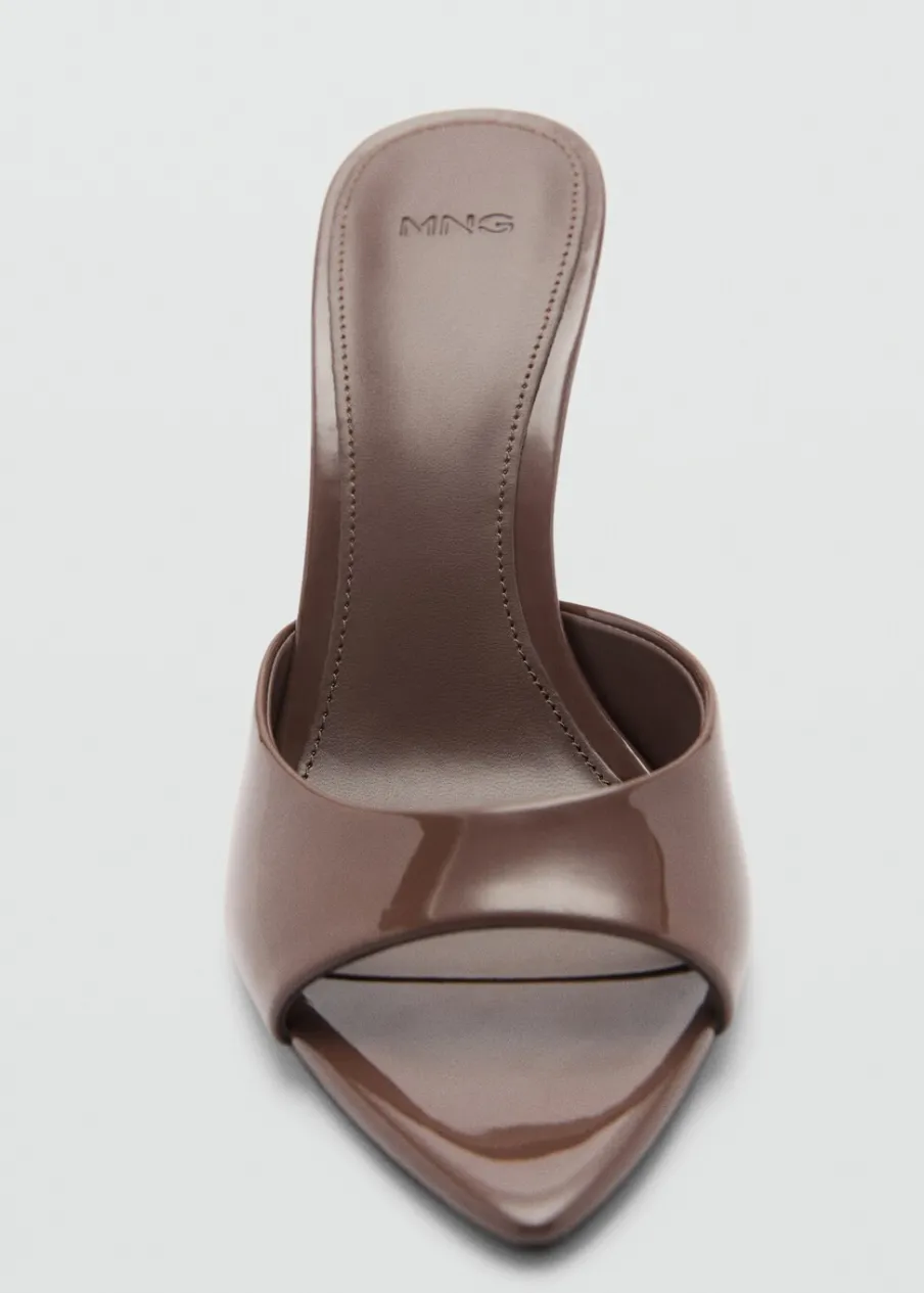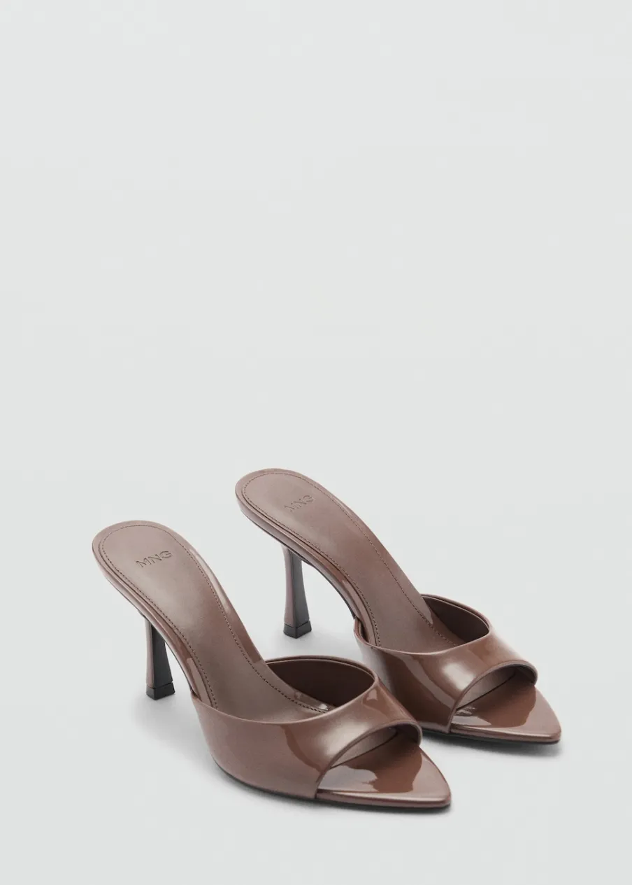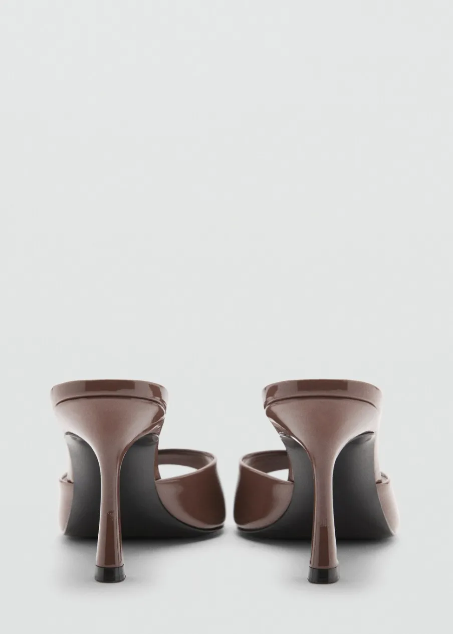 Imitacja lakierowanej skóry. Fason z odkrytą piętą. Rozporek z przodu. Obcas szpilka. Bez zapięcia. Obcas mierzy 8 cm. Wewnętrzna podszewka.