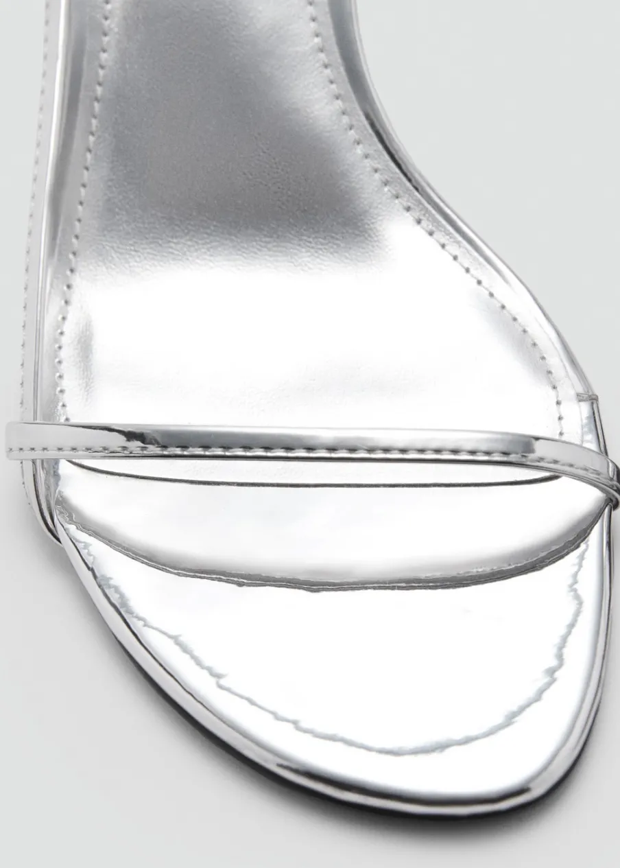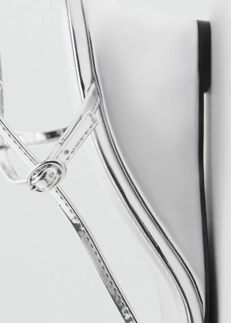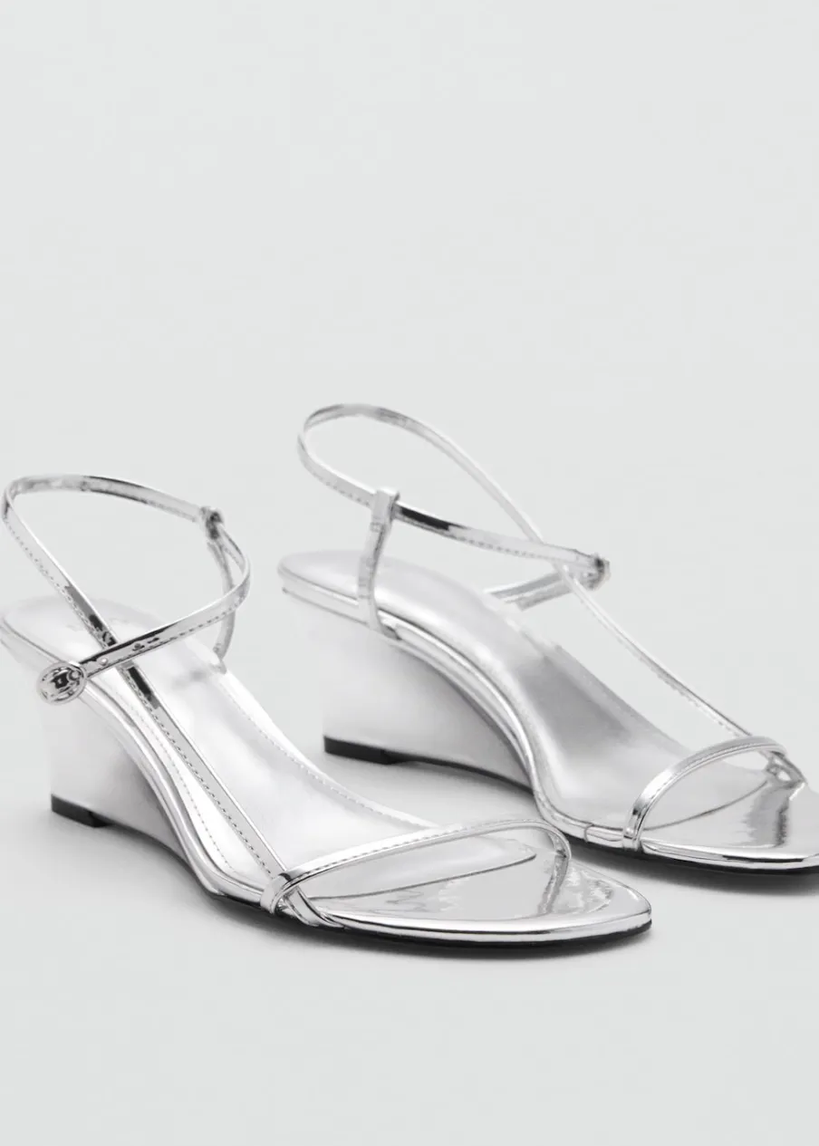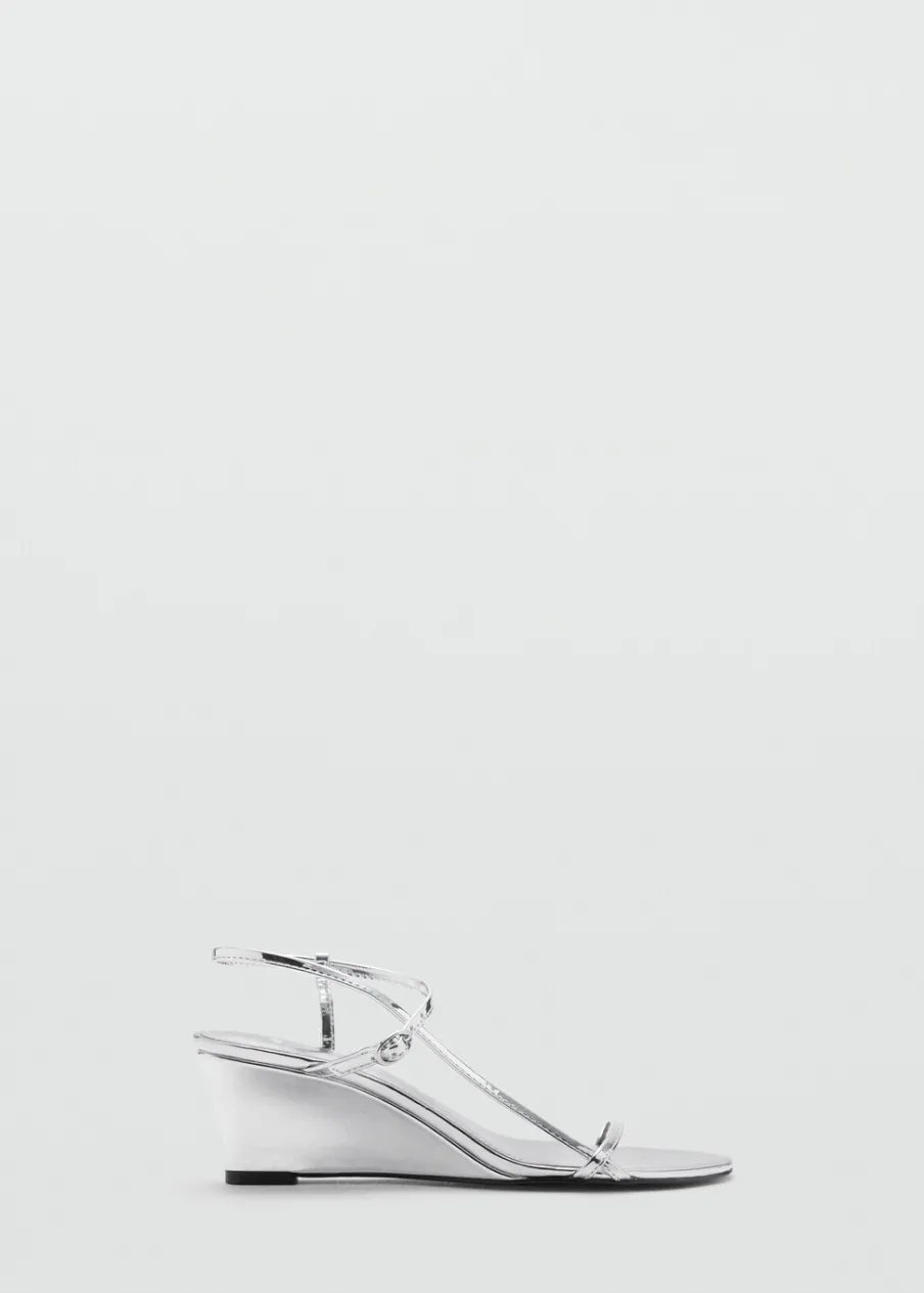 Metaliczny efekt. Model z paskami. Rozporek z przodu. Koturn. Zapięcie na klamrę. Obcas mierzy 6 cm. Wyłącznie online.