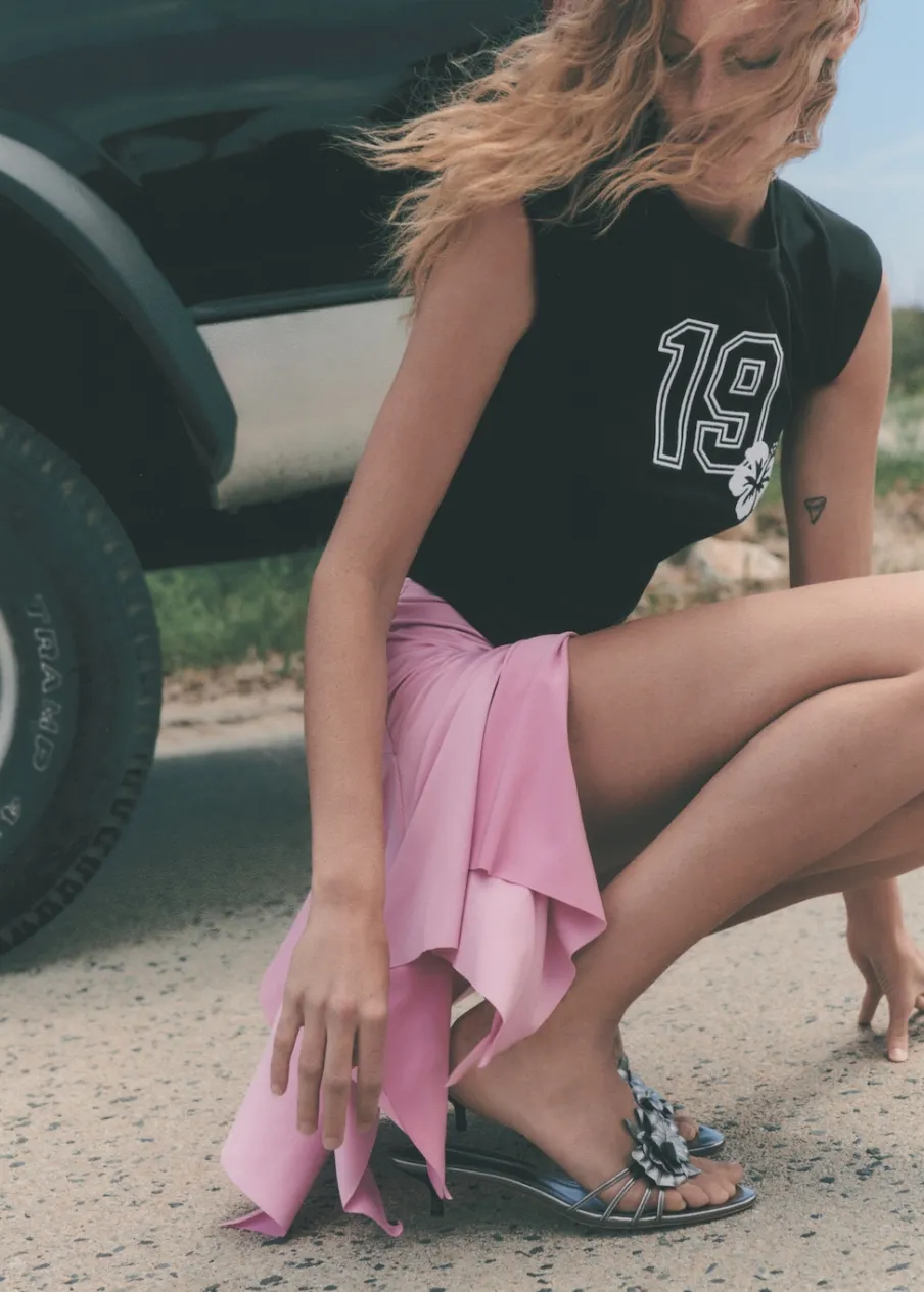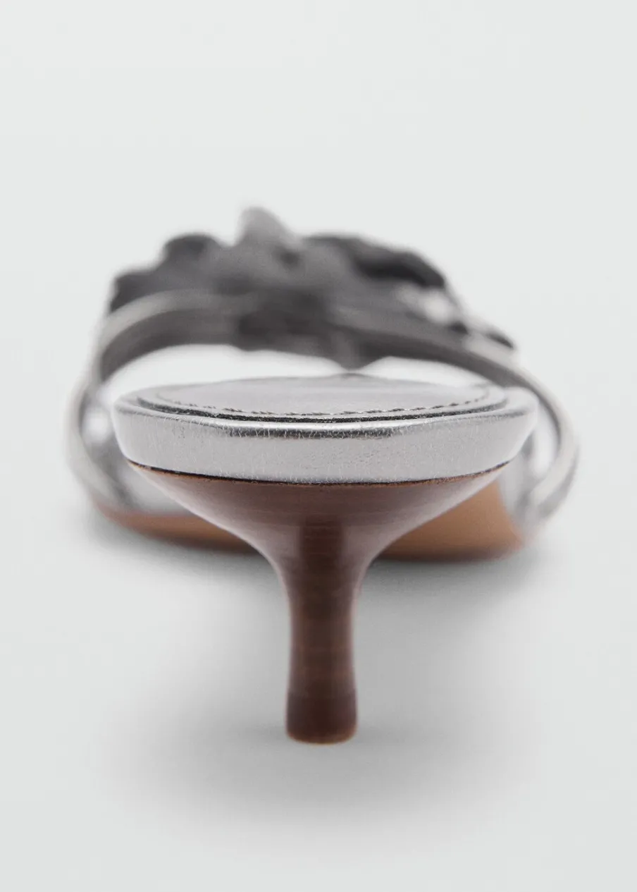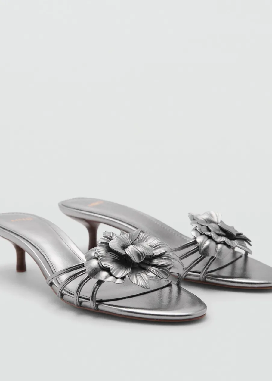 Model z paskami. Rozporek z przodu. Okrągły nosek. Bez pięt. Obcas typu kitten. Obcas mierzy 5 cm. Bez zapięcia. Kwiatowa ozdoba.
