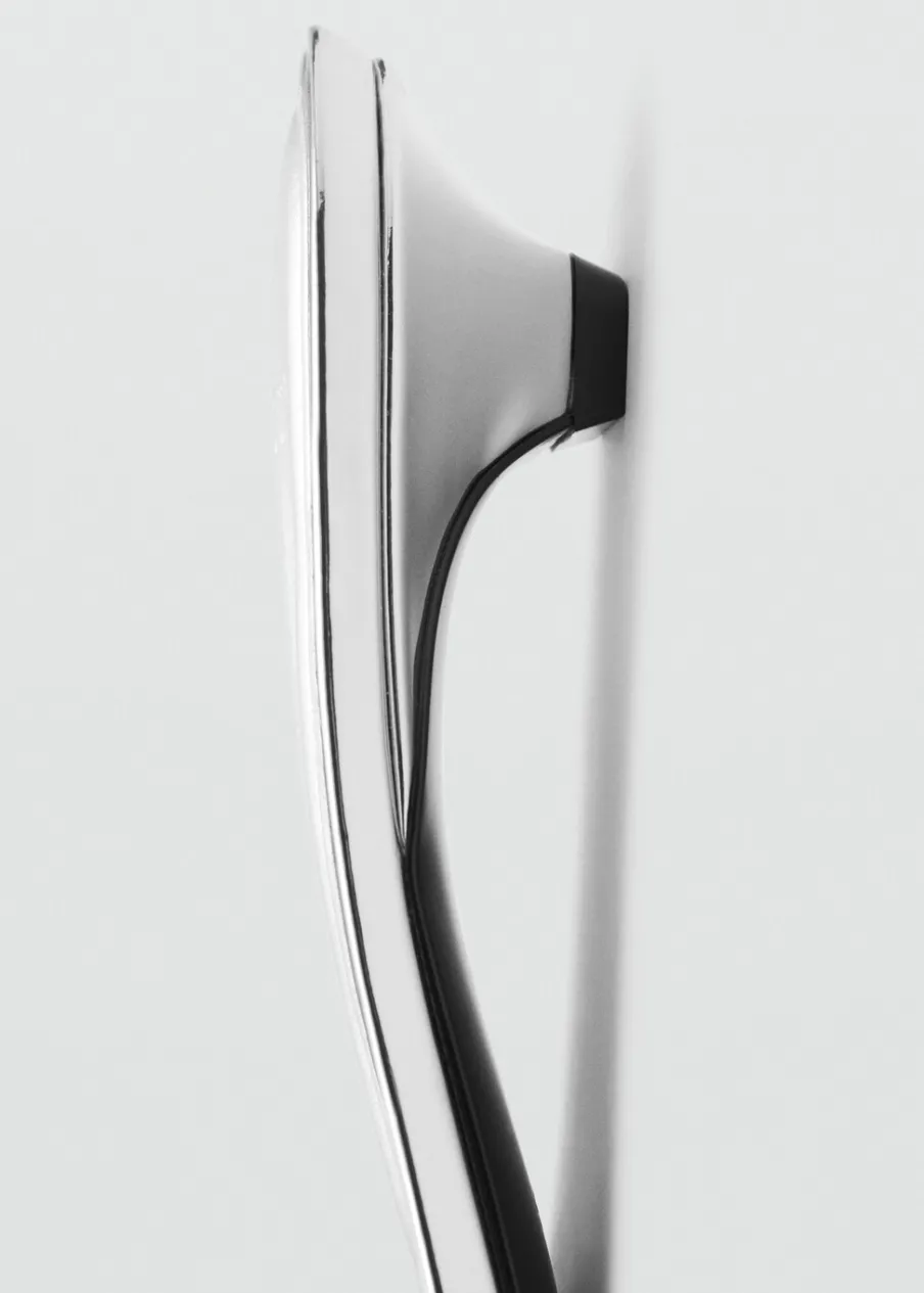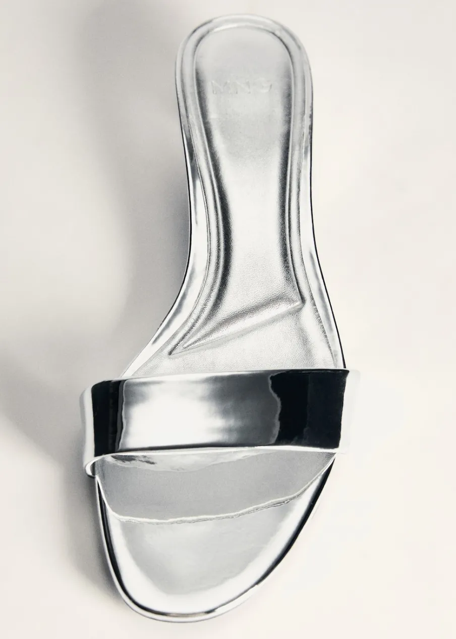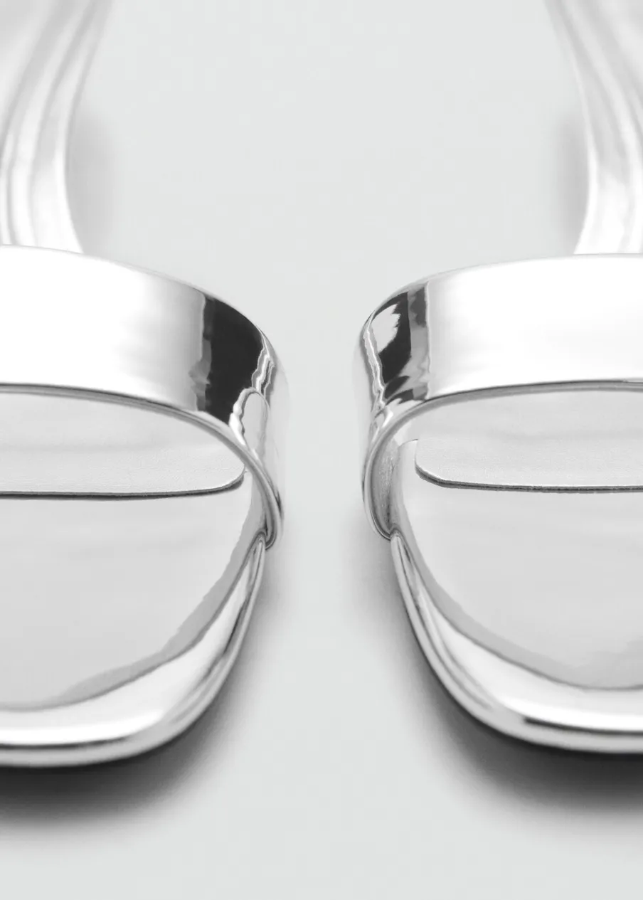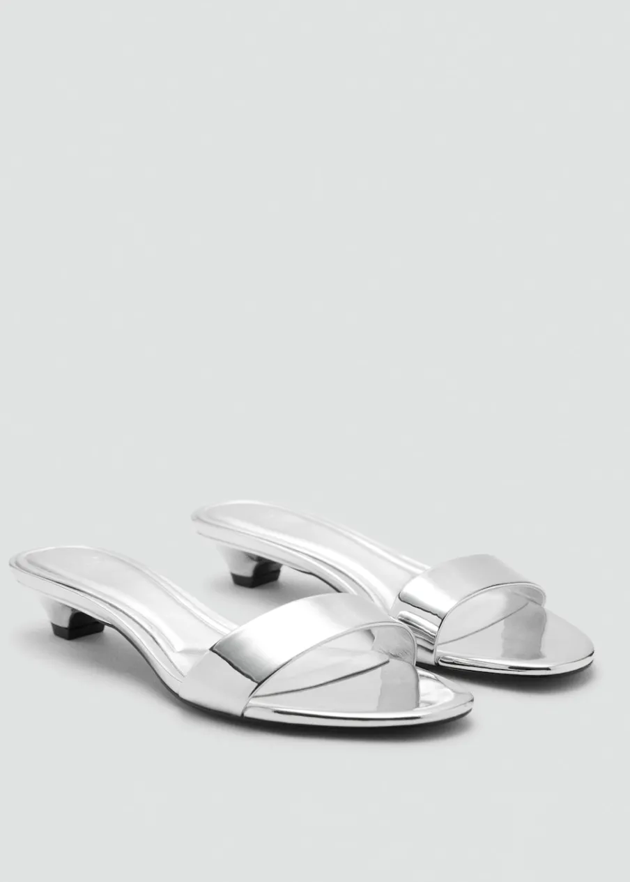 Metaliczny efekt. Fason z odkrytą piętą. Model z paskami. Rozporek z przodu. Kwadratowy nosek. Obcas typu kitten. Bez zapięcia. Wewnętrzna podszewka. Wysokość obcasa 3 cm.