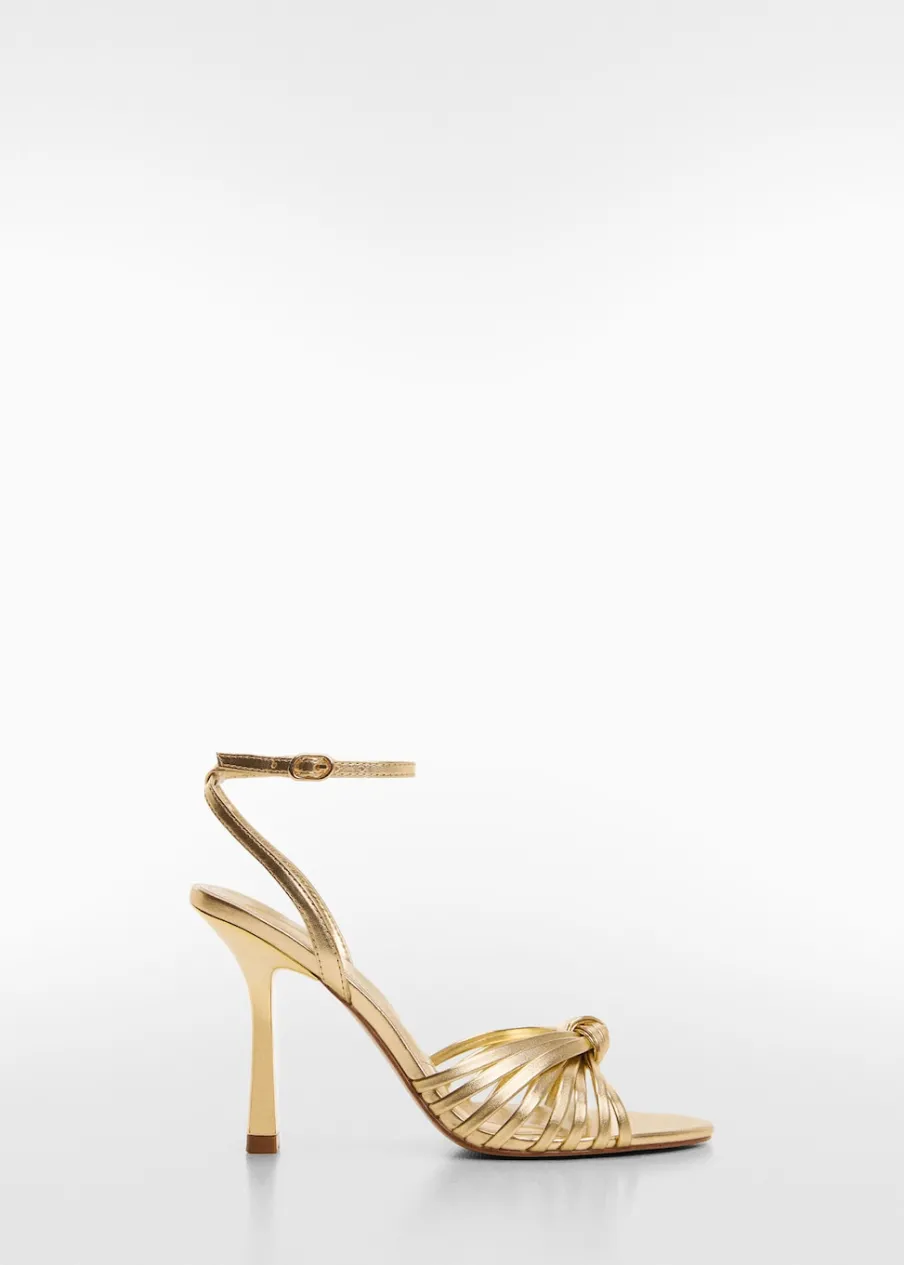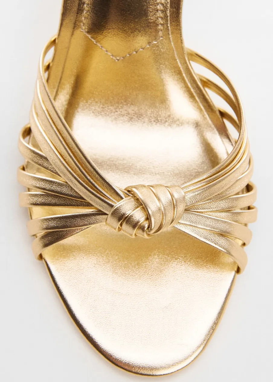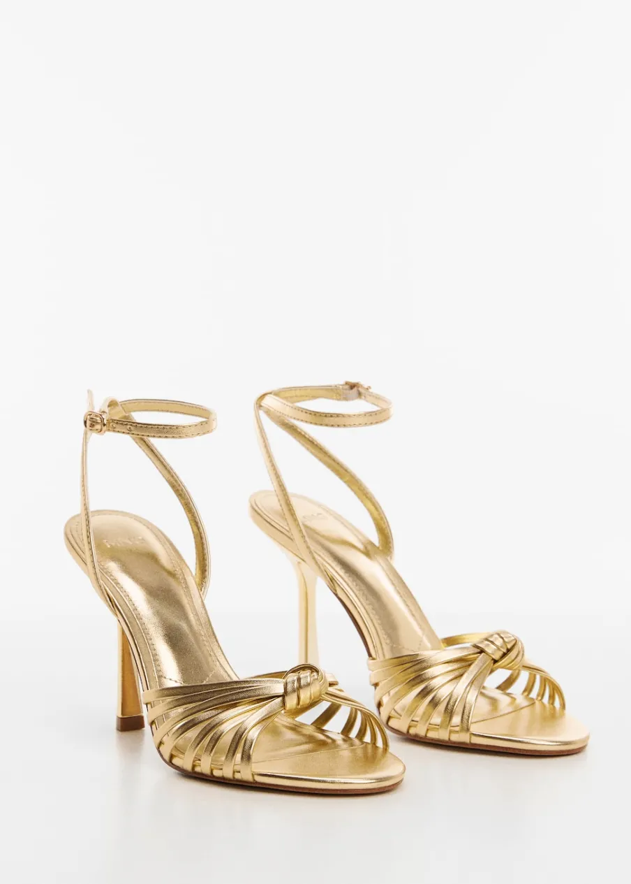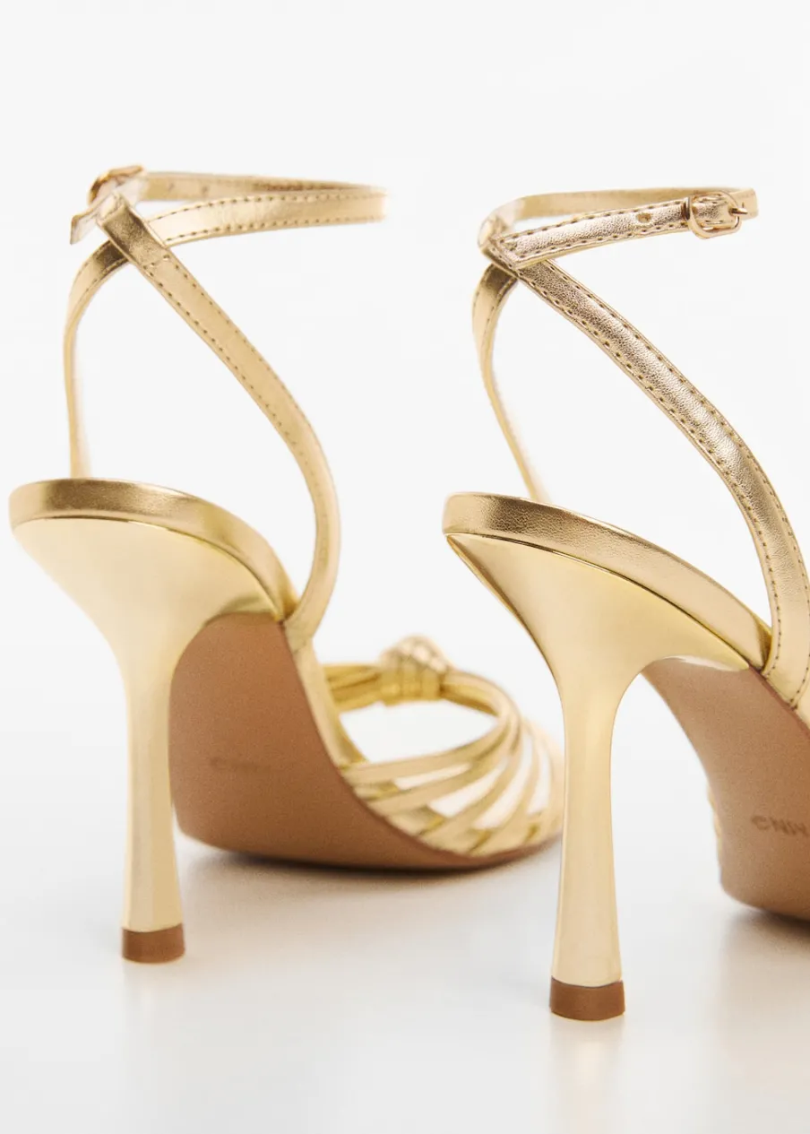 Metaliczne wykończenie. Model z paskami. Obcas lejkowy. Okrągły nosek. Pasek wokół kostki. Zapięcie na klamrę. Ozdobny węzeł. Wewnętrzna podszewka. Obcas mierzy 9 cm. Kolekcja wizytowa.
