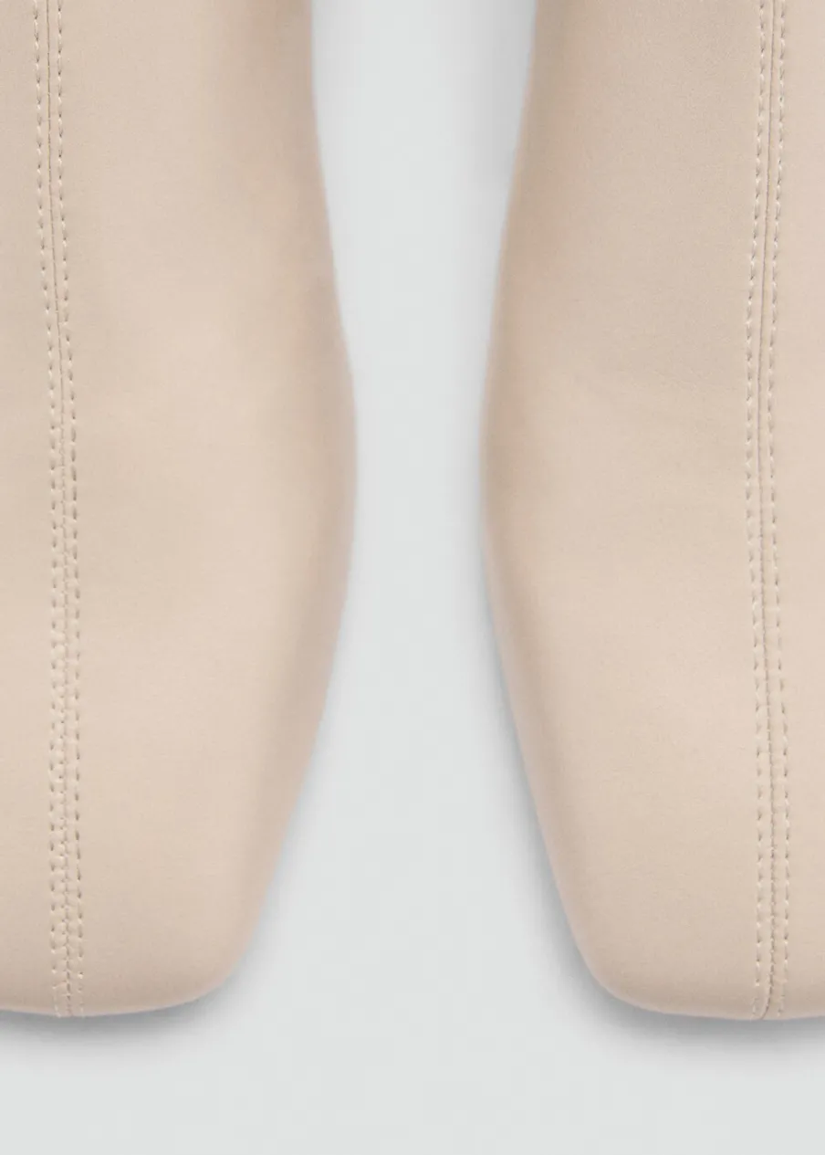 Okrągły nosek. Prostokątny obcas. Obcas mierzy 3,5 cm. Boczne zapięcie na suwak. Wewnętrzna podszewka. Wyłącznie online. Efekt skóry.
